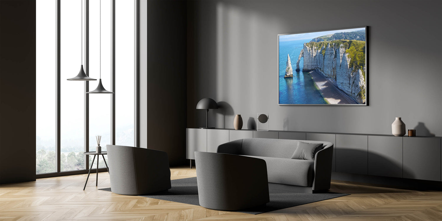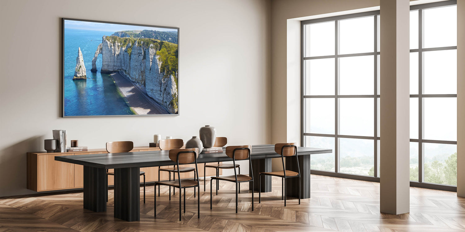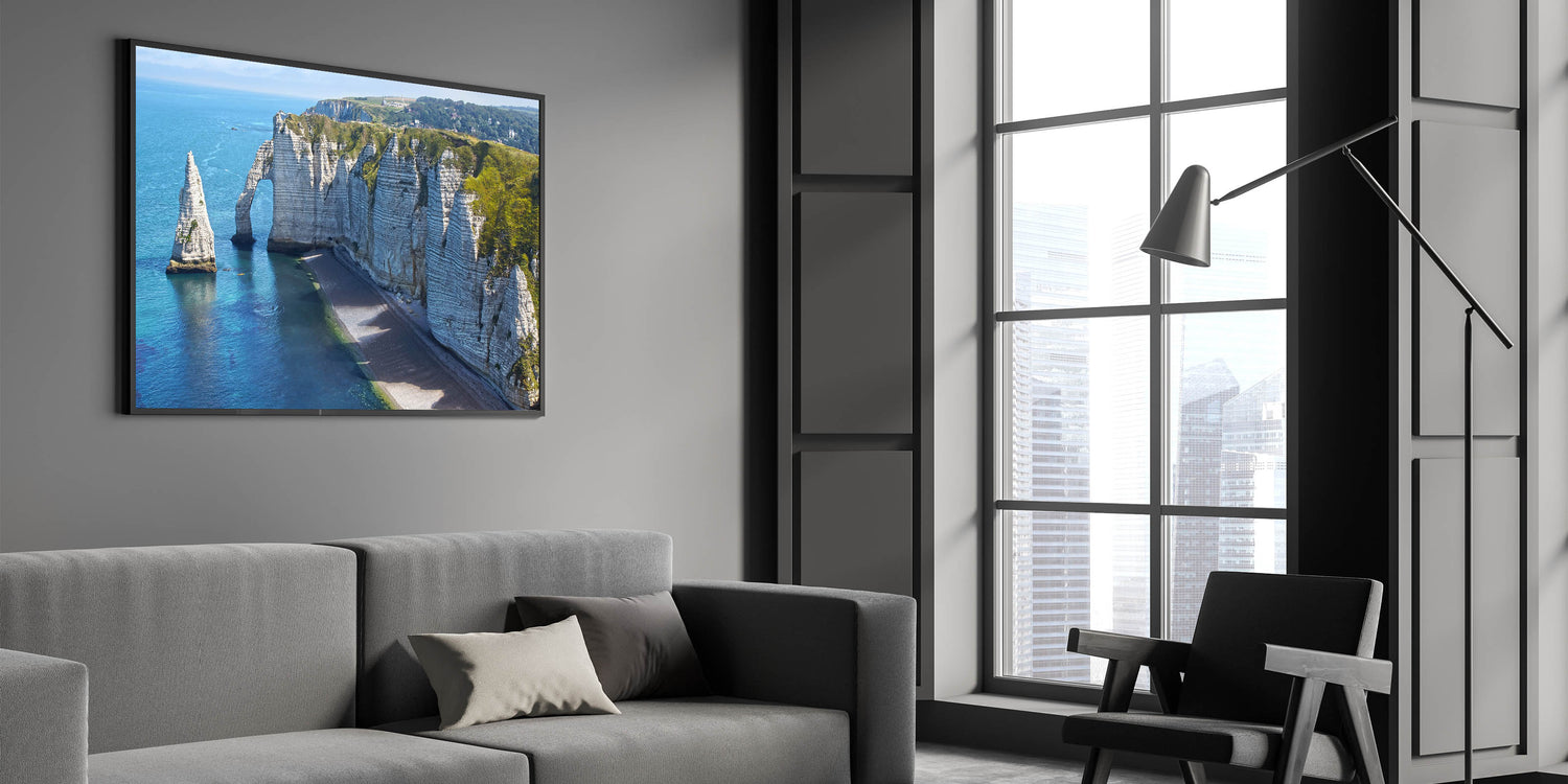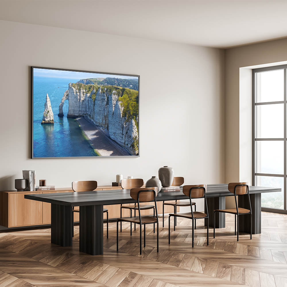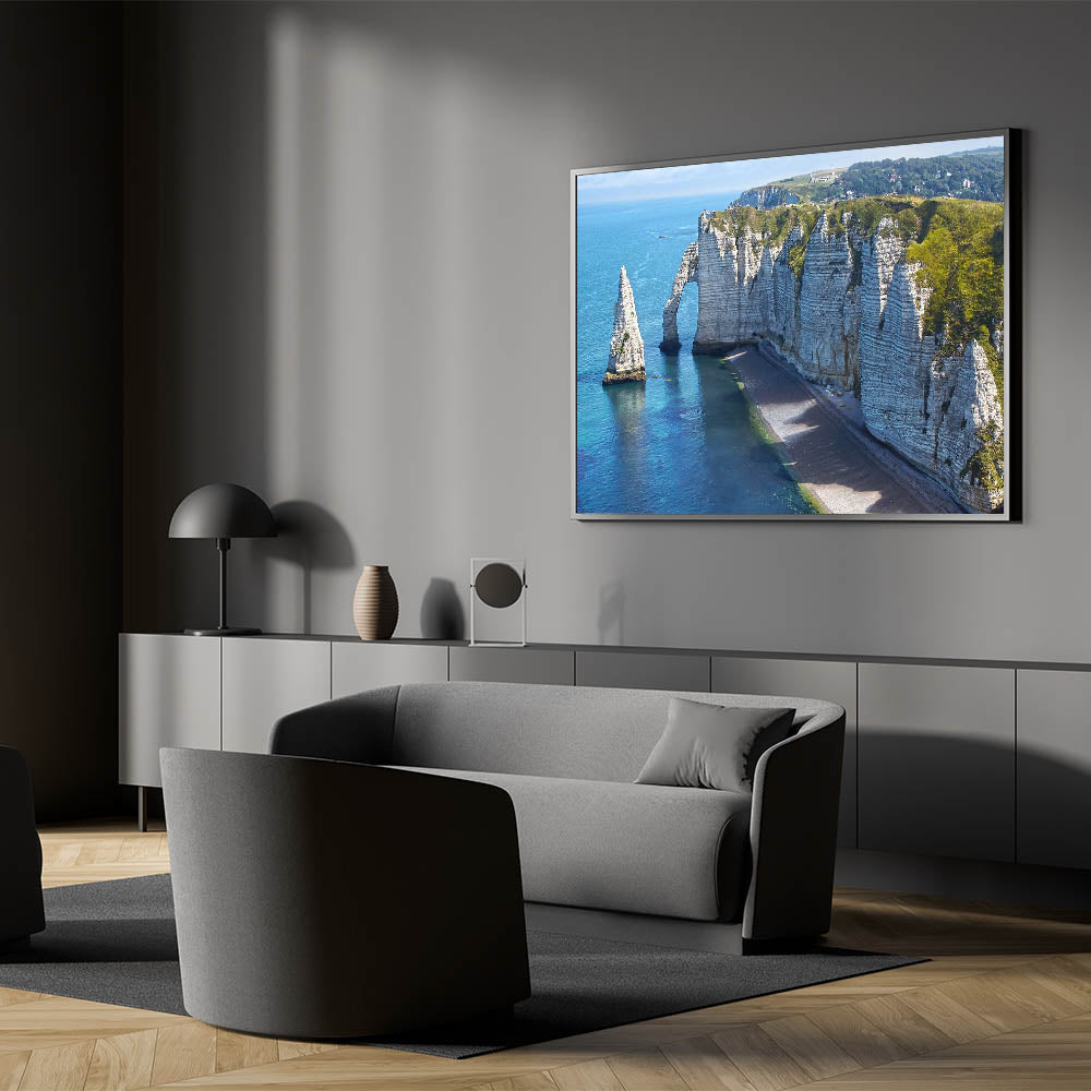 Bring the beauty of Normandy's scenic coastline into your home with this stunning wall art. Capturing the dramatic cliffs of Étretat, the artwork highlights the natural splendor of Normandy, France. The calm blue waters of the English Channel contrast with the towering rock formations, creating a serene yet majestic view that adds a peaceful atmosphere to any space.