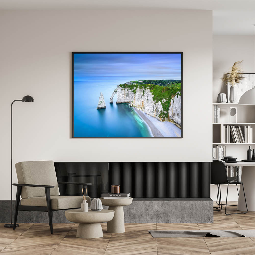 Immerse yourself in the captivating beauty of the Normandy coastline with this stunning wall art. This breathtaking scene features the iconic cliffs of Étretat, set against the calm, pristine blue waters. The majestic white cliffs, rolling green hills, and serene ocean create a soothing yet dramatic composition that is perfect for any living space.