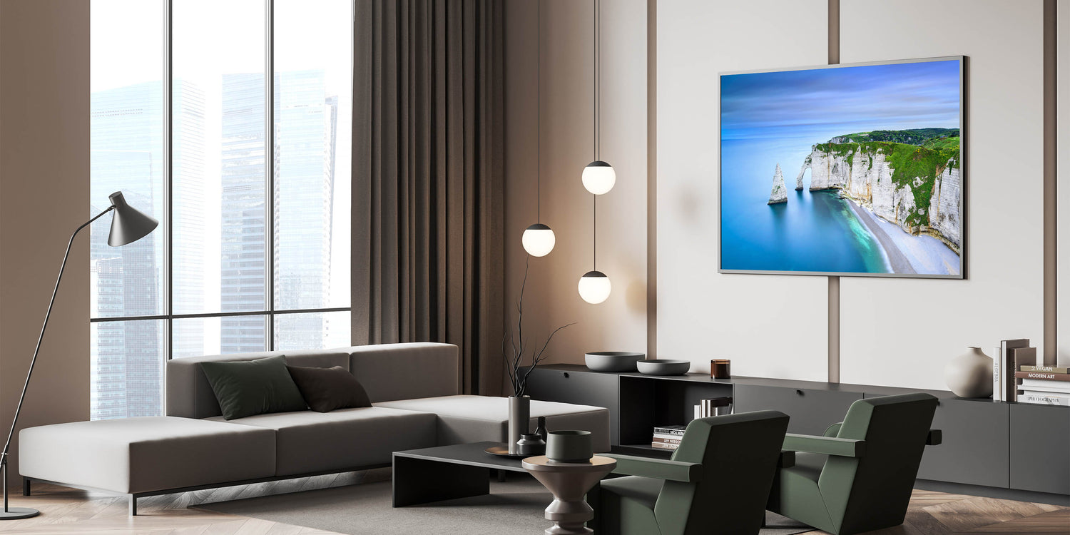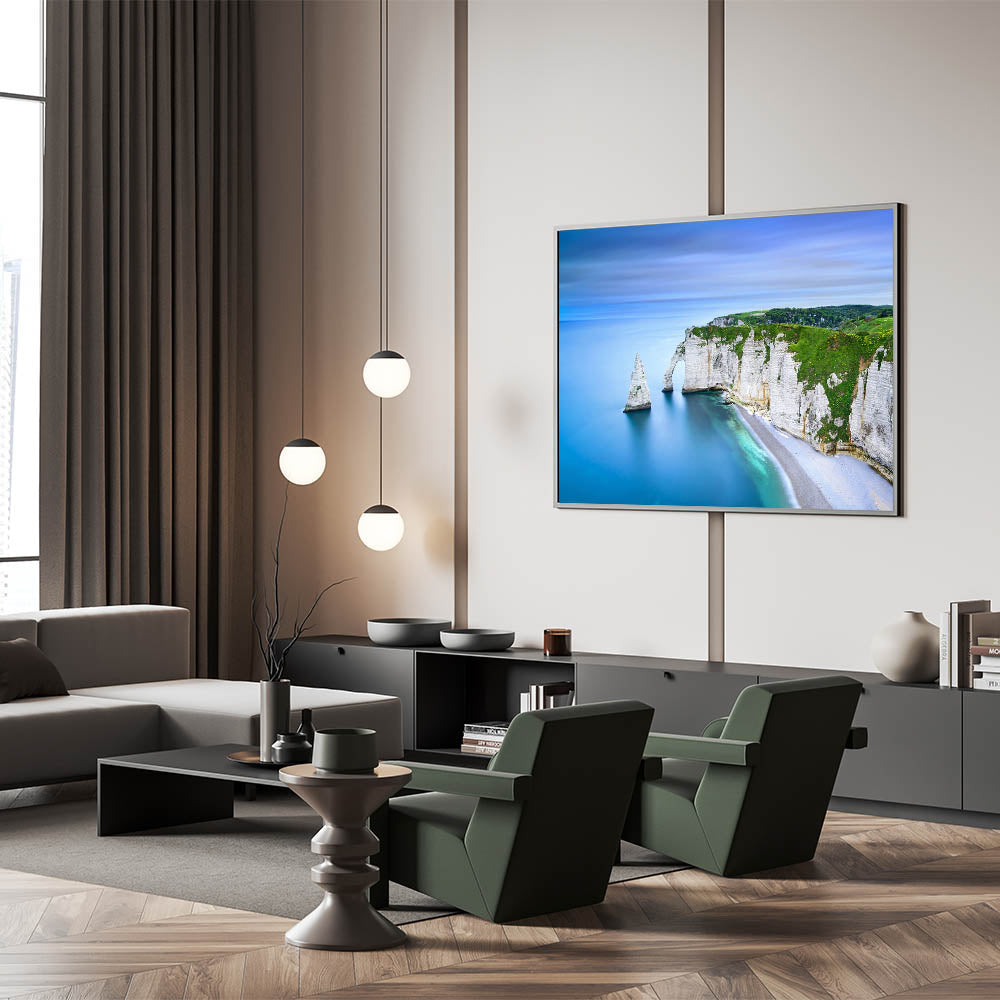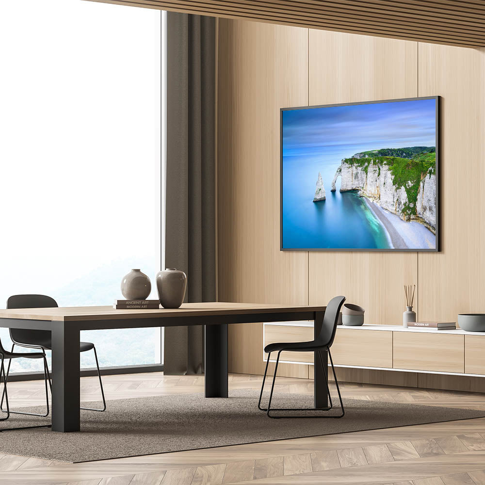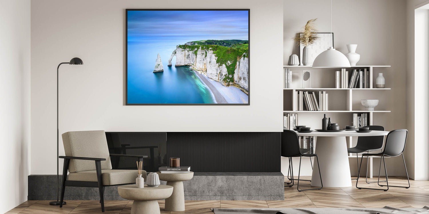 - High-quality Normandy wall art featuring a scenic view of the iconic cliffs and shoreline, available as stretched canvas, framed canvas, and acrylic glass.