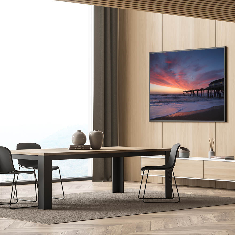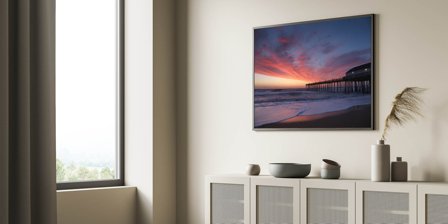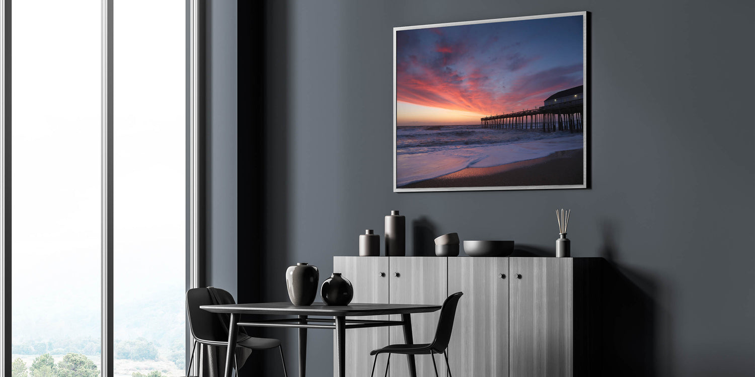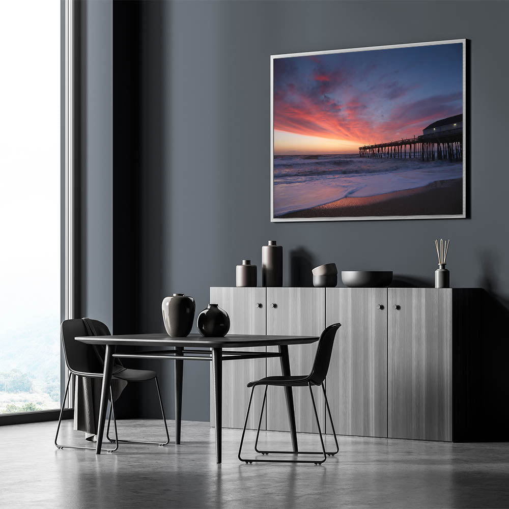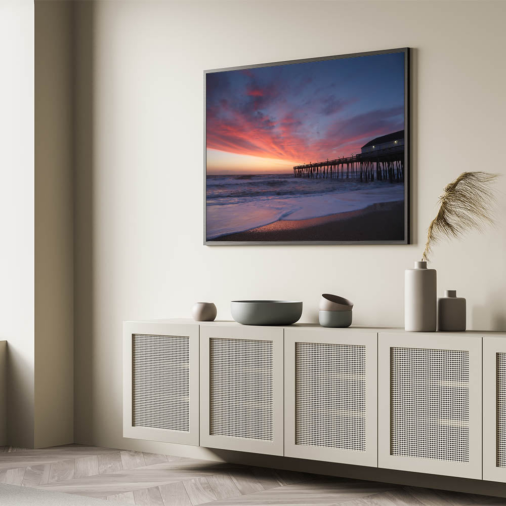 Experience the dramatic beauty of the Outer Banks with this stunning wall art featuring a vibrant sunset over the pier. The rich, vivid colors of the sky meet the rolling waves, creating a breathtaking coastal scene perfect for anyone who loves beach-inspired decor. This artwork is ideal for adding a sense of movement and energy to any room, bringing the charm of North Carolina’s coastline into your home or office.