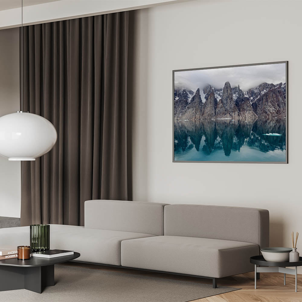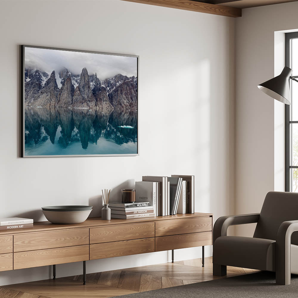 This majestic Arctic mountain scene is perfect for those looking to add a touch of natural beauty and serenity to their home or office. The calm reflection and rugged landscape will create a powerful focal point, enhancing the ambiance of any room.