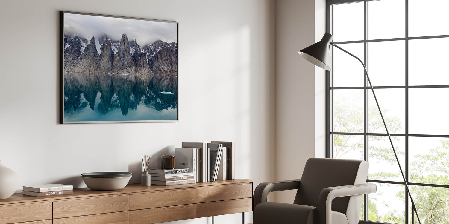 Transport yourself to the remote beauty of the Arctic with this striking wall art, featuring towering peaks reflected in the calm waters of the Northwest Territories. The rugged mountain range, shrouded in mist, is perfectly mirrored in the icy waters below, creating a dramatic and breathtaking scene. This piece of artwork captures the untouched wilderness of Canada's north, making it a stunning addition to any space for nature lovers and adventure enthusiasts alike.