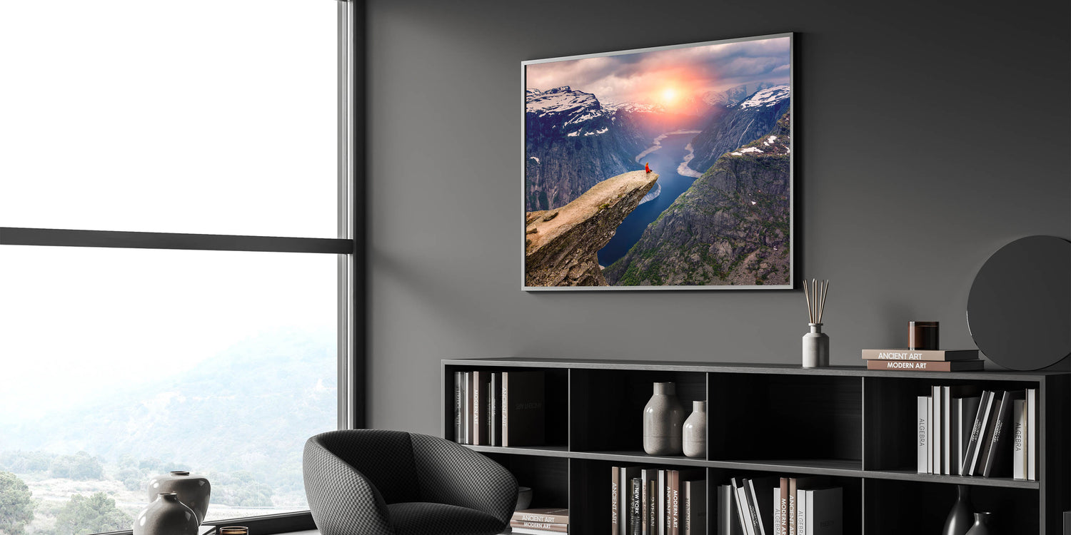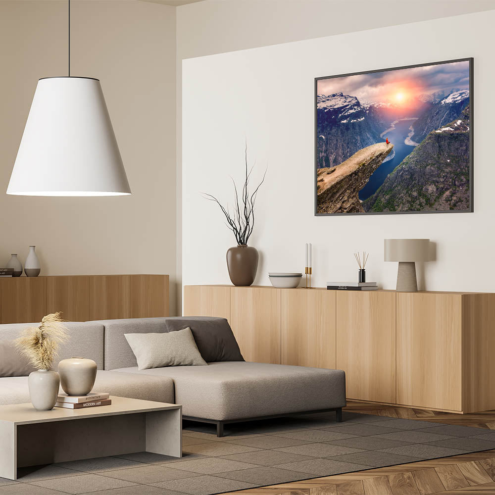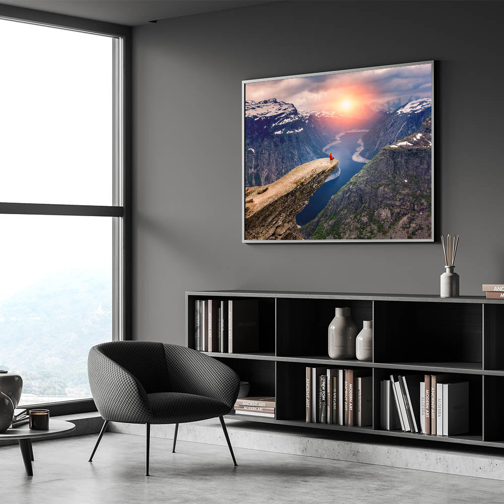 Experience the awe-inspiring beauty of Norway with this breathtaking wall art of Trolltunga, one of Norway’s most famous cliffs. This fjords of Norway canvas print captures a dramatic scene of a lone figure sitting on the edge of the iconic Trolltunga rock, overlooking a majestic fjord, framed by towering mountains and illuminated by a stunning sunset. This Norwegian scenery print is perfect for adding a sense of adventure and natural beauty to any space.
