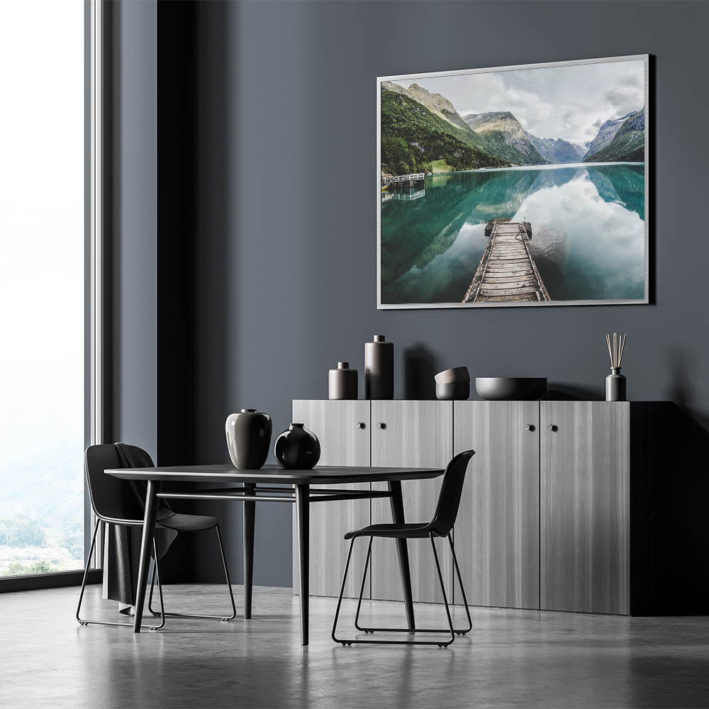 Transport yourself to the tranquil fjords of Norway with this stunning canvas print. This scenic Norway wall art captures the serene beauty of a quiet pier extending into calm, reflective waters, framed by majestic mountains covered in lush greenery. The peaceful atmosphere and mirror-like reflections create a calming sense of stillness, making this Norwegian scenery print a perfect addition to any space that craves a touch of nature’s beauty.
