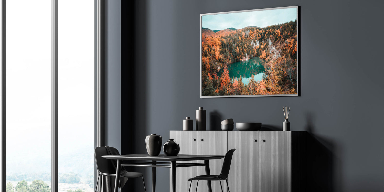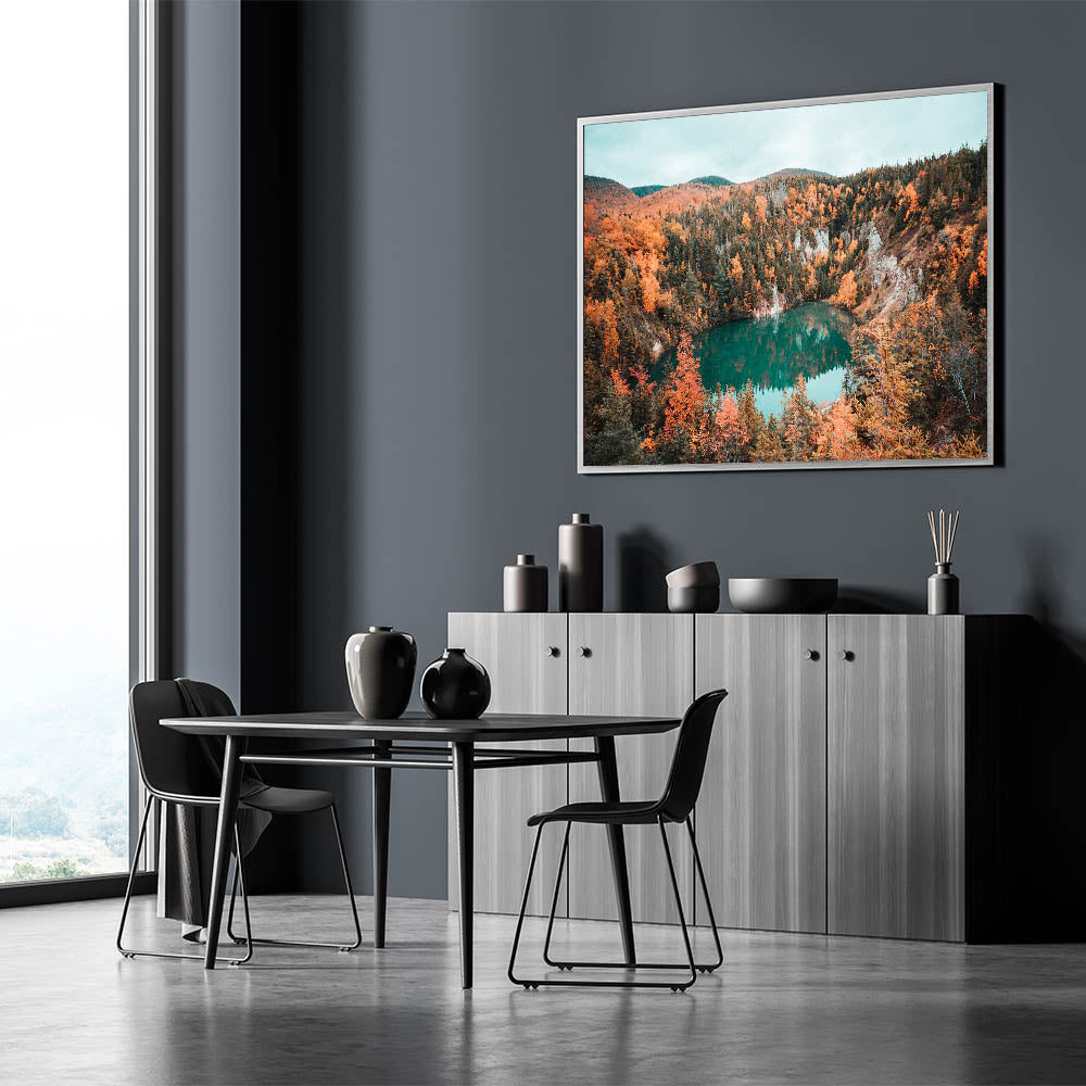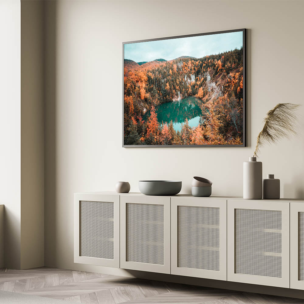 Immerse yourself in the captivating beauty of Nova Scotia’s autumn season with this stunning landscape wall art. This serene image showcases the vibrant fall foliage surrounding a crystal-clear lake, perfectly reflecting the rich colors of the trees and the sky. The combination of warm oranges, golden yellows, and cool greens brings the essence of autumn in the Canadian Maritimes to life, making it an ideal piece for nature lovers and those who appreciate seasonal scenery.