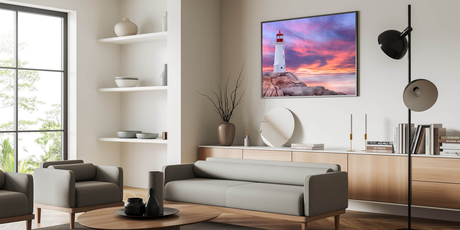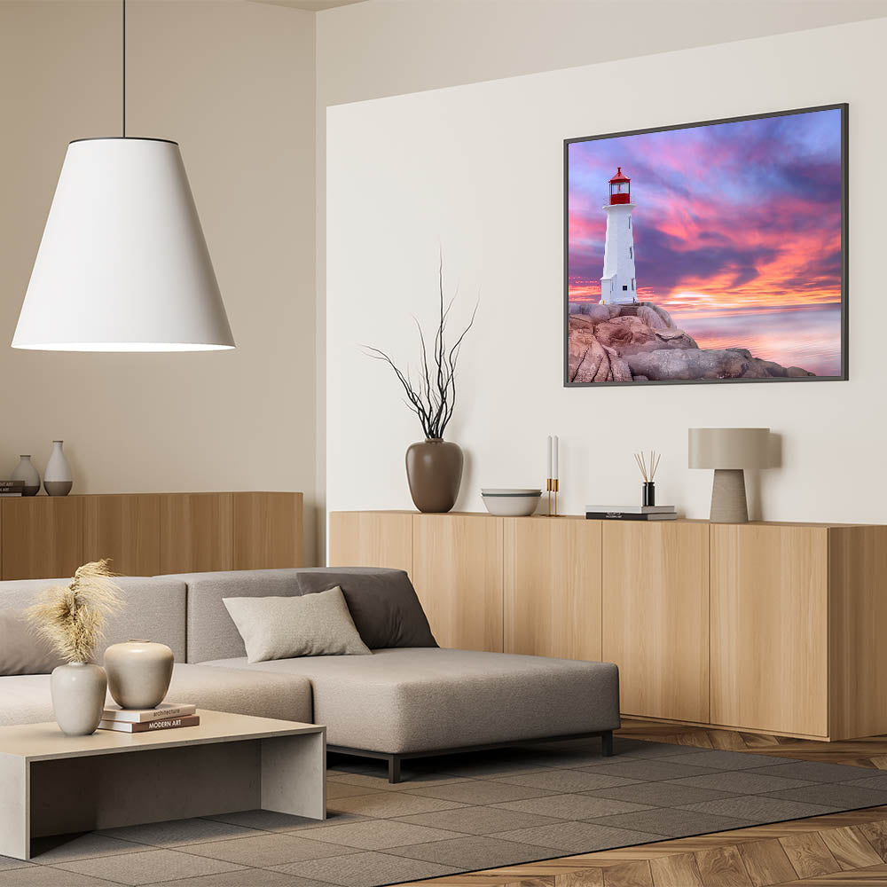 Enhance your space with this Nova Scotia lighthouse art, featuring the iconic scenery of the Atlantic coast. Whether it's for your living room, bedroom, or office, this piece will evoke memories of serene coastal sunsets. The perfect way to celebrate the beauty of Nova Scotia, this art print will leave a lasting impression on anyone who views it.