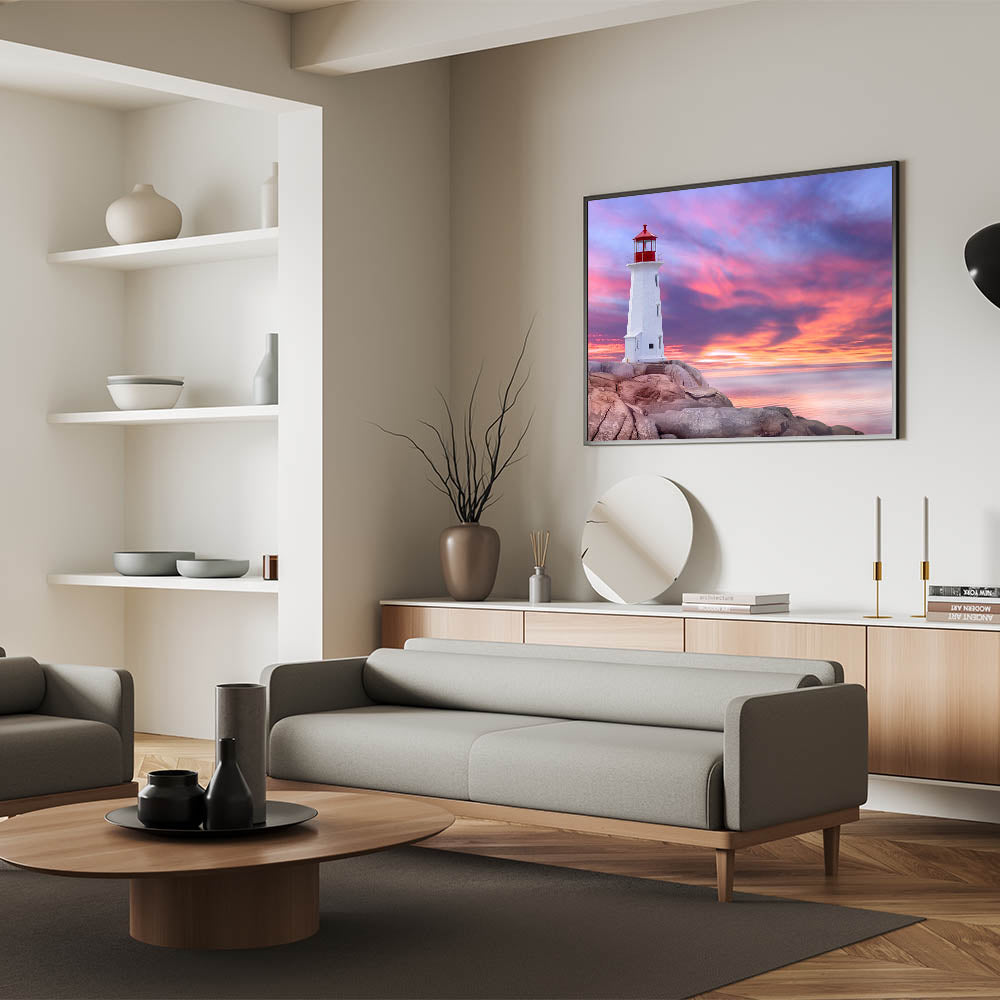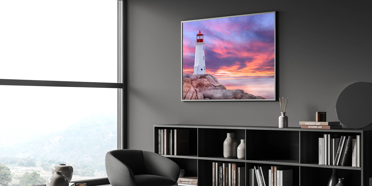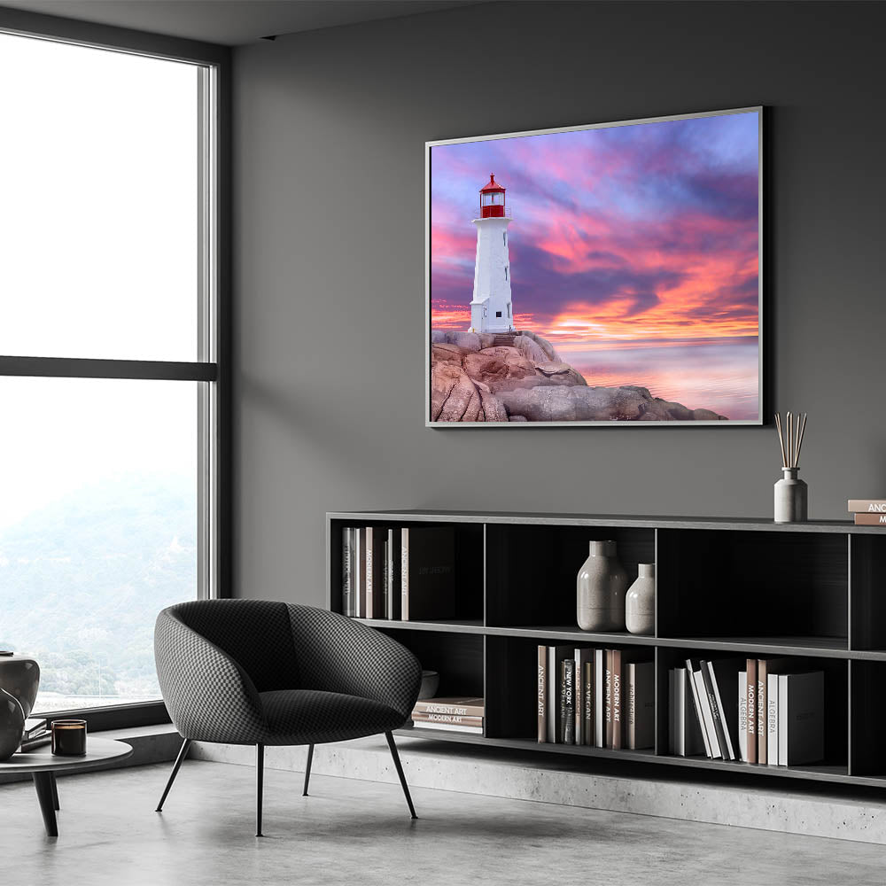 Capture the breathtaking beauty of Nova Scotia with this stunning wall art of a lighthouse against a vivid sunset. Perfect for lovers of coastal scenery, this print brings the serene charm of the Canadian Maritime province right into your home. The soft hues of pink, orange, and purple in the sky contrast beautifully with the solid white structure of the lighthouse, creating a mesmerizing scene.