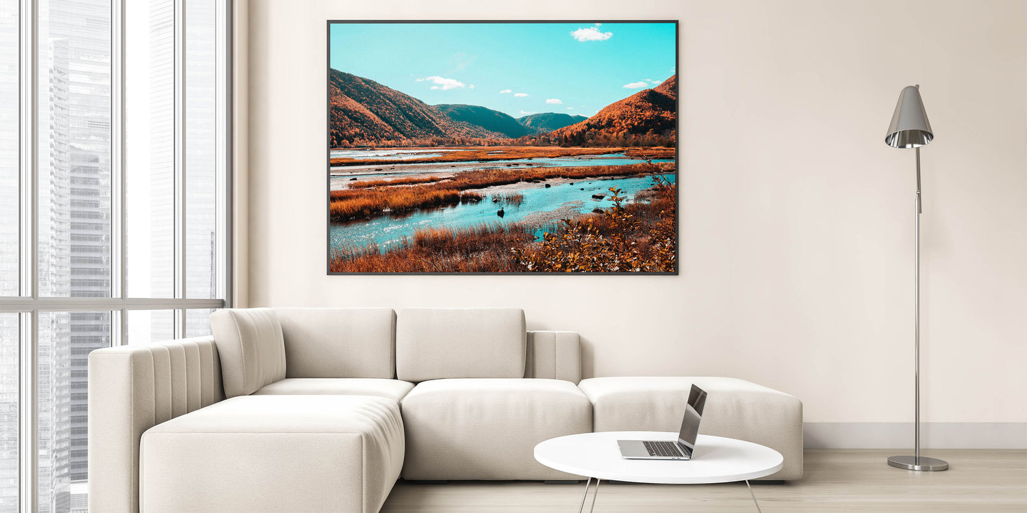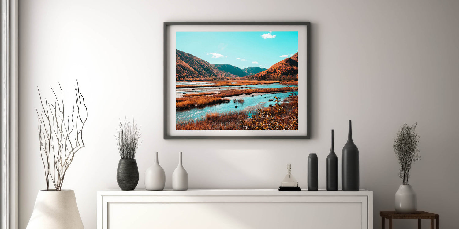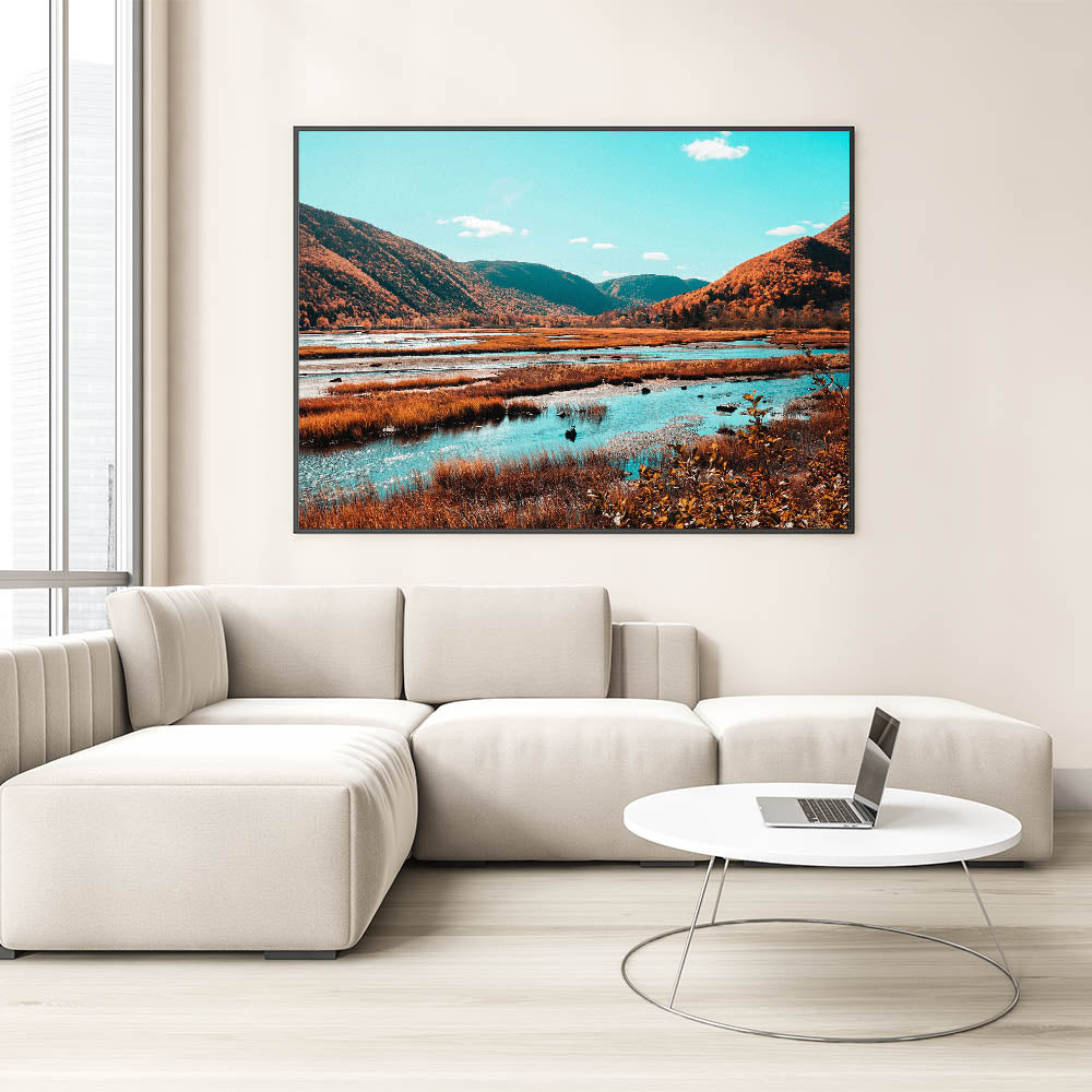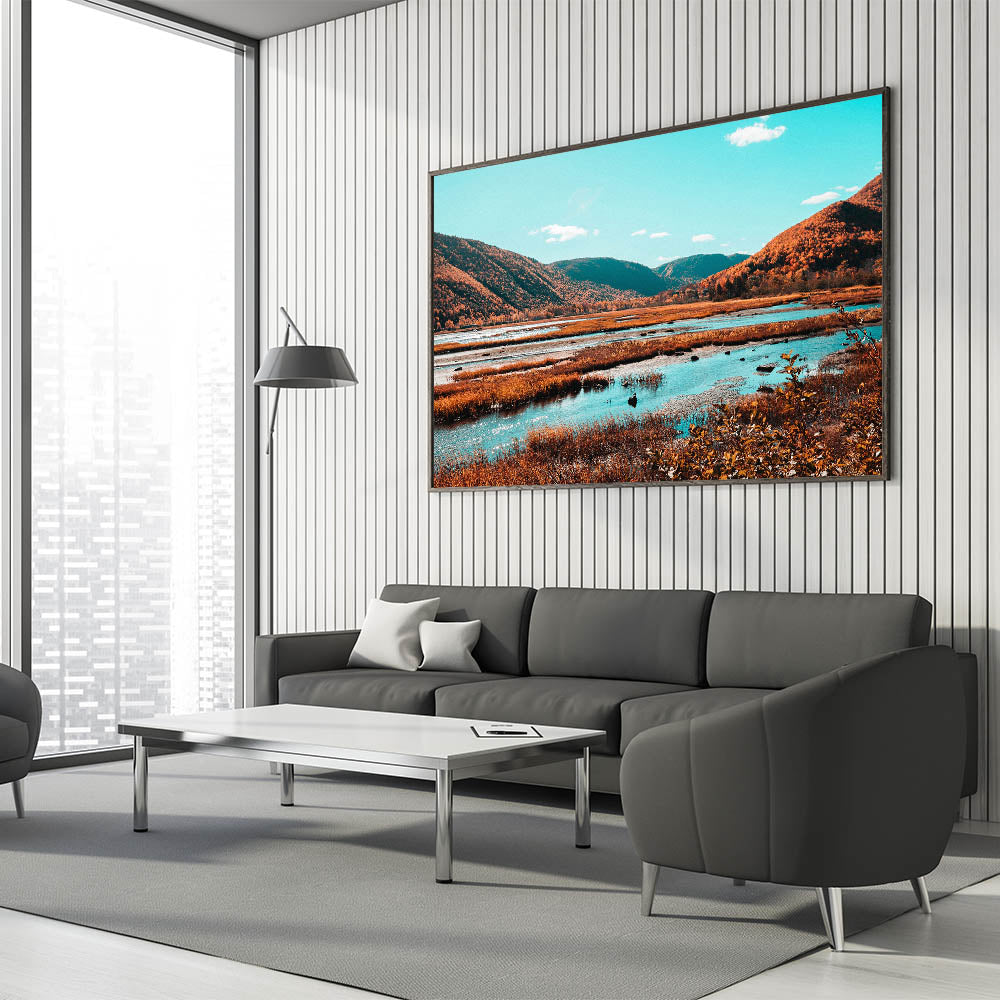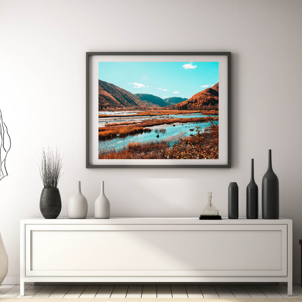 Celebrate the vibrant colors of Nova Scotia’s marshlands with this stunning autumn landscape wall art. This captivating image captures the beauty of the Maritime province’s rolling hills, bathed in the rich hues of fall foliage. The combination of warm oranges, golden browns, and vivid blue skies reflects off the water, creating a dynamic and breathtaking scene. The soft movement of the marshlands and the distant mountains creates a peaceful, tranquil atmosphere that will elevate any space.