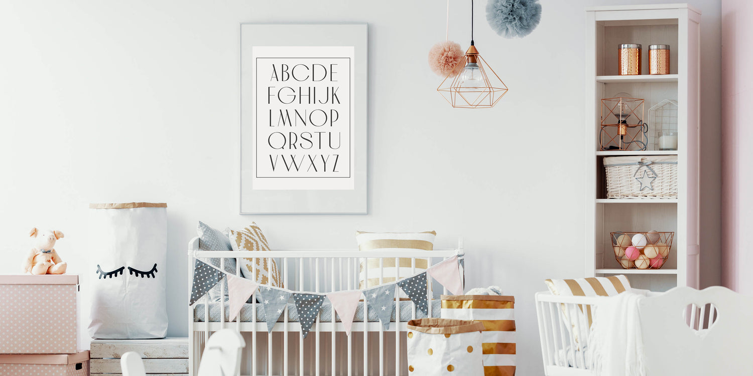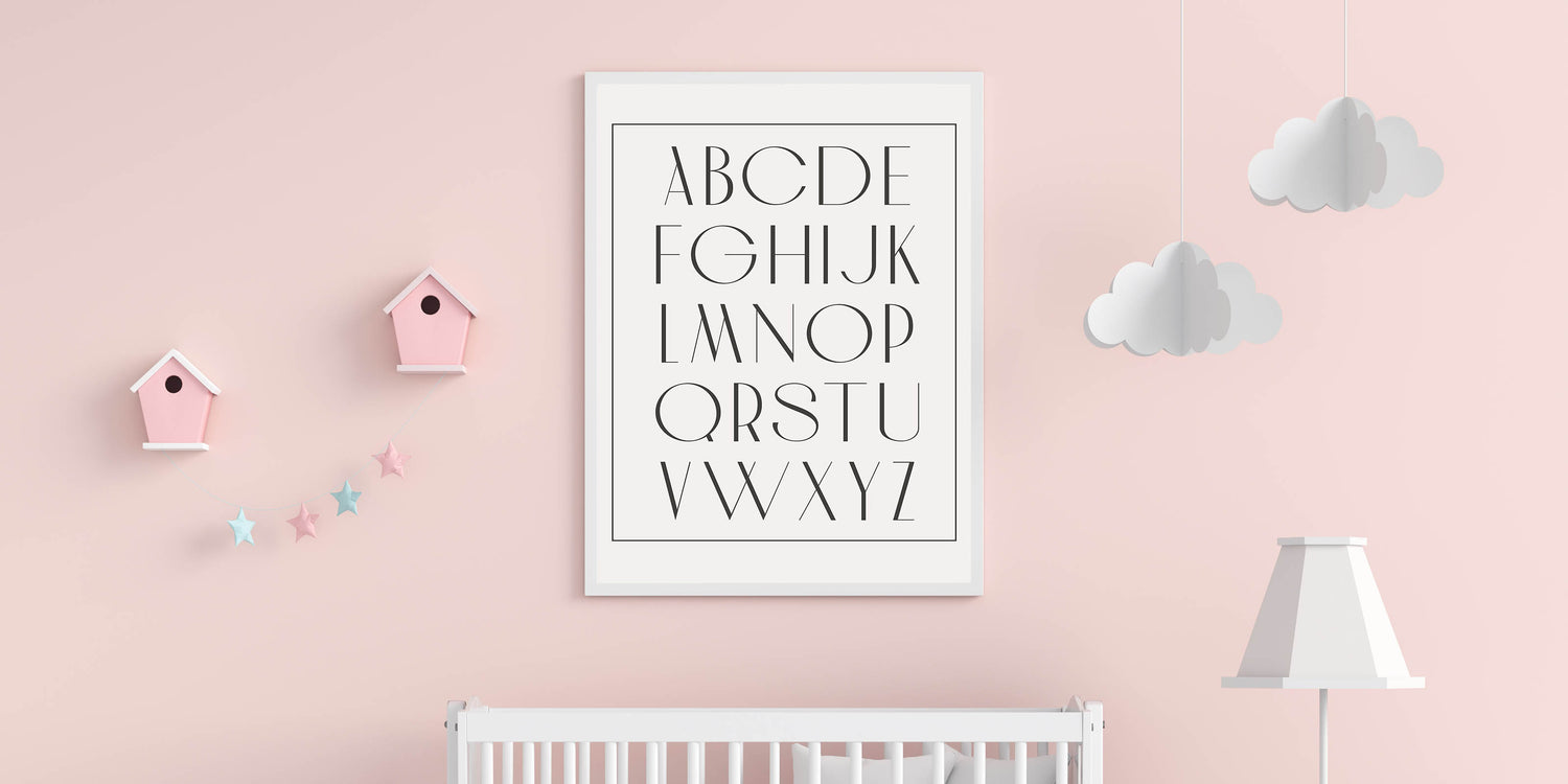 This framed nursery art is a beautiful and educational way to introduce letters while maintaining a modern and refined nursery aesthetic. Whether you choose Framed Acrylic Children's Art or a Rolled Canvas Nursery Print, this alphabet print will bring style, learning, and simplicity to your baby’s space.
