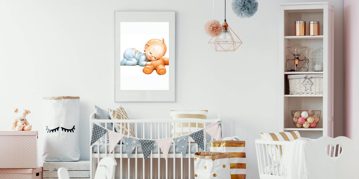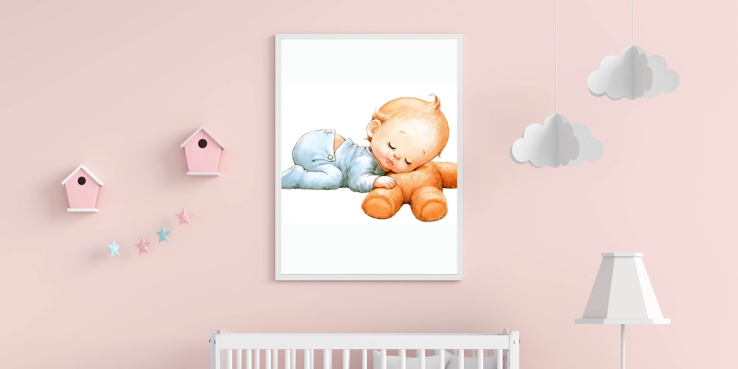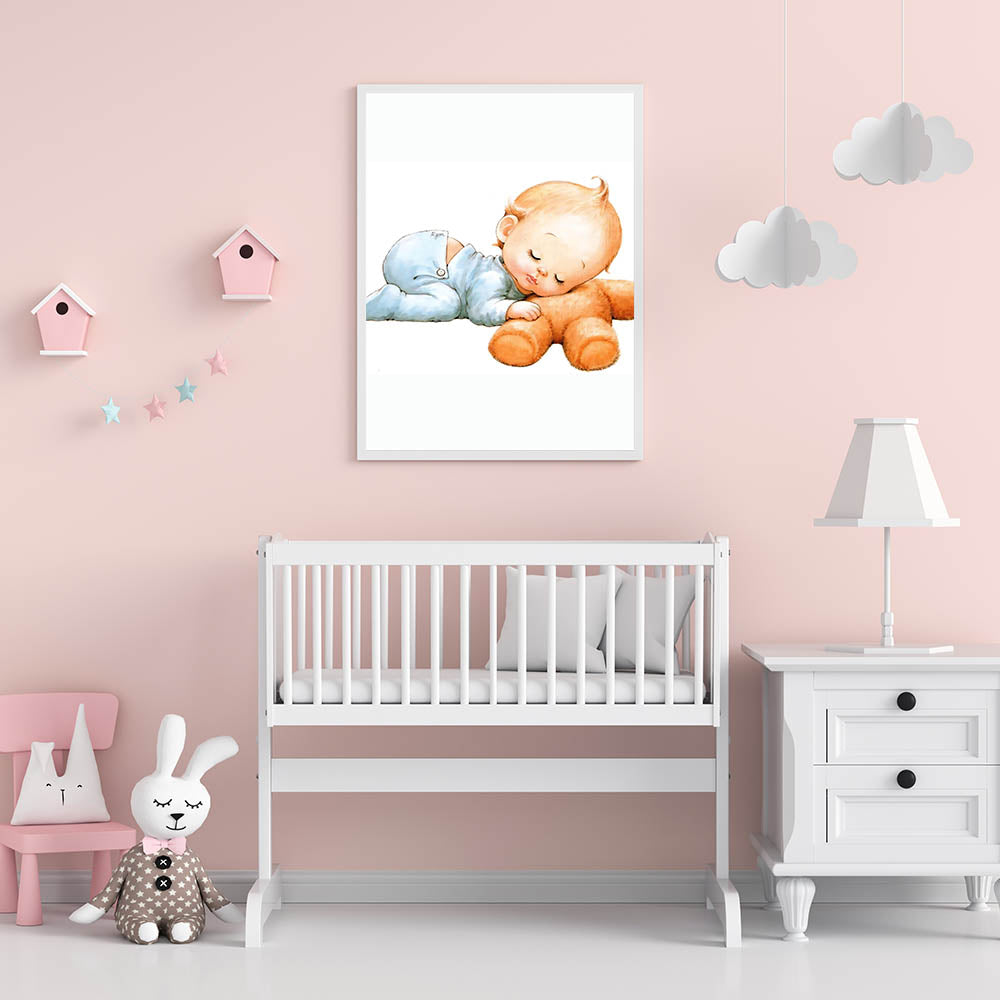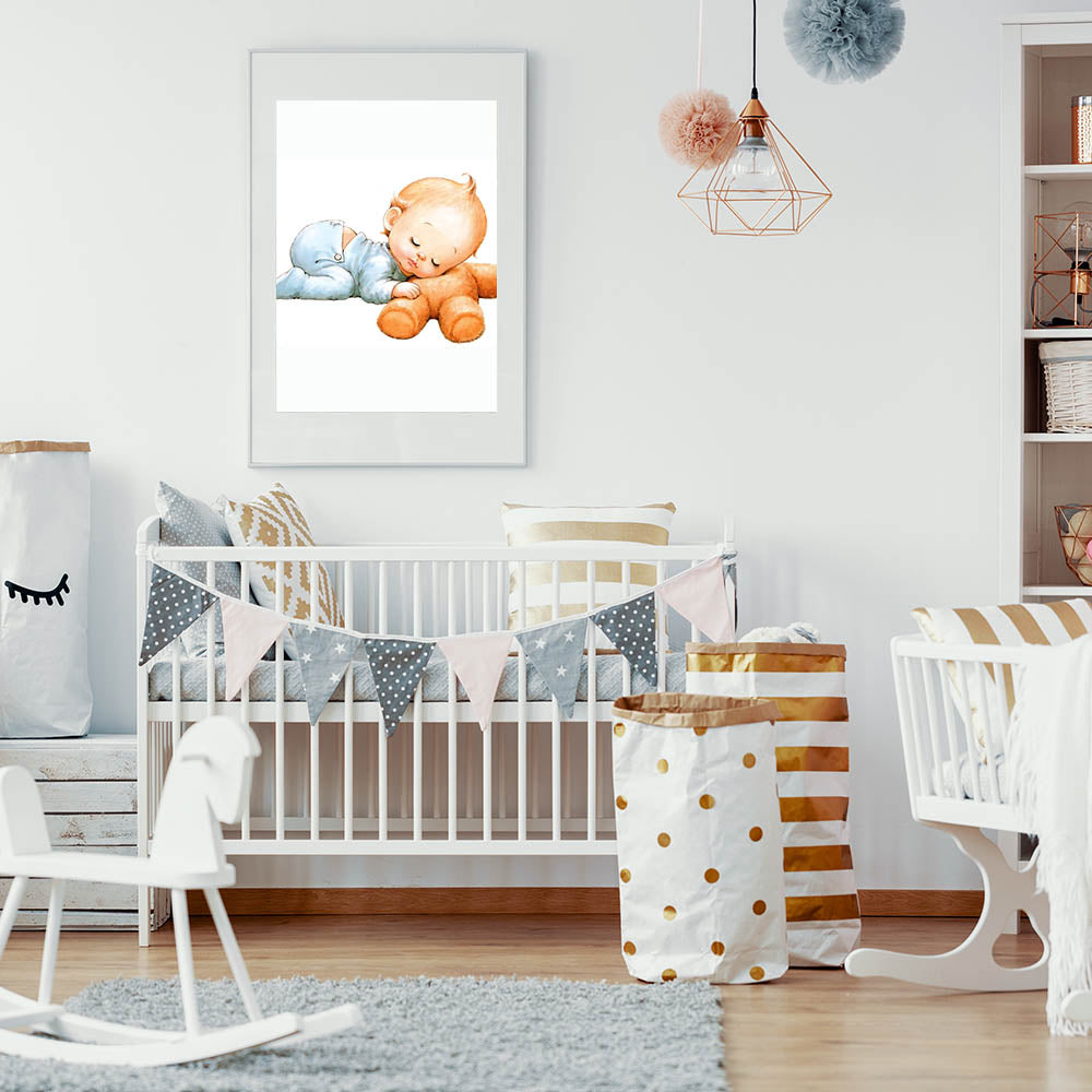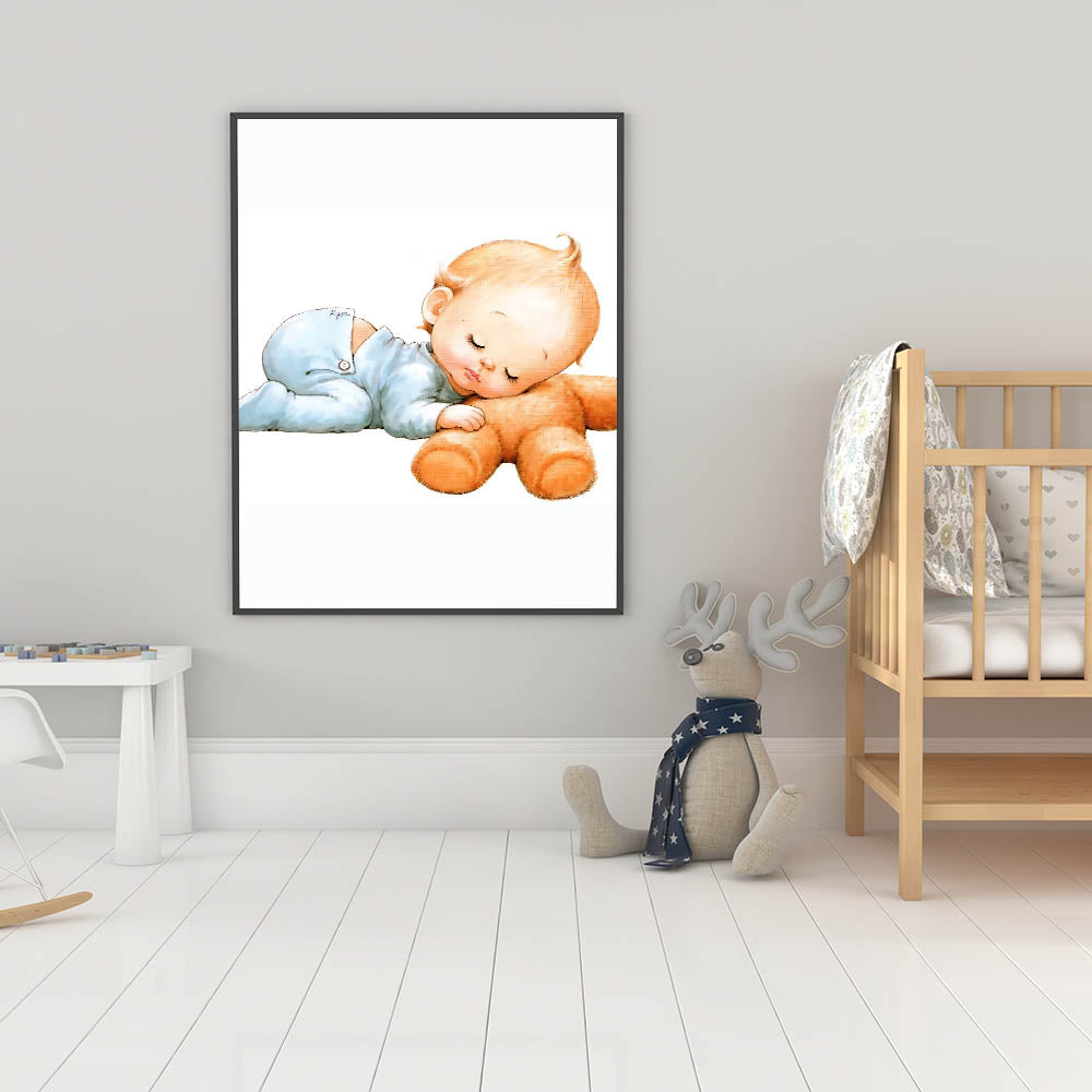 Create a soothing and serene nursery with this sleeping baby nursery wall art. Featuring an adorable baby resting peacefully on a soft teddy bear, this baby room decor captures the innocence and warmth of early childhood. The gentle blue and beige hues make it a perfect addition to nurseries, offering a calming effect that helps create a cozy sleeping space for your little one.
