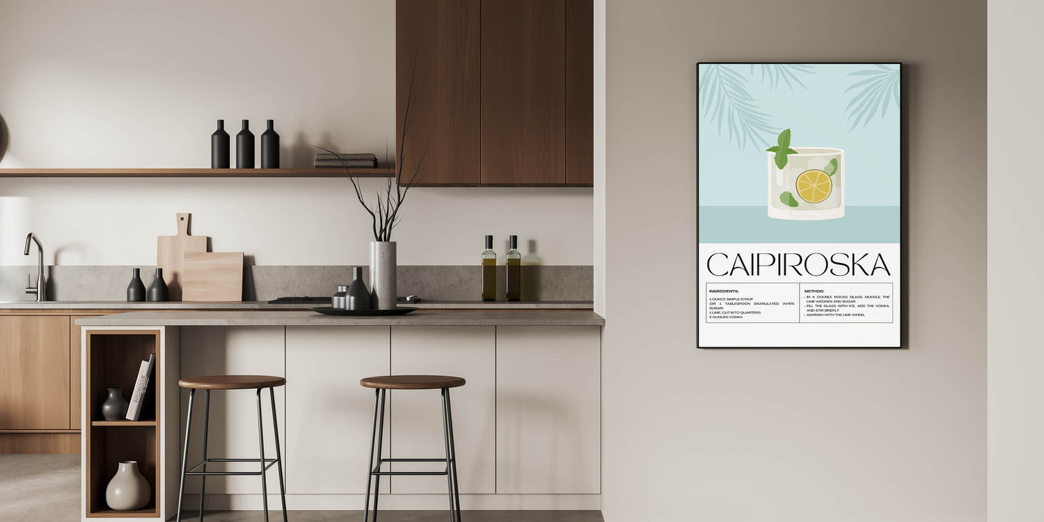 Add a refreshing and stylish touch to your space with this Caipiroska Cocktail Recipe Wall Art. Featuring a minimalist yet eye-catching illustration of a classic Caipiroska cocktail, this artwork showcases the drink’s ingredients and preparation method in a modern and elegant design. The soothing light blue background, fresh lime slices, and crisp typography make this beverage art decor a perfect fit for home bars, kitchens, and dining areas.
