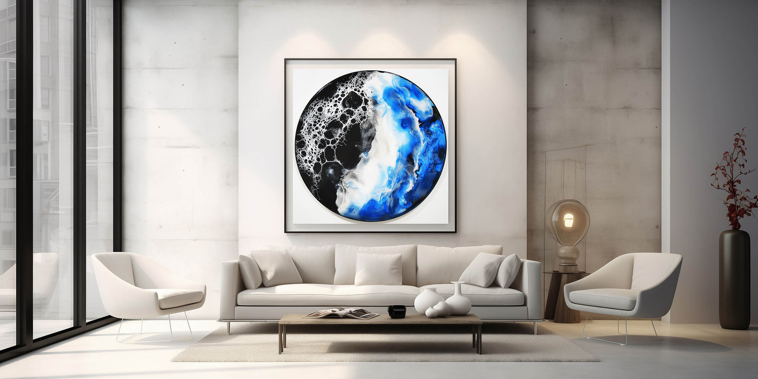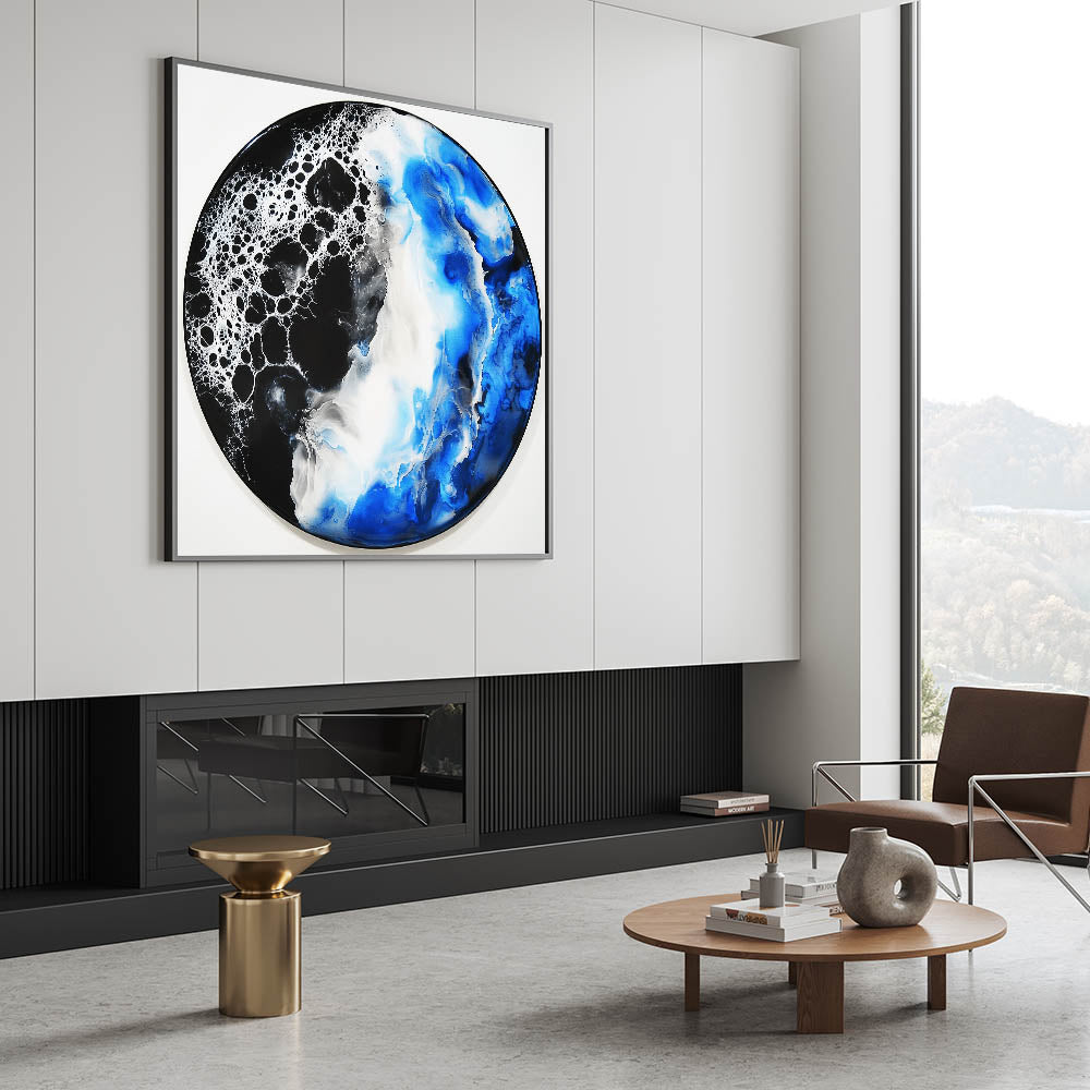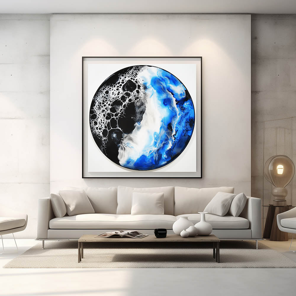 Bring a captivating artistic touch to your home with this modern wall art, featuring a mesmerizing abstract design in black, white, and deep blue tones. The circular composition with fluid, organic patterns creates a stunning canvas wall art piece, ideal for modern living room decor. This contemporary wall art blends bold contrasts and intricate textures, making it a perfect addition to wall art for living room spaces. Whether placed above a sofa, fireplace, or entryway, its large canvas art design will make a striking visual statement.
