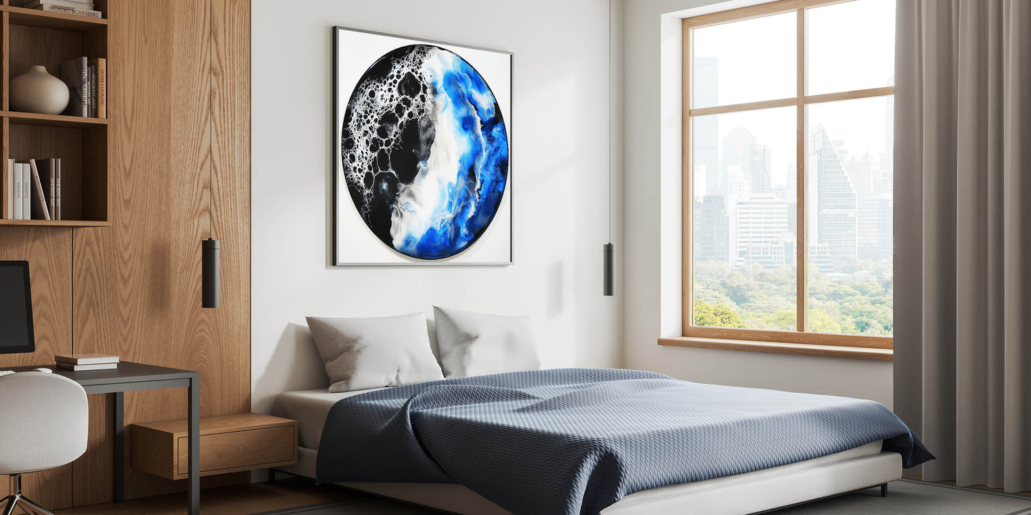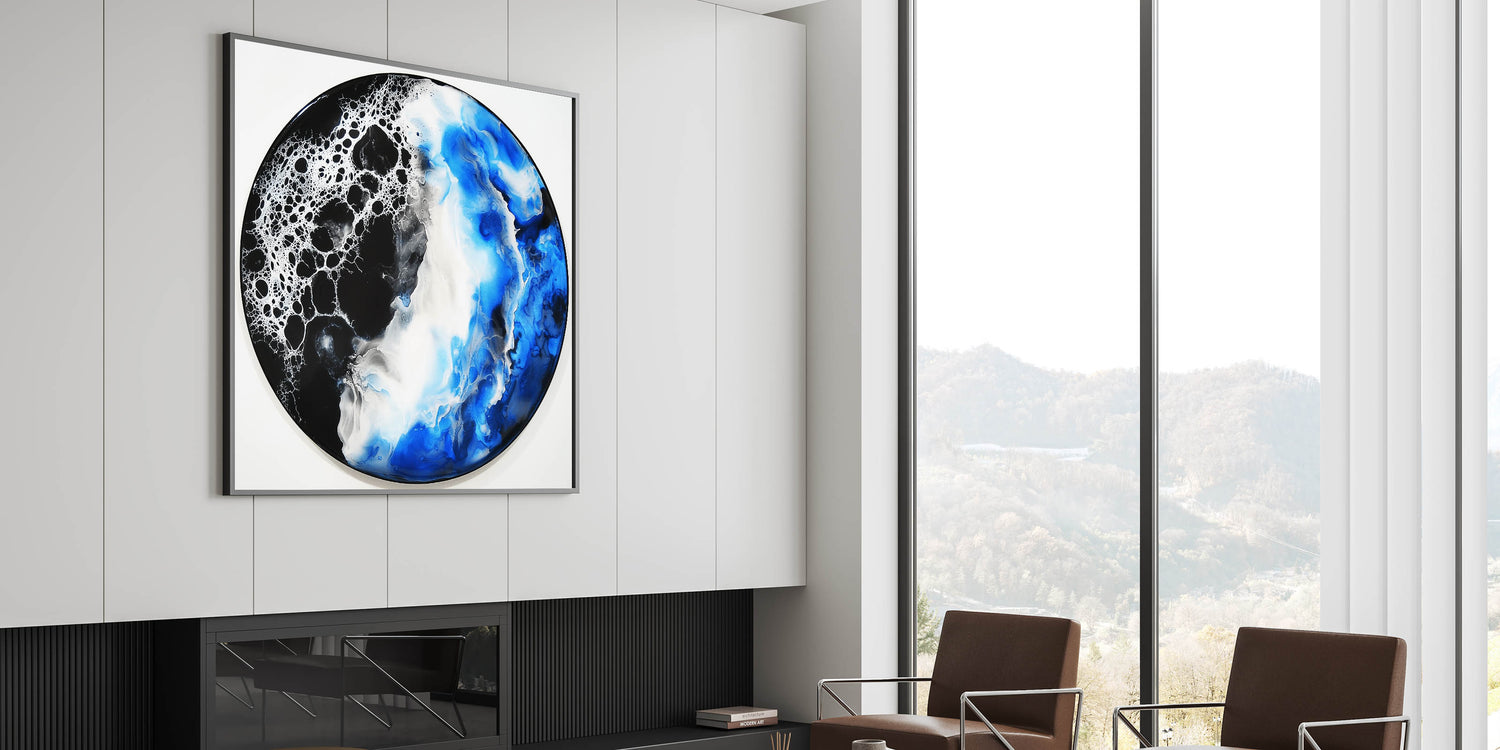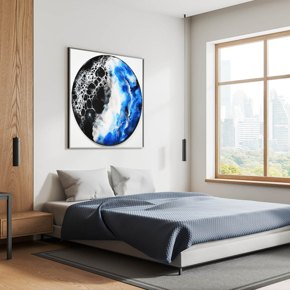 Bring a captivating artistic touch to your home with this modern wall art, featuring a mesmerizing abstract design in black, white, and deep blue tones. The circular composition with fluid, organic patterns creates a stunning canvas wall art piece, ideal for modern living room decor. This contemporary wall art blends bold contrasts and intricate textures, making it a perfect addition to wall art for living room spaces. Whether placed above a sofa, fireplace, or entryway, its large canvas art design will make a striking visual statement.