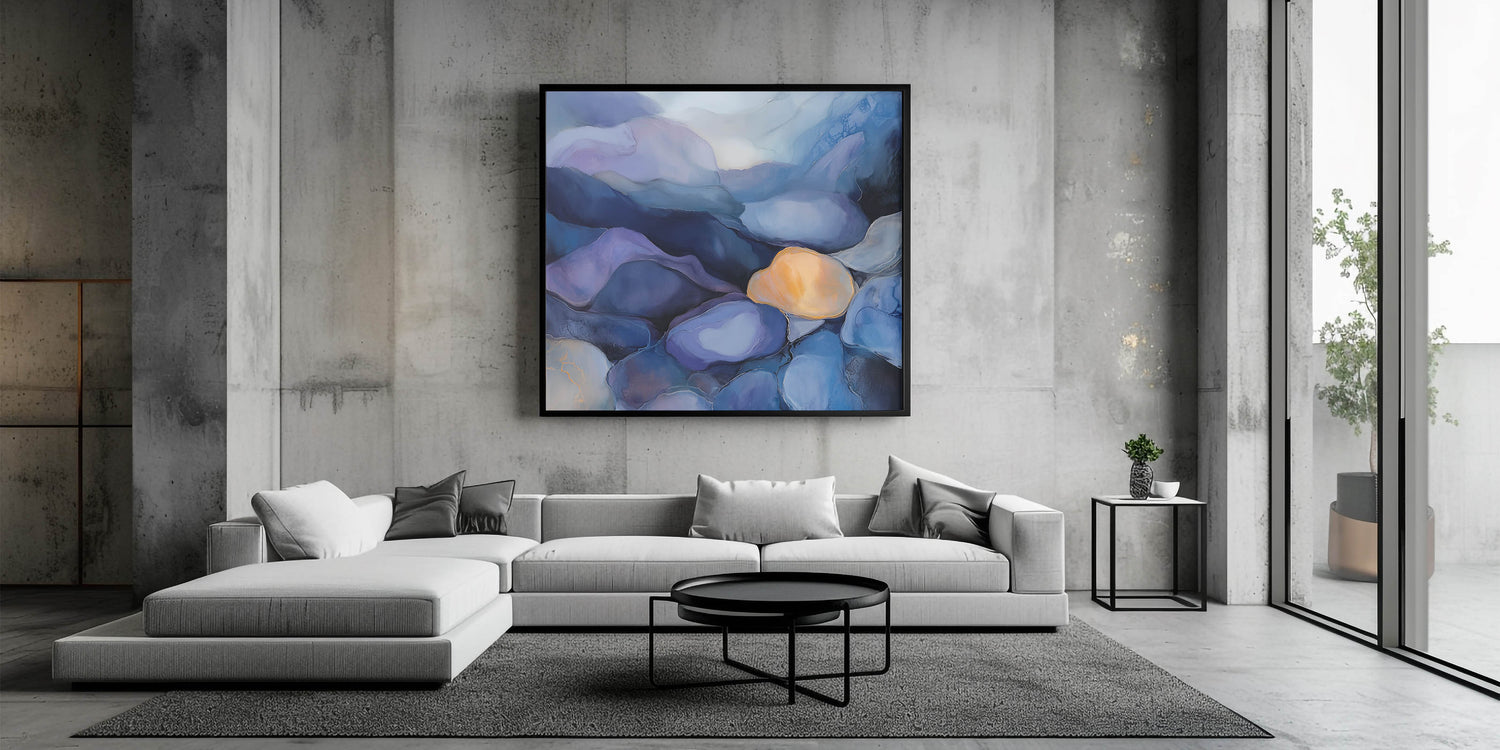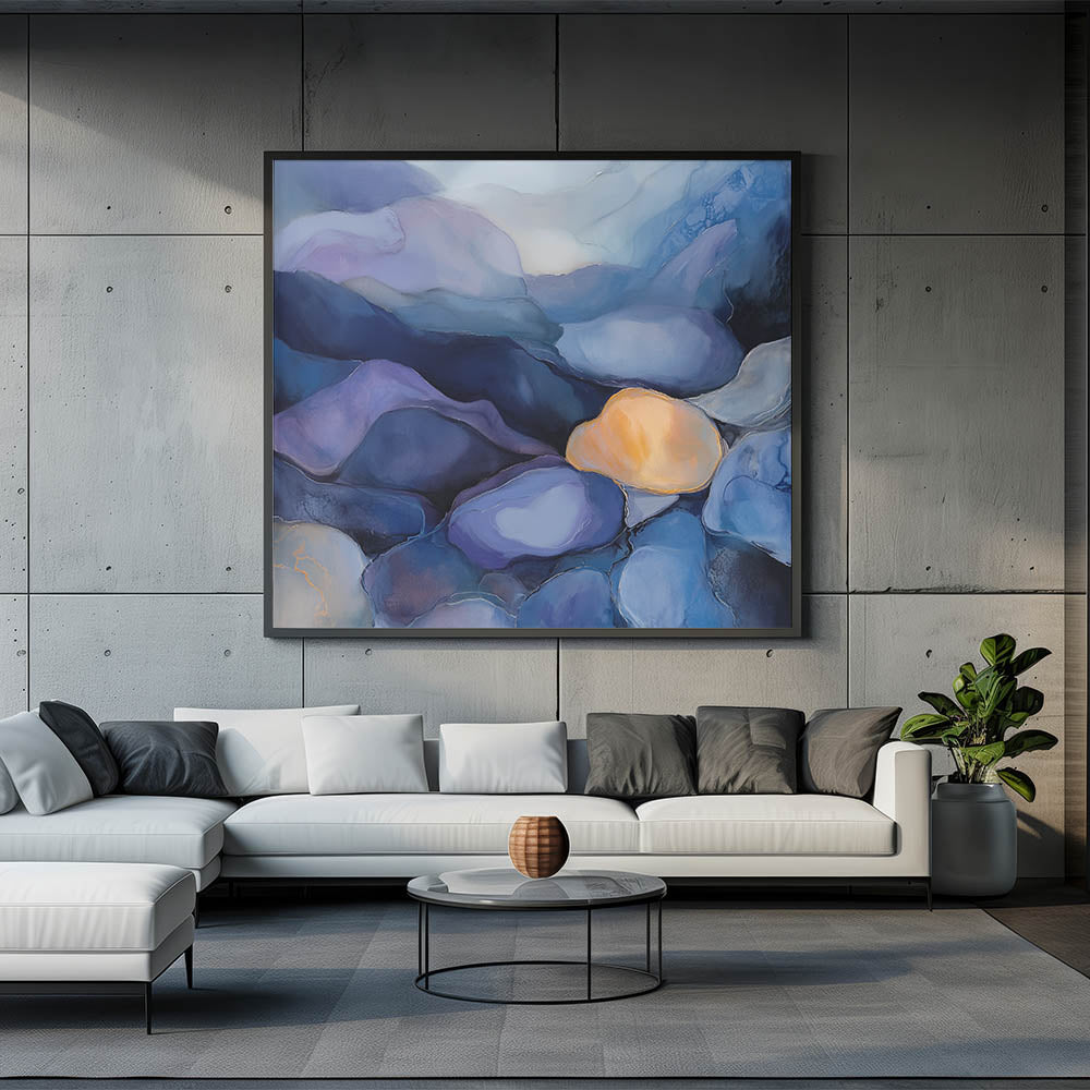 Immerse your space in a tranquil dreamscape with this colorful abstract wall art. Inspired by the natural shapes of smooth river stones, the piece features fluid forms in navy, periwinkle, lavender, and a radiant gold accent—bringing calm, depth, and contrast to your decor.