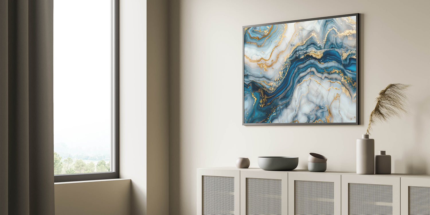 - High-end abstract canvas print with rich navy, sky blue, and gold tones