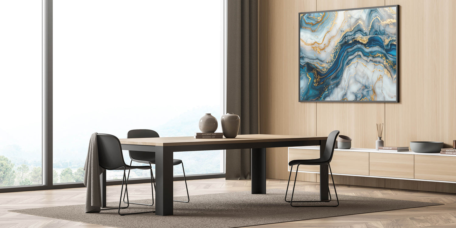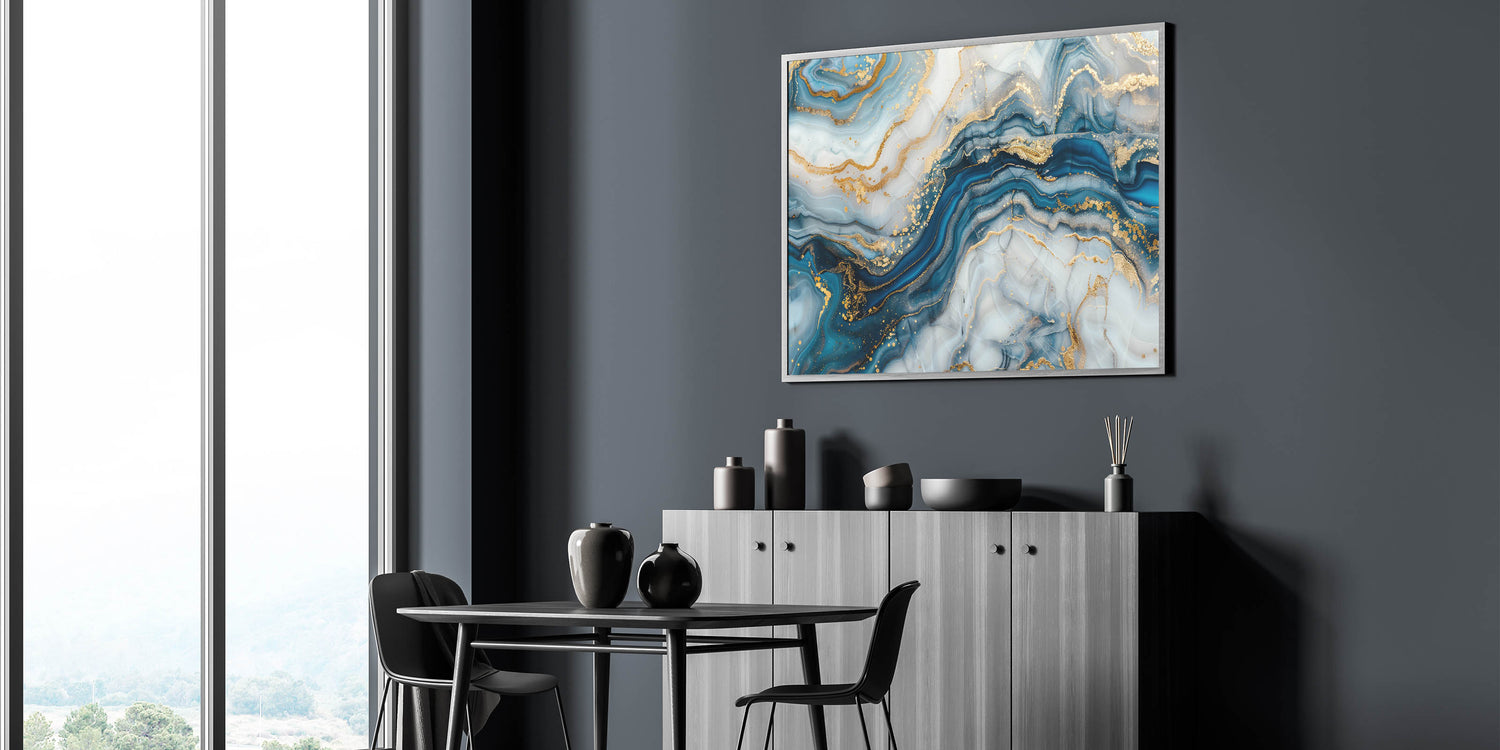 Enhance your space with this exclusive modern abstract art, a mesmerizing combination of deep navy blue, sky blue, white, and luxurious gold. The fluid, marble-like textures and metallic details create a premium abstract art piece, perfect for sophisticated and modern interiors. This luxury abstract wall art collection piece is designed for those who appreciate elegance and exclusivity.
