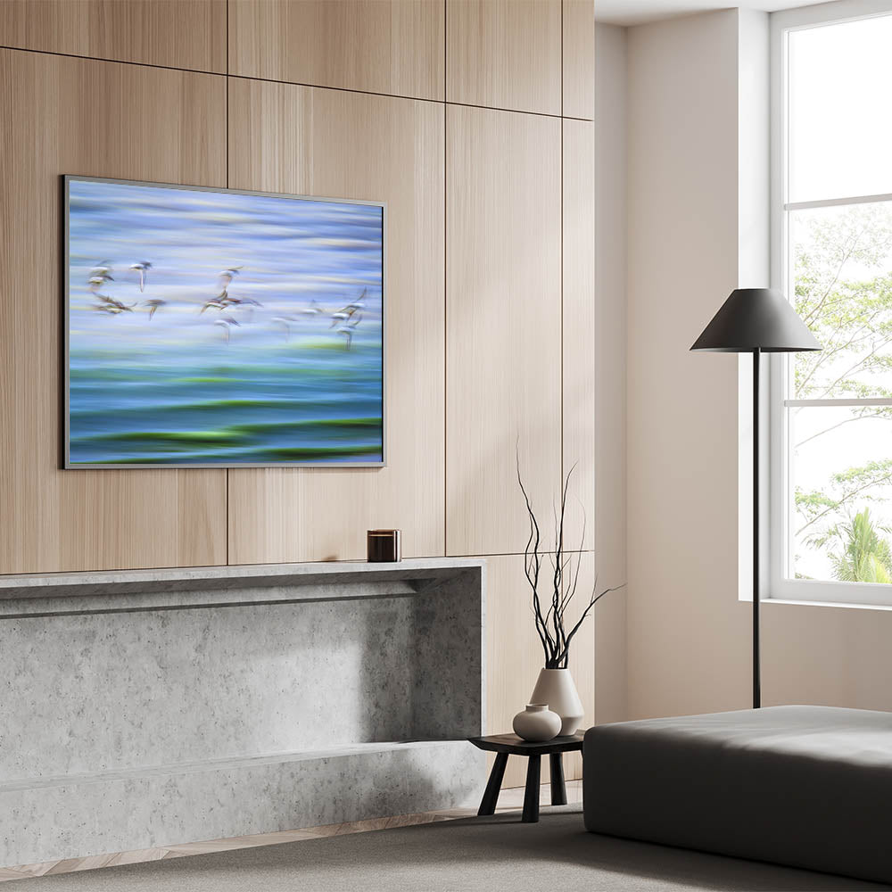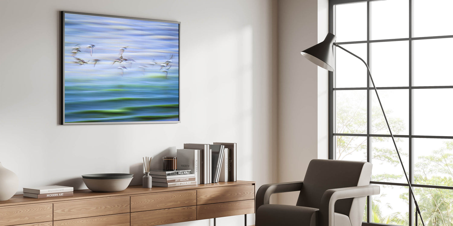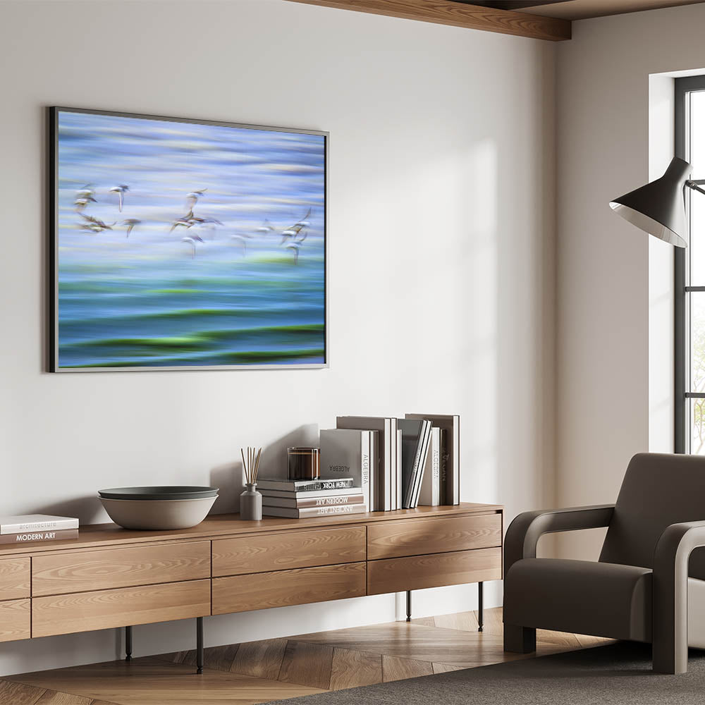 Immerse yourself in the serene beauty of nature with this fine art photography canvas print. Capturing a flock of birds gliding gracefully over shimmering waters, this piece uses a soft motion blur effect to create a dreamy, impressionistic feel. The gentle interplay of blues, teals, and greens enhances the tranquil and ethereal atmosphere.
