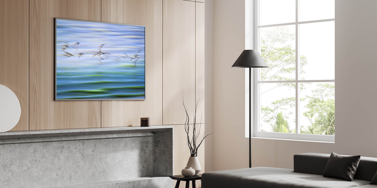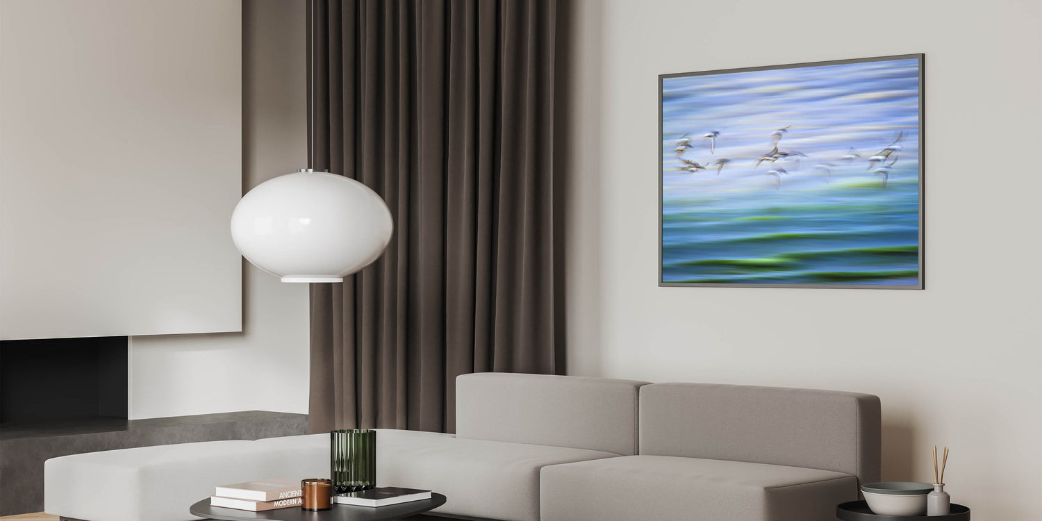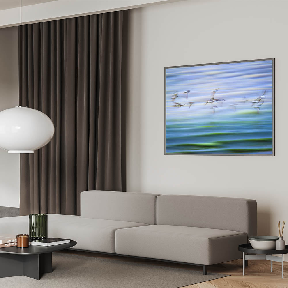 Immerse yourself in the serene beauty of nature with this fine art photography canvas print. Capturing a flock of birds gliding gracefully over shimmering waters, this piece uses a soft motion blur effect to create a dreamy, impressionistic feel. The gentle interplay of blues, teals, and greens enhances the tranquil and ethereal atmosphere.