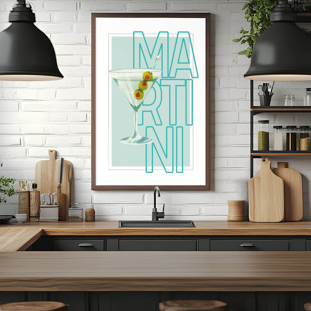 Elevate your space with this Martini Cocktail Art, a sophisticated beverage wall art piece that embodies the timeless elegance of a classic martini. Featuring a beautifully illustrated martini glass with a skewer of green olives, this artwork is the perfect addition to bars, lounges, kitchens, and cocktail-themed spaces. The cool, refreshing tones create a modern yet vintage feel, making it a must-have for cocktail lovers and mixology enthusiasts.