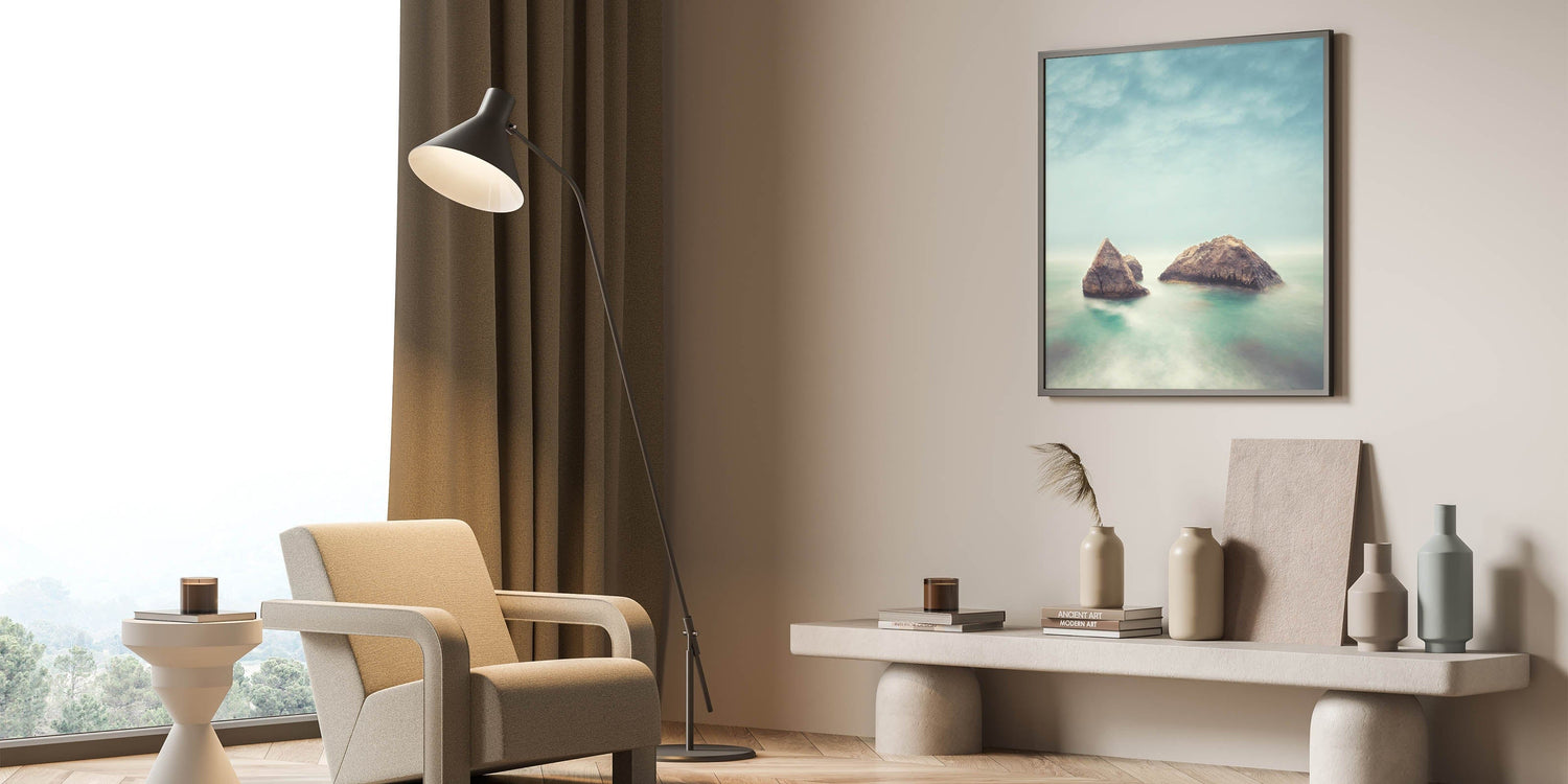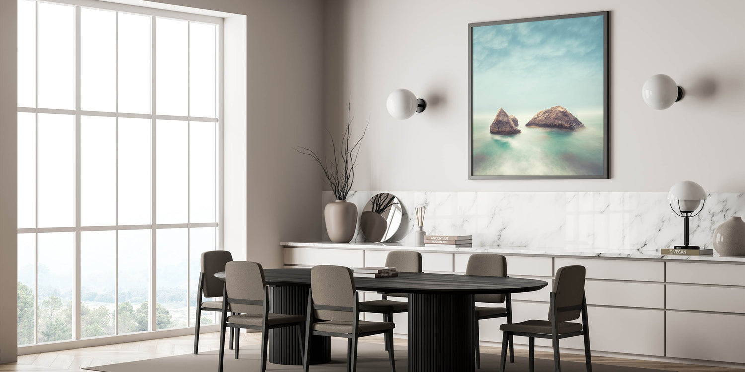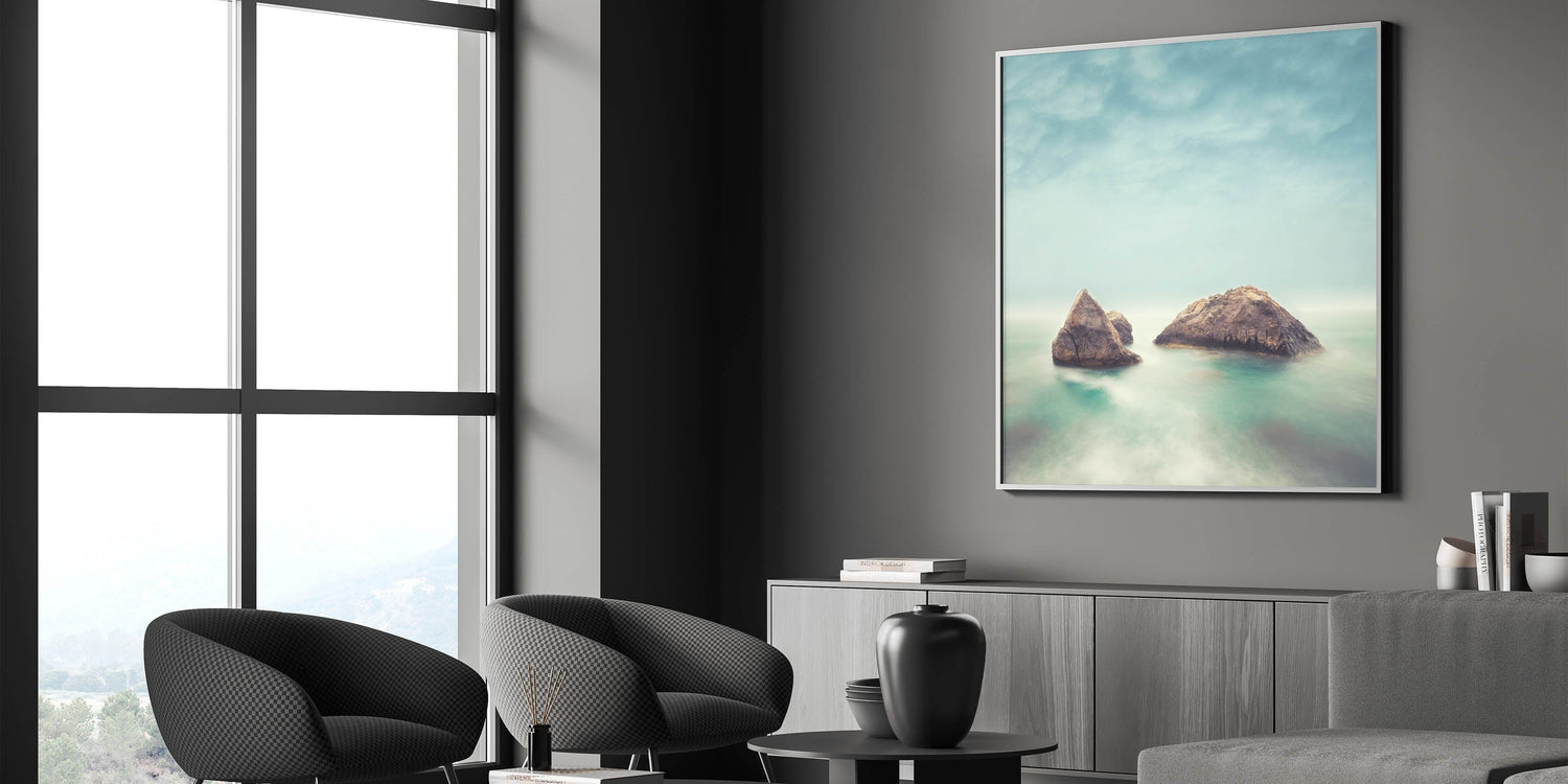 Transform your space with the serene beauty of this Minimalist Landscape Artwork, featuring large coastal rocks surrounded by soft mist and tranquil teal waters. The pale sky adds to the peaceful ambiance, creating a clean, modern look that suits a wide variety of interiors. Ideal for those who love Minimalist Coastal Landscape Art, this piece brings nature’s calm indoors.
