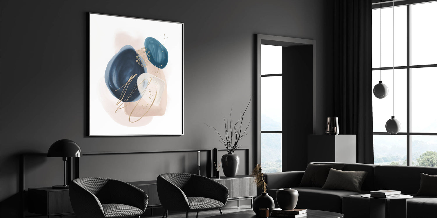 Add sophistication and contrast to your interior with this striking geometric minimalist abstract wall art. Featuring rich navy blue, vibrant teal, and soft blush beige shapes with delicate gold detailing, this composition blends modern artistry with timeless elegance. The organic forms and clean layout make it a stunning focal point for both minimalist and contemporary spaces.