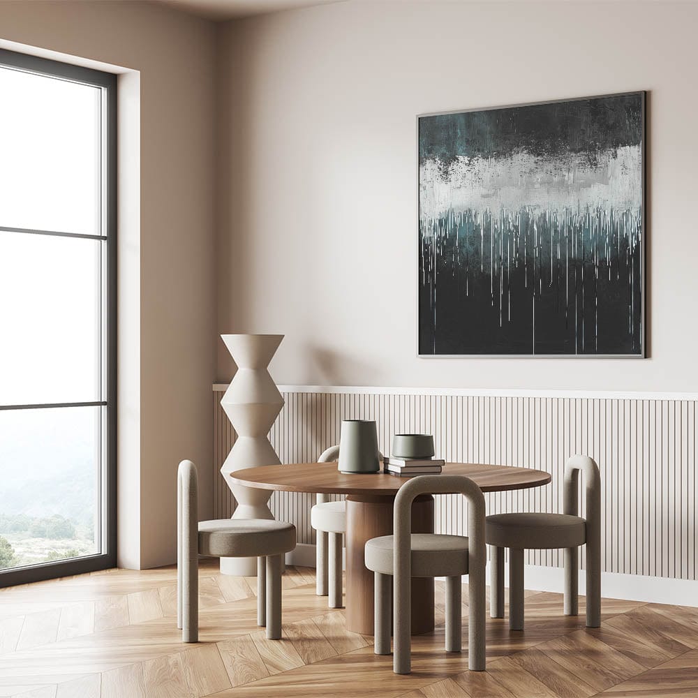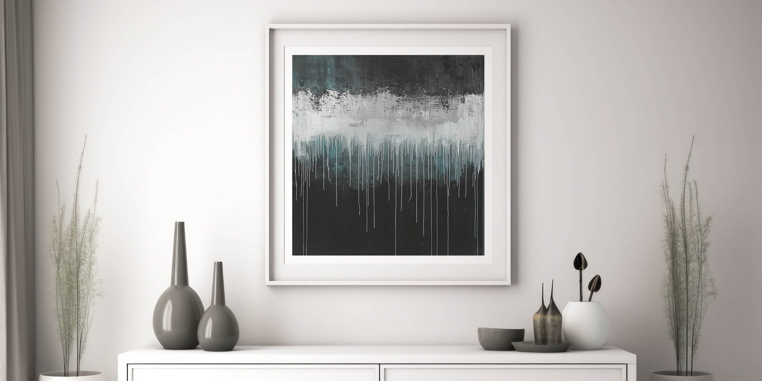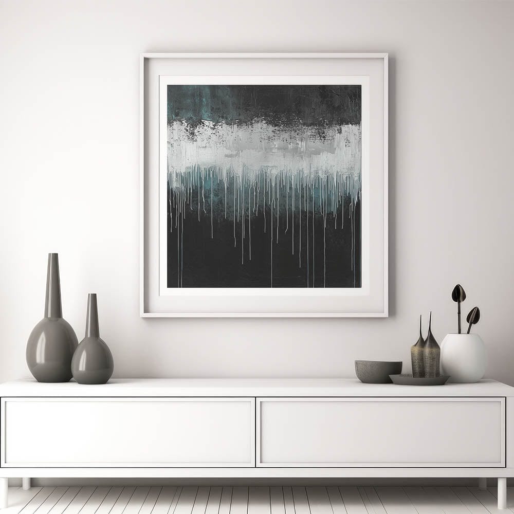 • A bold modern art print featuring deep teal, black, and textured white