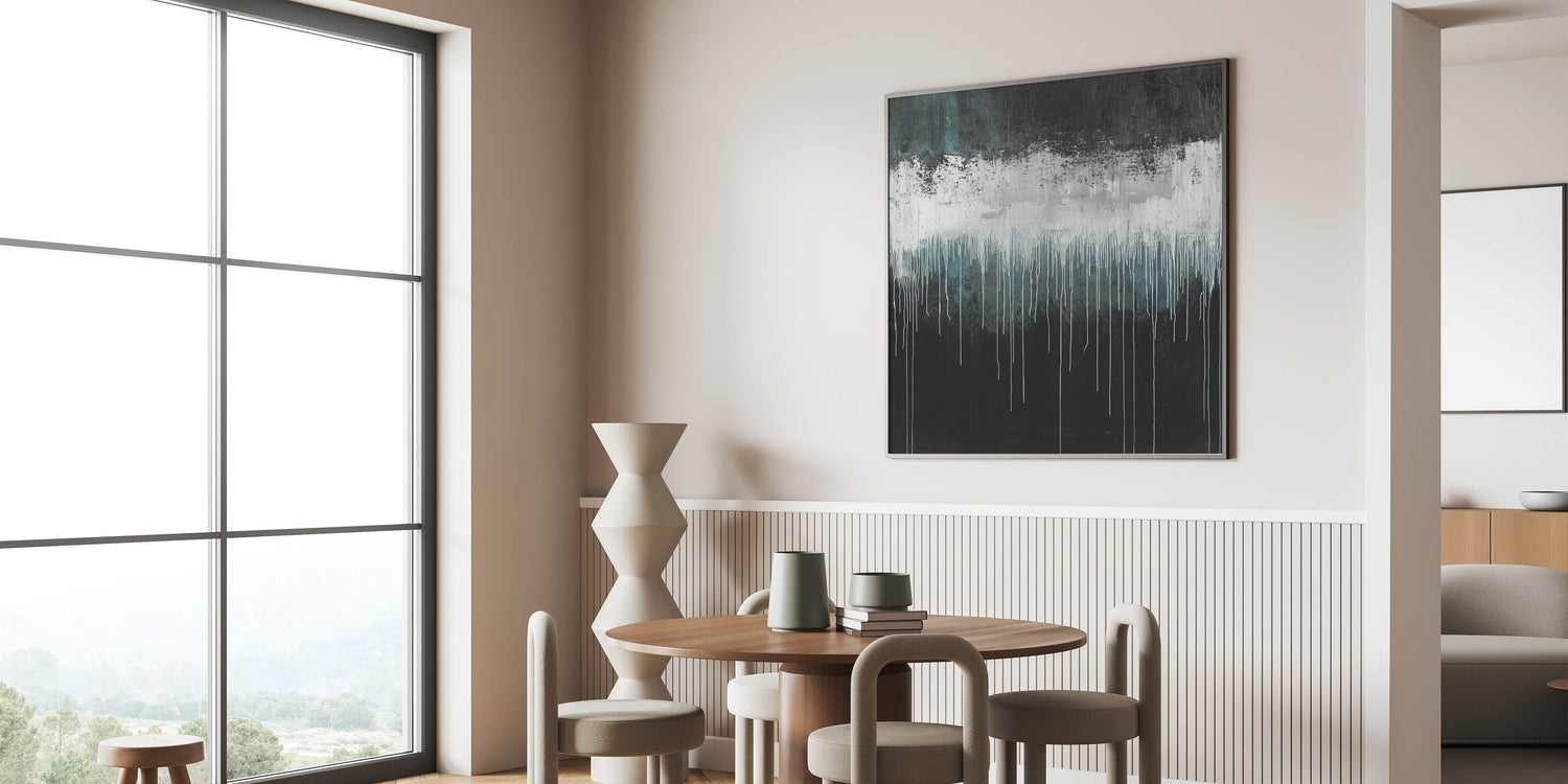 Elevate your space with this modern abstract painting, featuring a bold black background with dynamic white and deep teal dripping effects. The textured layers and expressive brushstrokes in this moody modern wall art create an intense yet sophisticated composition, making it an ideal piece for contemporary interiors. Whether displayed in a living room, office, or creative space, this abstract canvas wall art brings an edgy yet refined artistic touch.