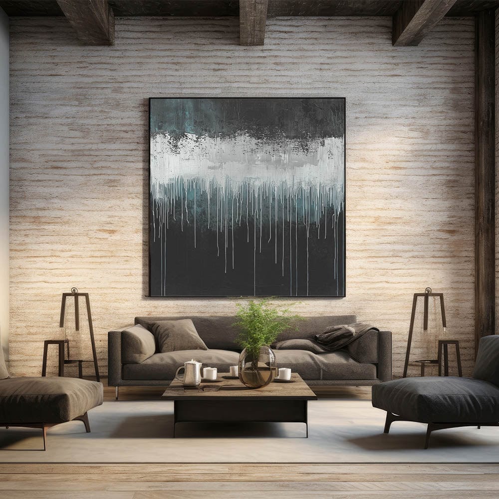 This contemporary abstract art blends raw artistic expression with refined contrast, making it a captivating focal point. Whether printed on stretched canvas, framed print, or acrylic glass, this striking piece will enhance your décor with its bold and moody presence. Transform your space with this stunning artwork today.
