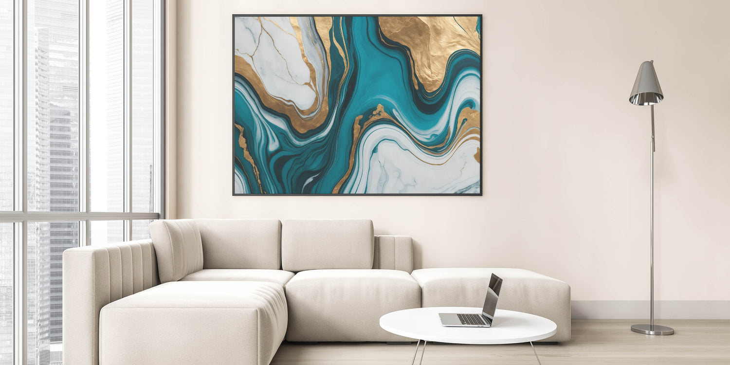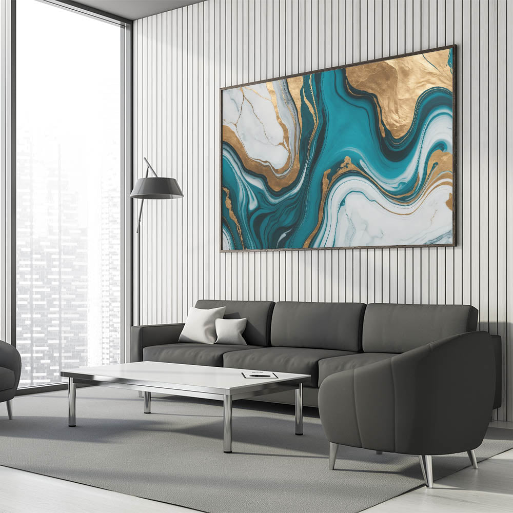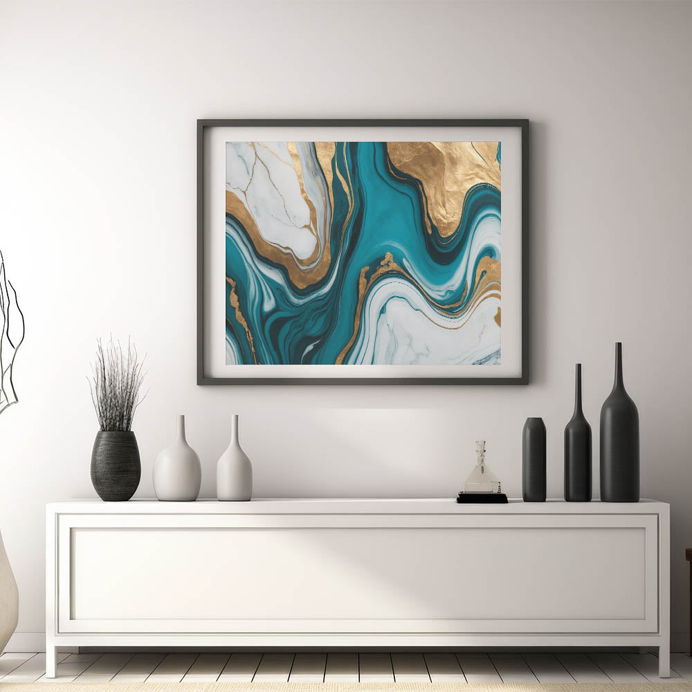 Immerse yourself in the elegance of this modern luxury abstract painting, featuring a breathtaking fusion of rich teal, gleaming gold, and crisp white. The fluid composition and sophisticated metallic accents create a striking contrast, making this exclusive abstract design for modern spaces a statement piece for high-end interiors.