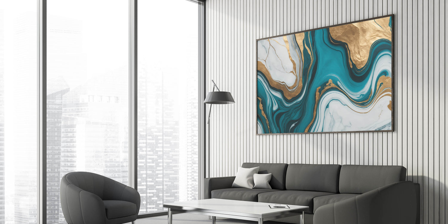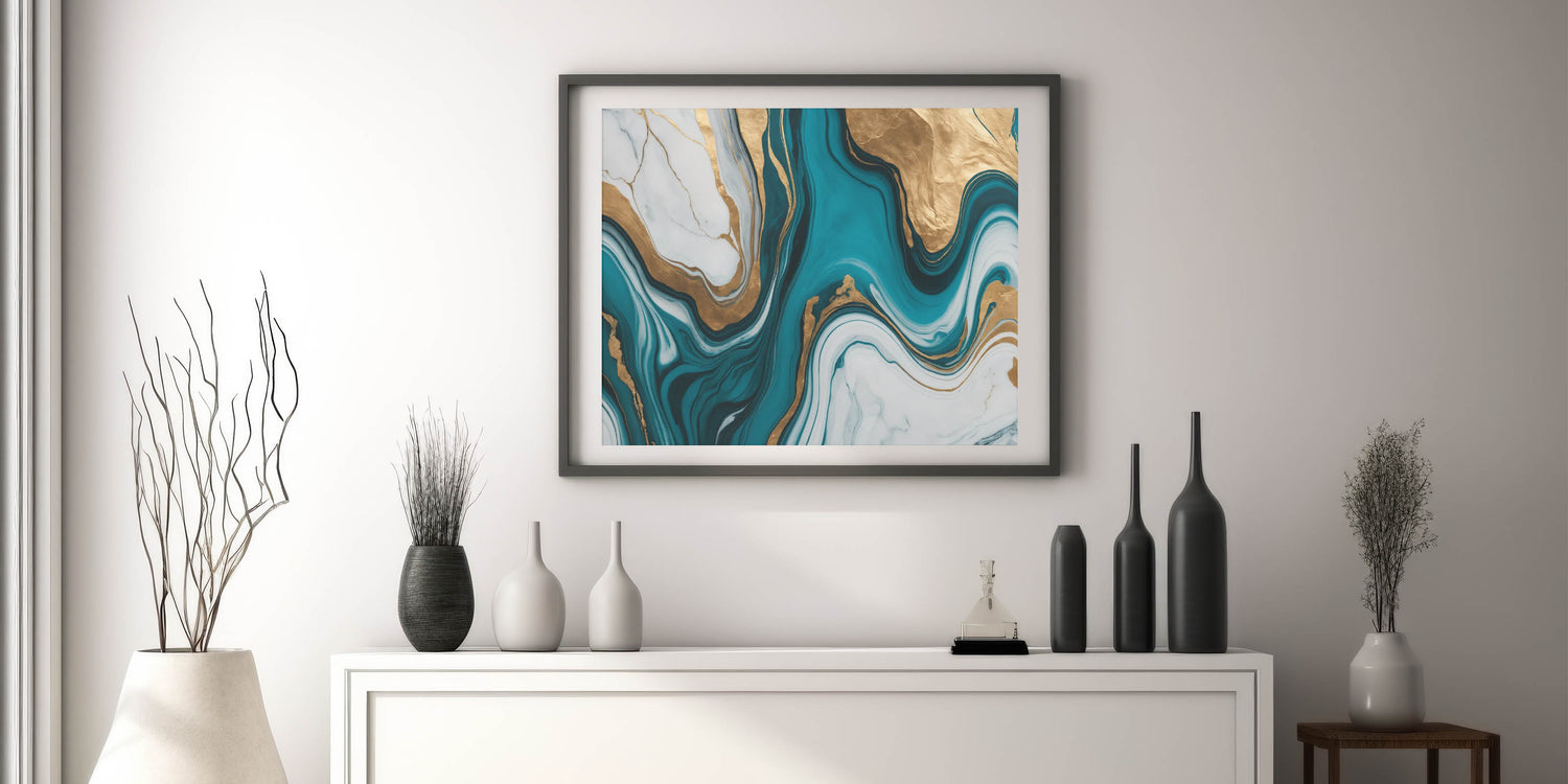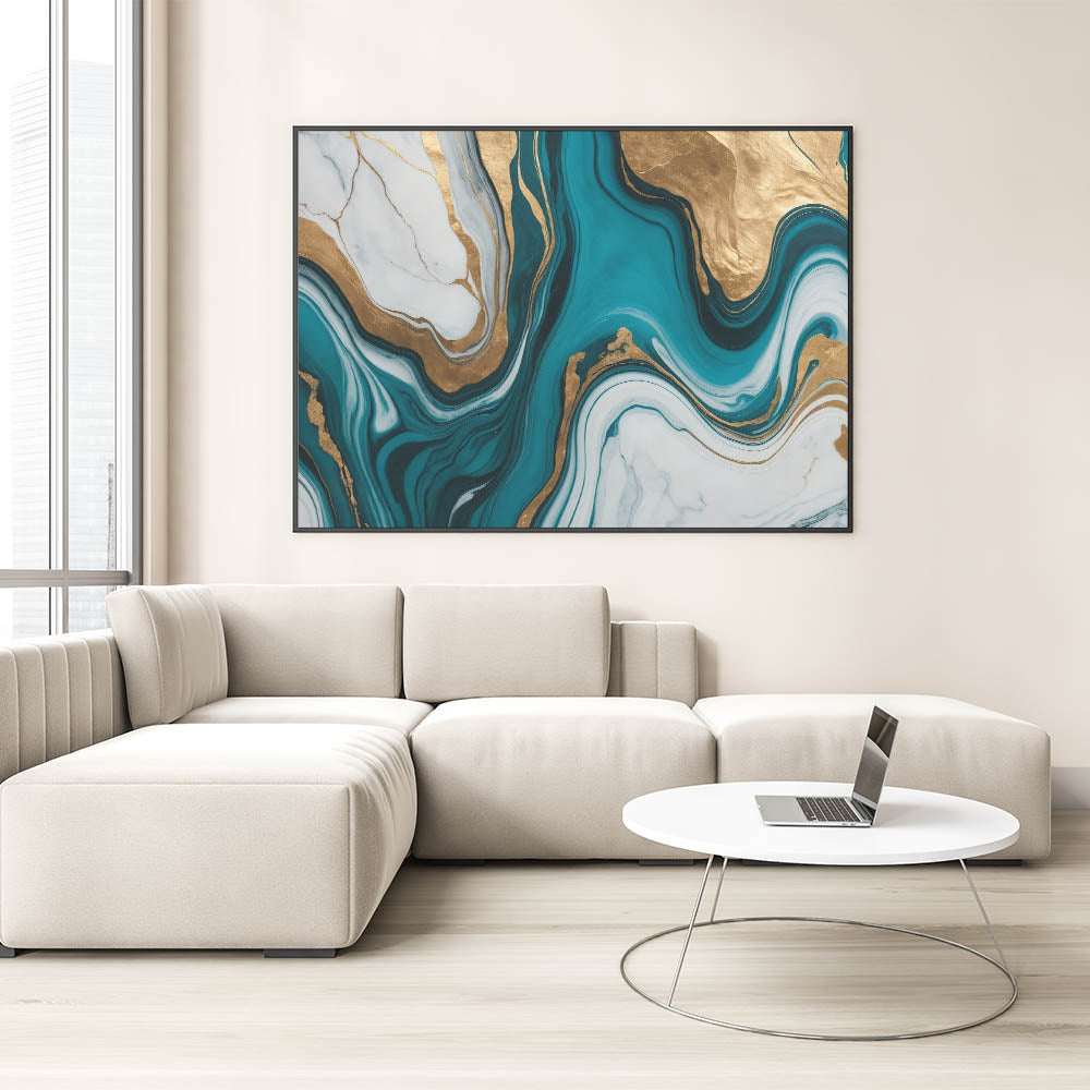 Immerse yourself in the elegance of this modern luxury abstract painting, featuring a breathtaking fusion of rich teal, gleaming gold, and crisp white. The fluid composition and sophisticated metallic accents create a striking contrast, making this exclusive abstract design for modern spaces a statement piece for high-end interiors.