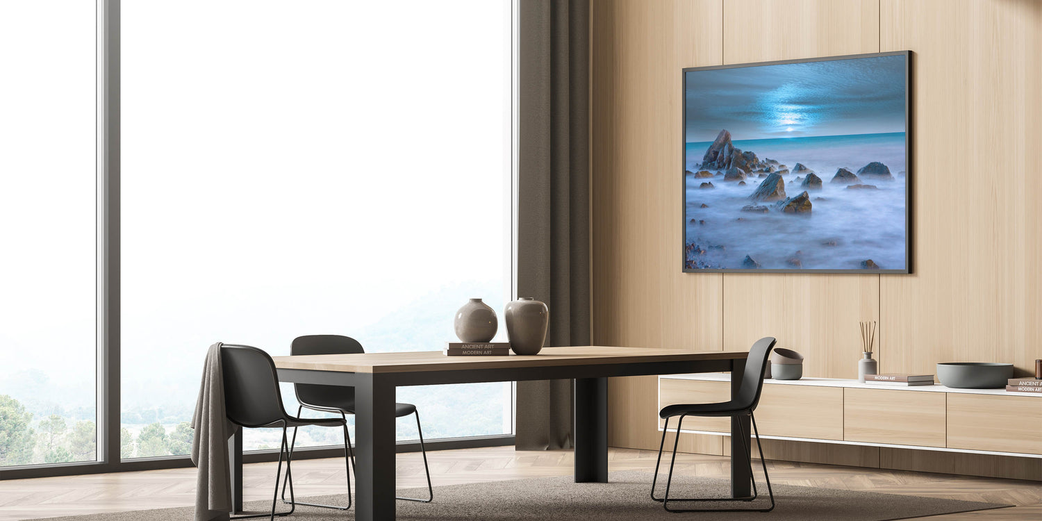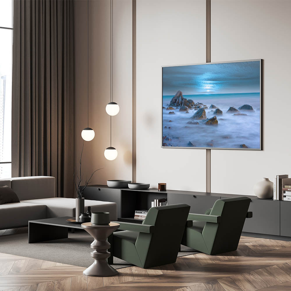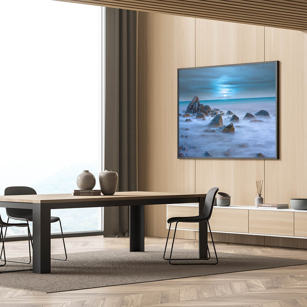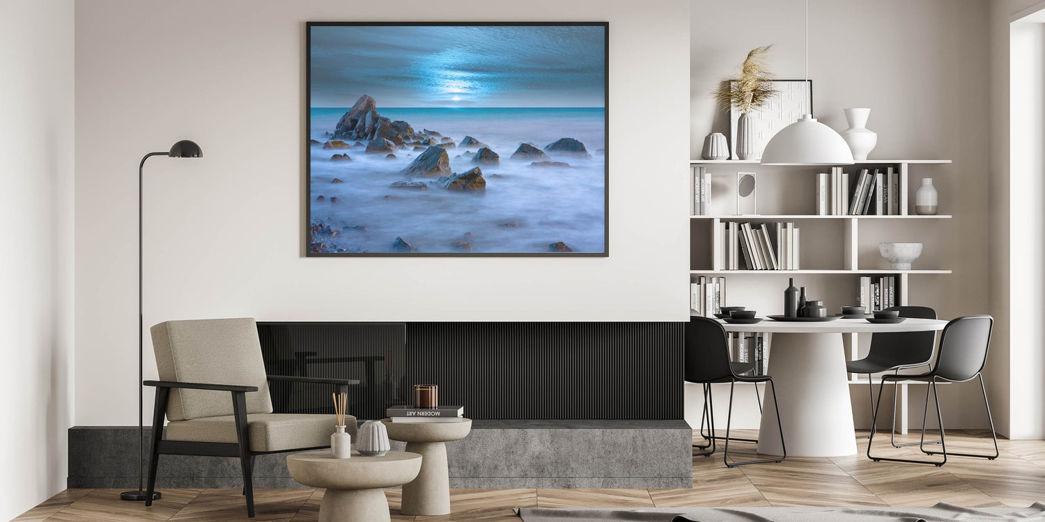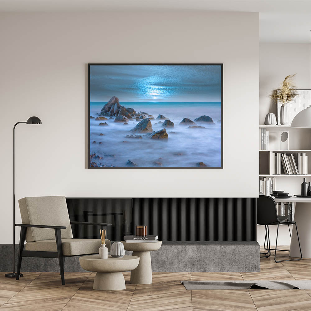 Elevate your home with calming landscape acrylic prints that exude tranquility and mystery. The blend of dark stones and soft ocean mist creates a mesmerizing visual experience. Let this serene coastal artwork bring harmony to your space.