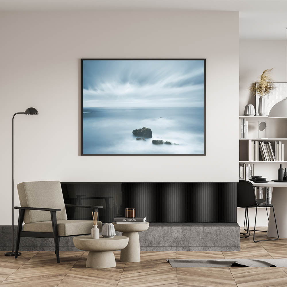 Immerse yourself in the peaceful beauty of serene landscape artwork, featuring misty ocean waves blending seamlessly into a soft, cloud-filled sky. This tranquil nature scene creates an atmosphere of calm and stillness, making it a perfect addition to modern and minimalist interiors.