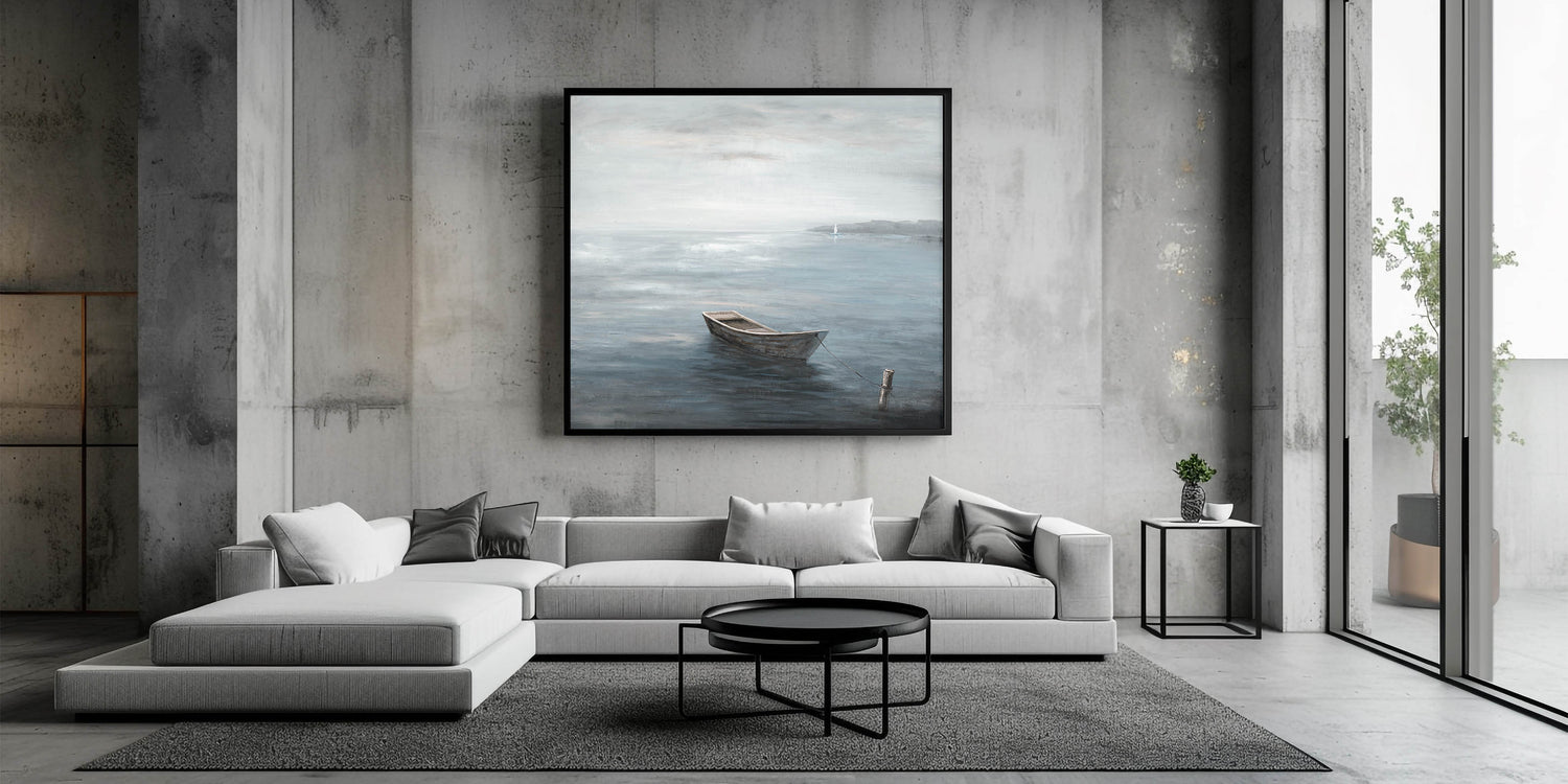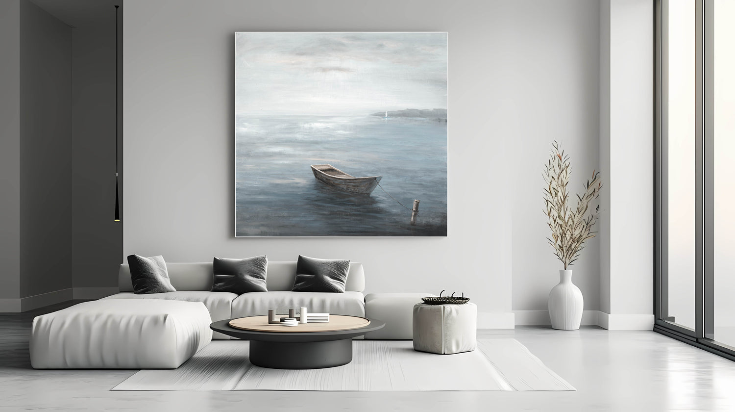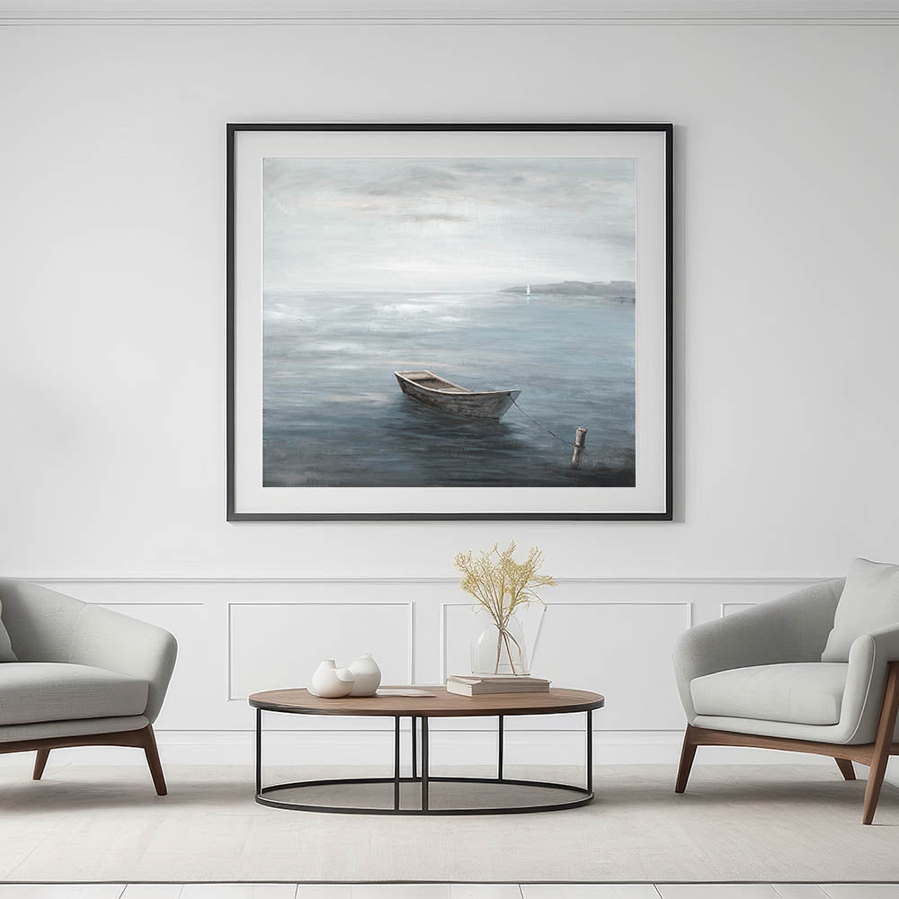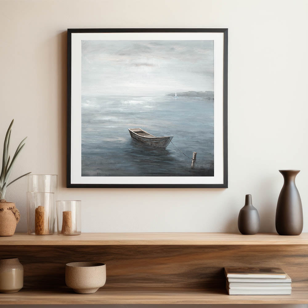 Immerse yourself in the peaceful charm of this tranquil nature canvas print, featuring a solitary wooden boat floating on calm waters. The soft hues of muted blue, gray, and light beige create a sense of stillness, making this artwork perfect for meditation spaces, living rooms, or offices. The distant sailboat and misty horizon add depth to the composition, evoking relaxing nature wall decor.