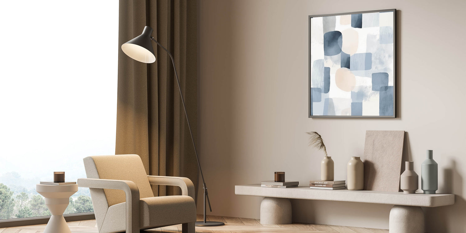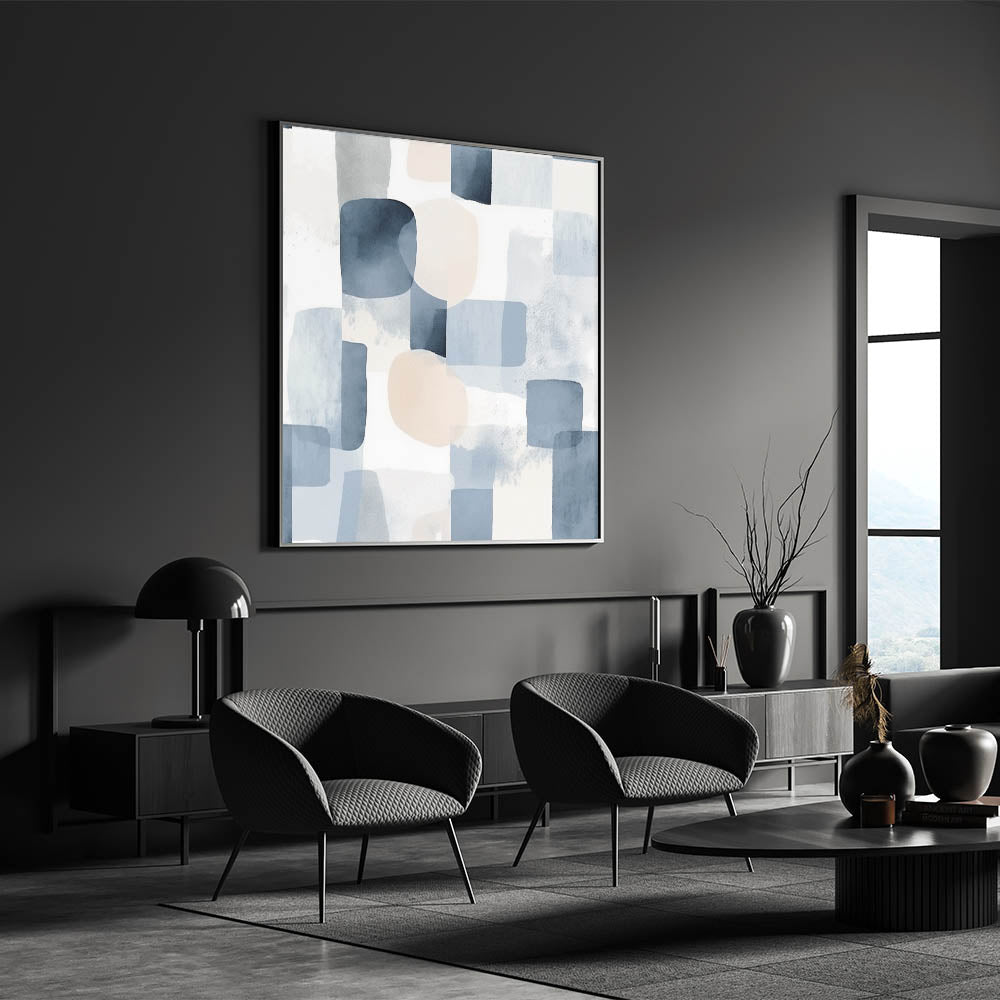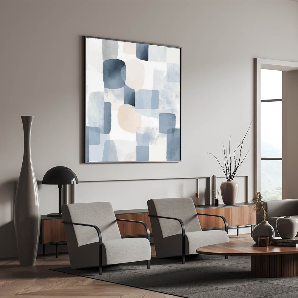 Bring a sense of calm and elegance to your space with this serene landscape artwork. Featuring an abstract blend of soft blues, light gray, and beige tones, this piece embodies tranquil nature scenes that enhance any interior with a peaceful countryside aesthetic. The watercolor-inspired textures and geometric forms create a soothing visual experience, perfect for modern or minimalist decor.