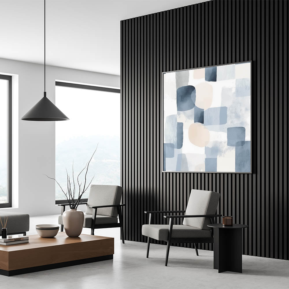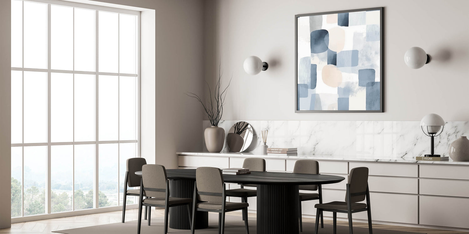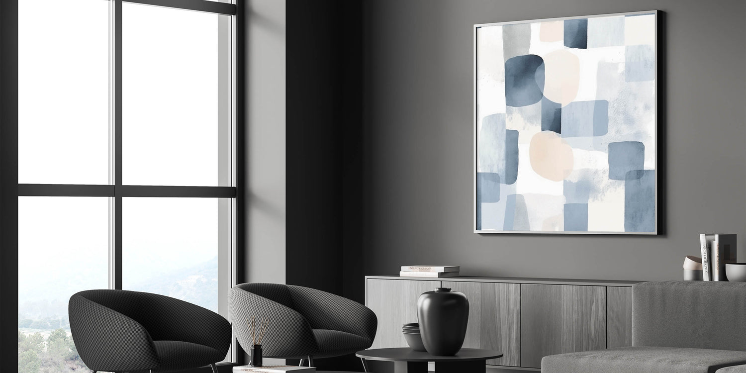 Bring a sense of calm and elegance to your space with this serene landscape artwork. Featuring an abstract blend of soft blues, light gray, and beige tones, this piece embodies tranquil nature scenes that enhance any interior with a peaceful countryside aesthetic. The watercolor-inspired textures and geometric forms create a soothing visual experience, perfect for modern or minimalist decor.