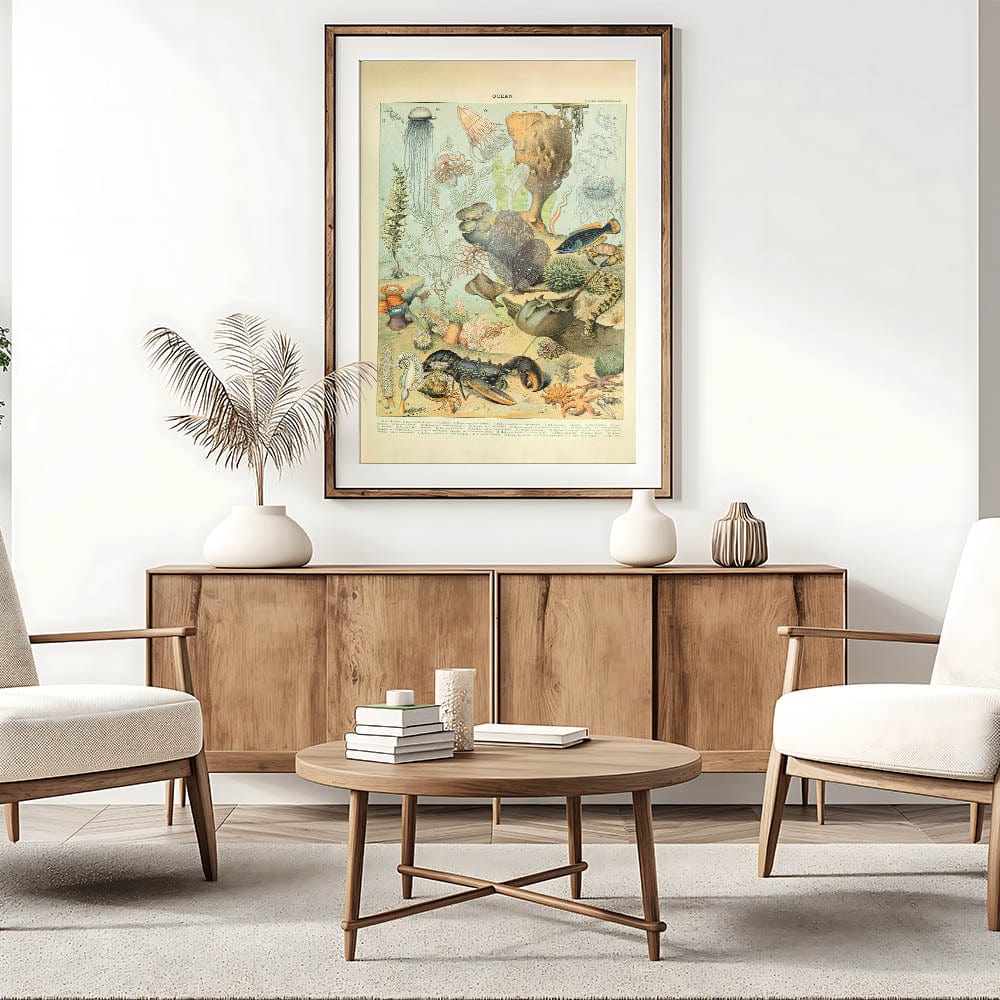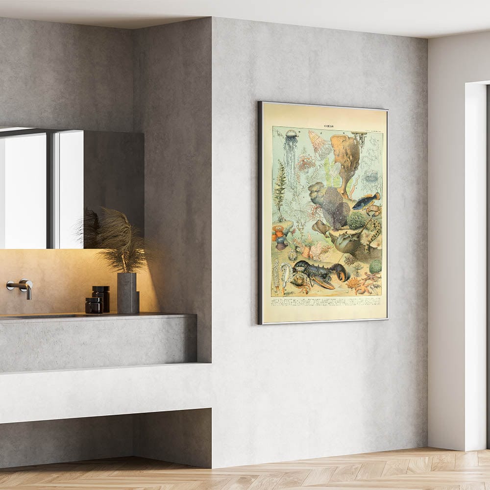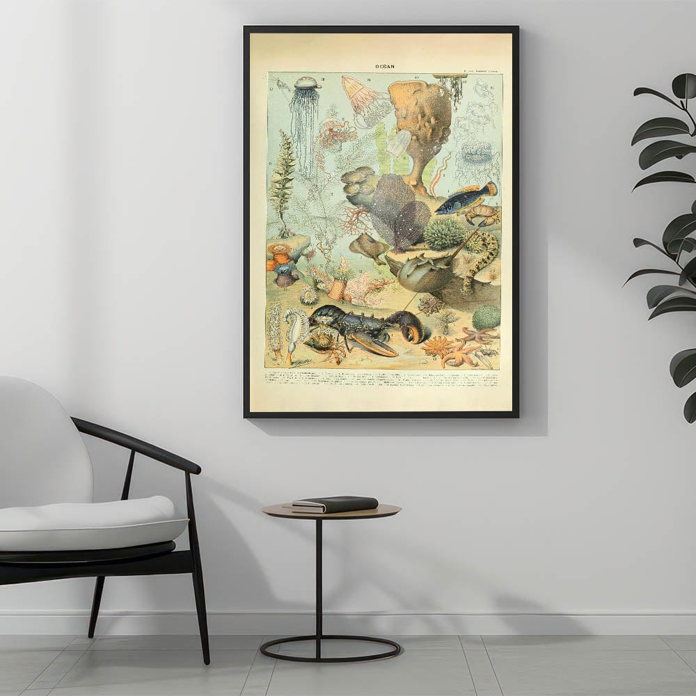 Immerse yourself in the beauty of the ocean with this stunning vintage animal art print, showcasing a scientific illustration of marine life. Featuring jellyfish, coral reefs, fish, crustaceans, sea plants, and other ocean wonders, this handcrafted animal illustration captures the vibrant diversity of underwater ecosystems. Perfect for ocean lovers, marine biologists, and art collectors, this high-quality art print is a timeless addition to any space.