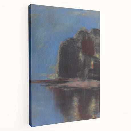 • Abstract wall art featuring vibrant strokes in hues of blue, orange, and yellow, displayed on a stretched canvas with a side view showcasing its depth and texture. Perfect for modern decor.