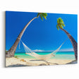 Escape to a tranquil paradise with our "Serene Hammock Beach Art" from the Fiji Scenery by Region collection. This artwork captures the idyllic scene of a hammock suspended between two palms on a deserted Fiji beach, with the crystal-clear waters as a perfect backdrop.