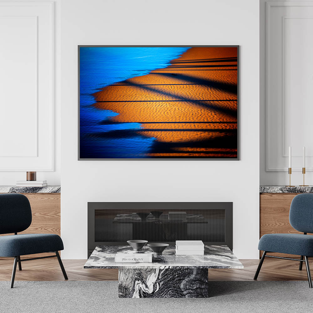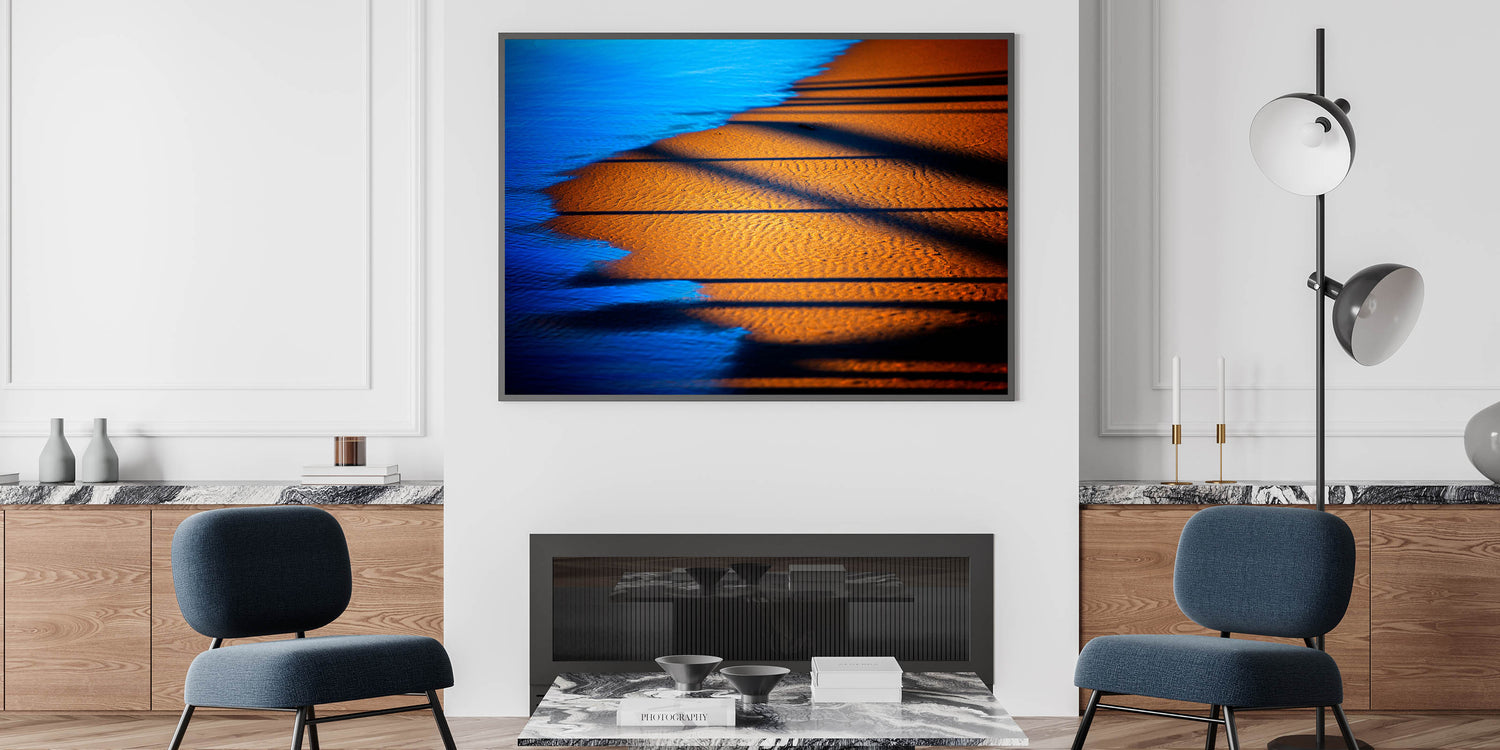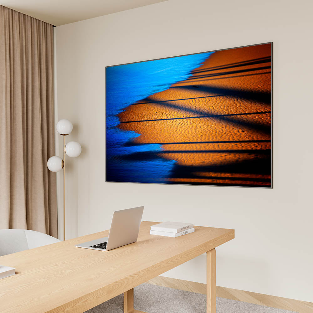 Bring a sense of warmth and sophistication to your workspace with this modern office art, featuring a stunning interplay of deep blue water and golden sand. The contrasting tones and dynamic shadows create a visually captivating corporate wall decor piece, ideal for enhancing executive offices, boardrooms, and creative spaces. This business wall art offers a serene yet powerful aesthetic, making it a perfect choice for those seeking a balance of energy and tranquility in their work environment.