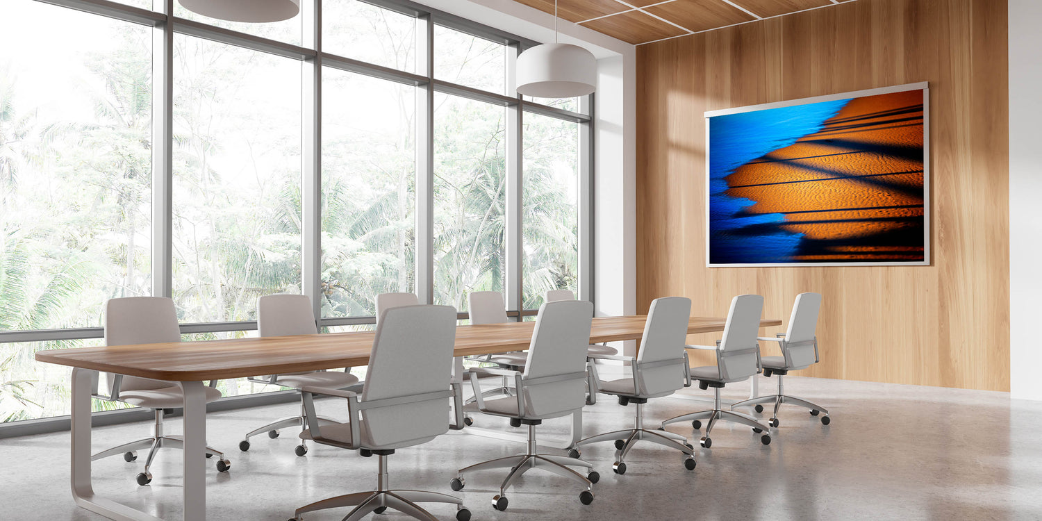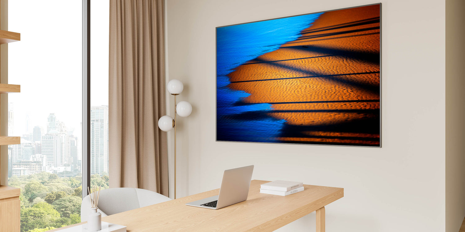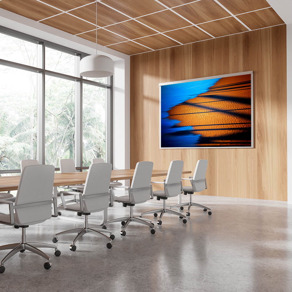 Bring a sense of warmth and sophistication to your workspace with this modern office art, featuring a stunning interplay of deep blue water and golden sand. The contrasting tones and dynamic shadows create a visually captivating corporate wall decor piece, ideal for enhancing executive offices, boardrooms, and creative spaces. This business wall art offers a serene yet powerful aesthetic, making it a perfect choice for those seeking a balance of energy and tranquility in their work environment.