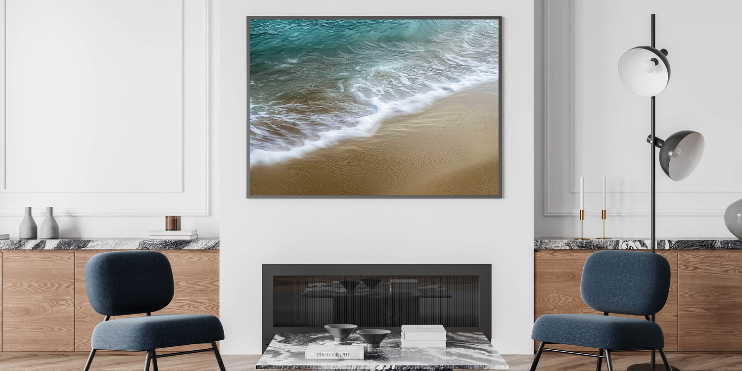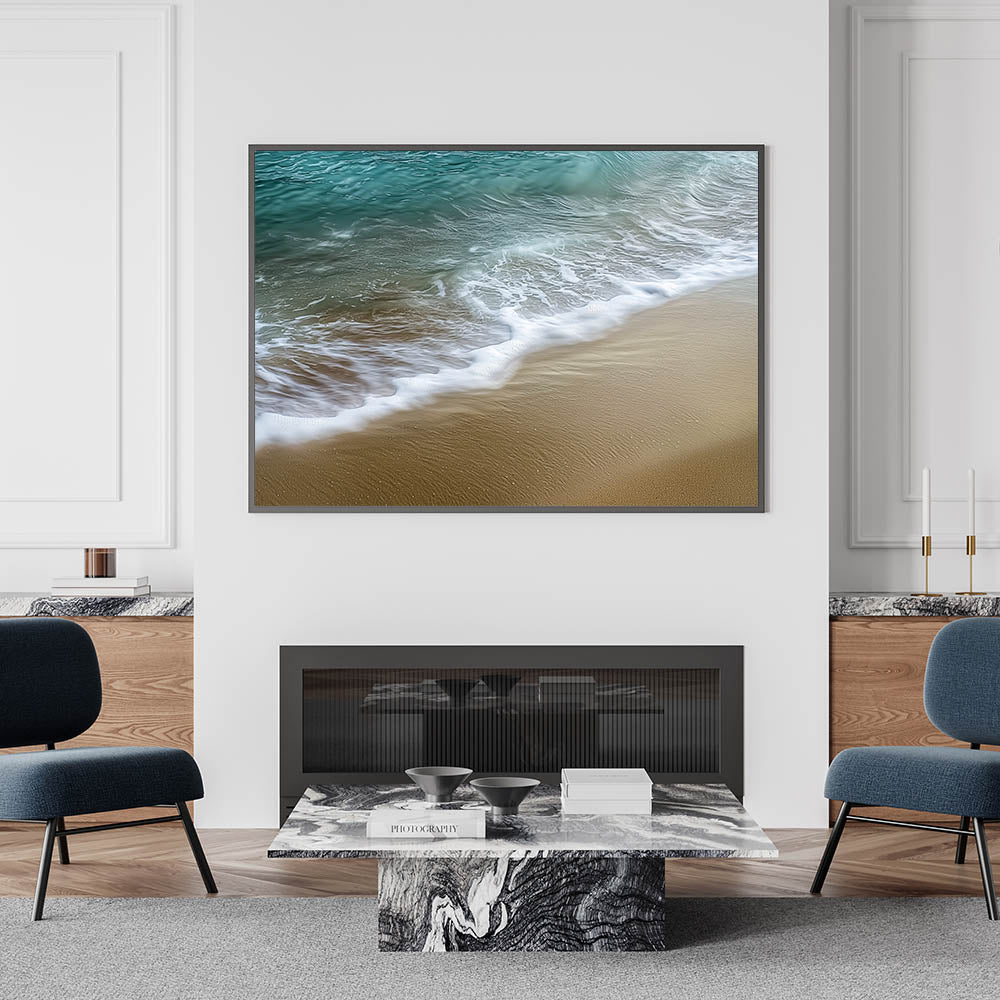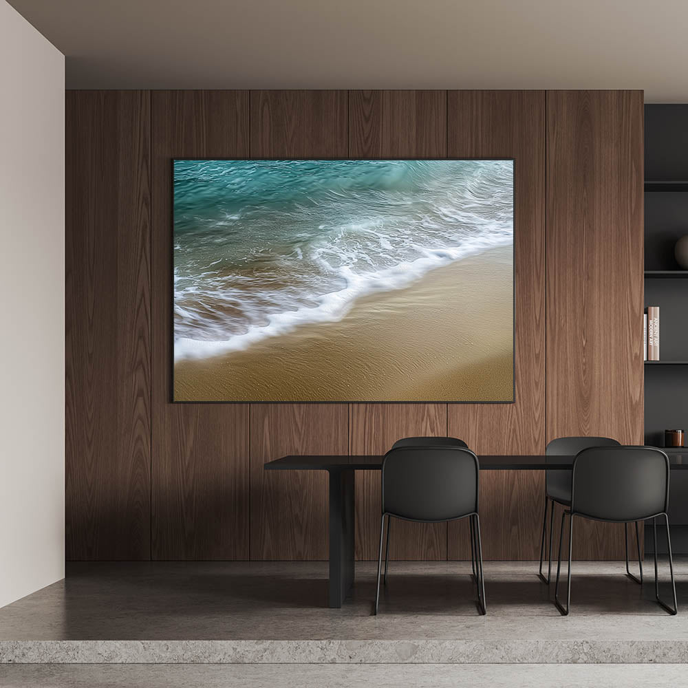 Transform your workspace with this stunning modern office art, featuring a serene beach scene where gentle waves meet the sandy shore. The flowing textures of turquoise waters, white sea foam, and golden sand create a refreshing and tranquil atmosphere, making it an ideal corporate wall decor piece. This artwork brings a sense of calm and focus, perfect for professional settings that value relaxation and creativity.
