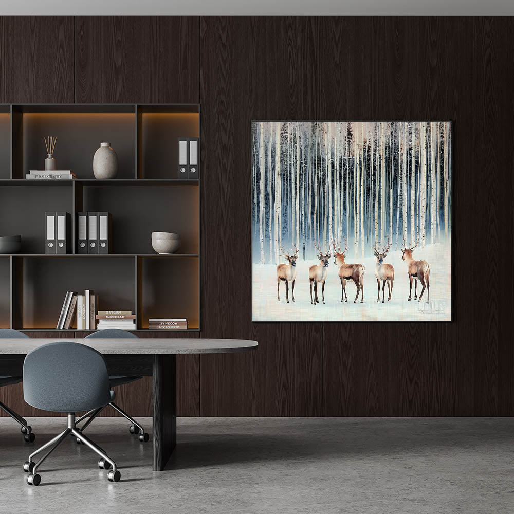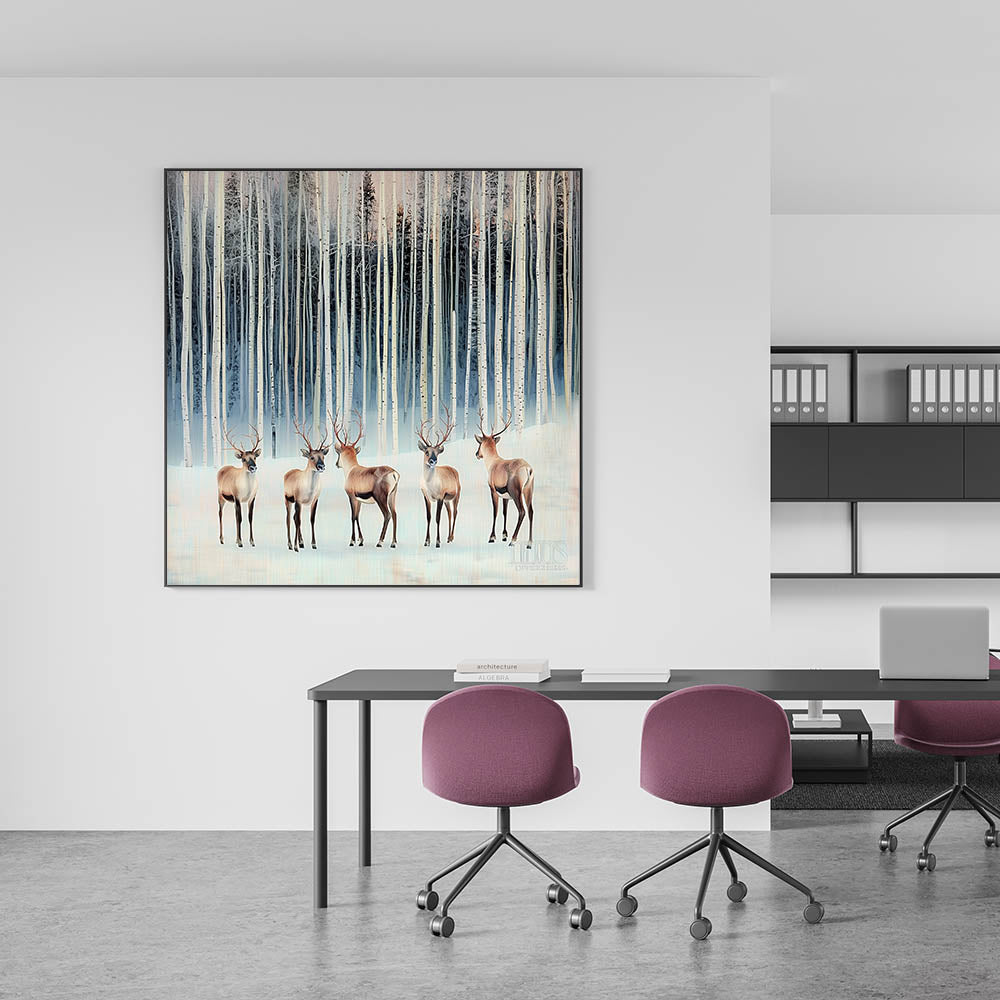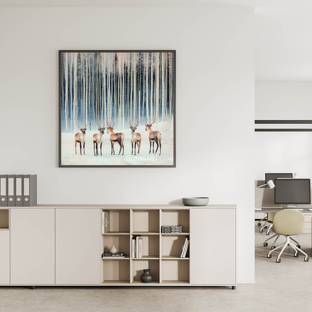 Transform your workspace with this corporate wall decor, featuring a breathtaking winter forest scene with majestic deer among snowy birch trees. The cool tones of light blue, beige, and soft white create a serene and elegant atmosphere, making it a perfect addition to modern office art collections. This artwork’s realistic yet stylized design adds a calming and sophisticated touch, ideal for business wall art in executive offices, meeting rooms, and professional workspaces.
