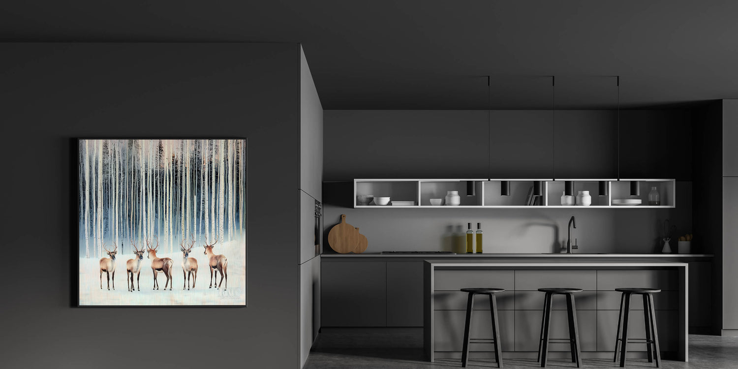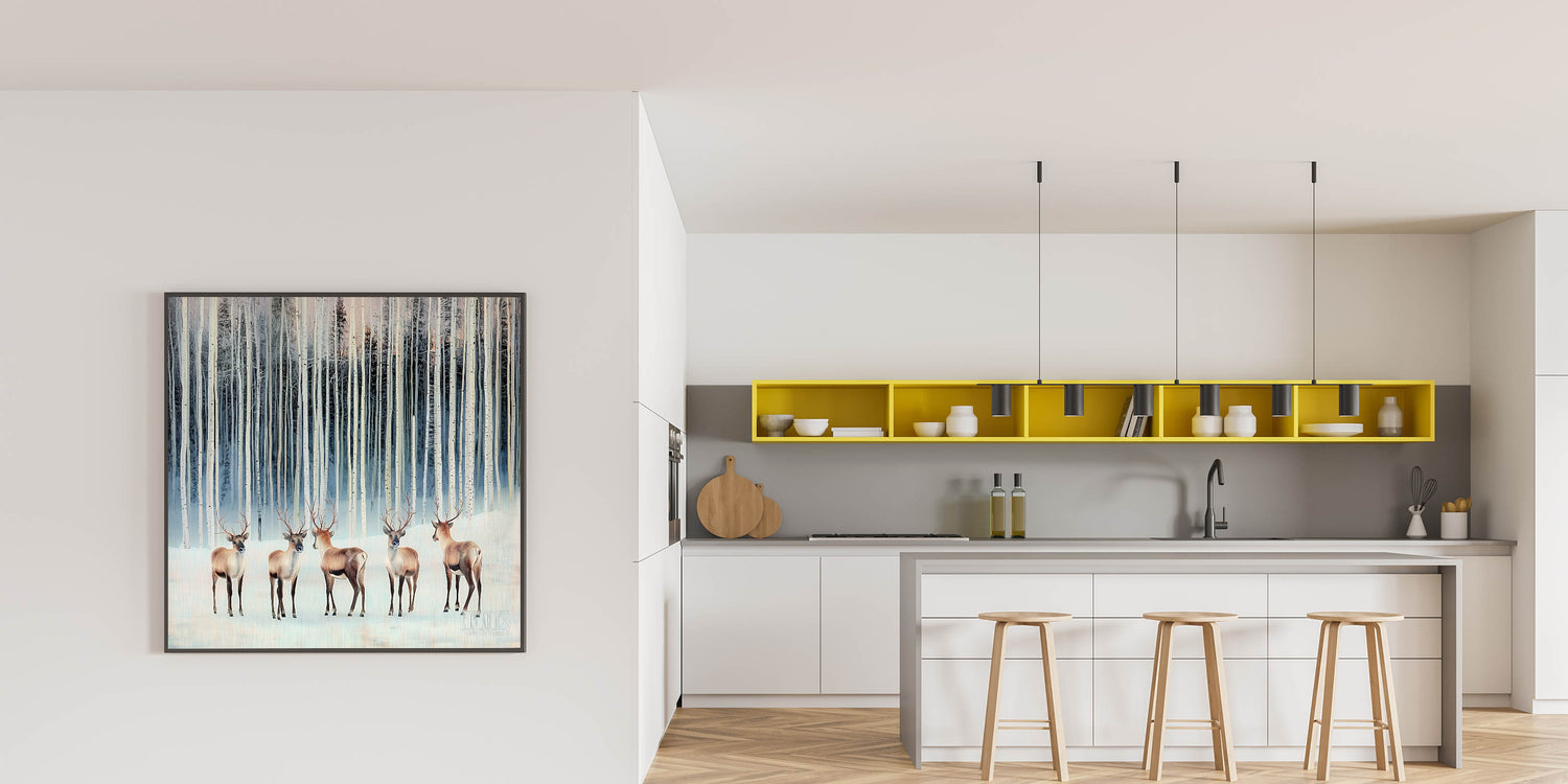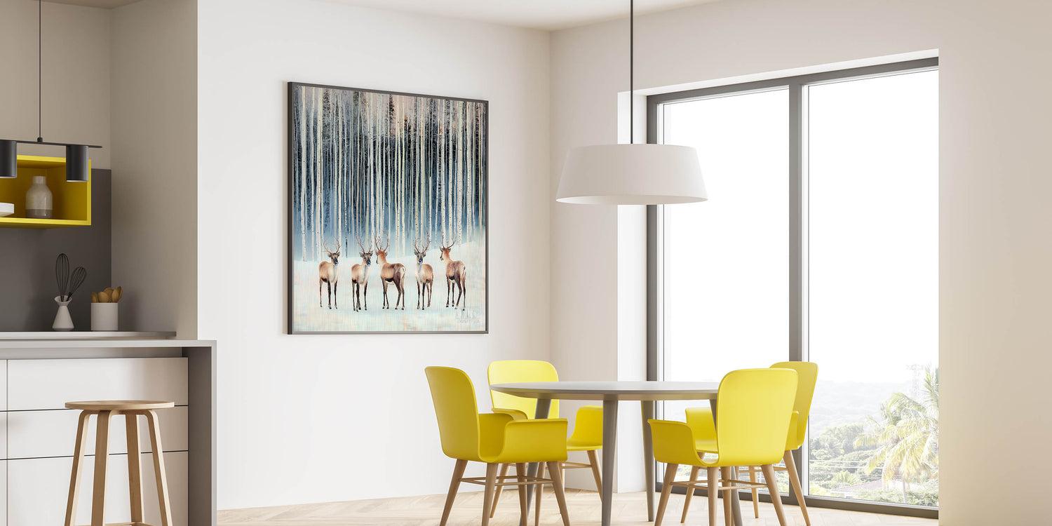 Transform your workspace with this corporate wall decor, featuring a breathtaking winter forest scene with majestic deer among snowy birch trees. The cool tones of light blue, beige, and soft white create a serene and elegant atmosphere, making it a perfect addition to modern office art collections. This artwork’s realistic yet stylized design adds a calming and sophisticated touch, ideal for business wall art in executive offices, meeting rooms, and professional workspaces.