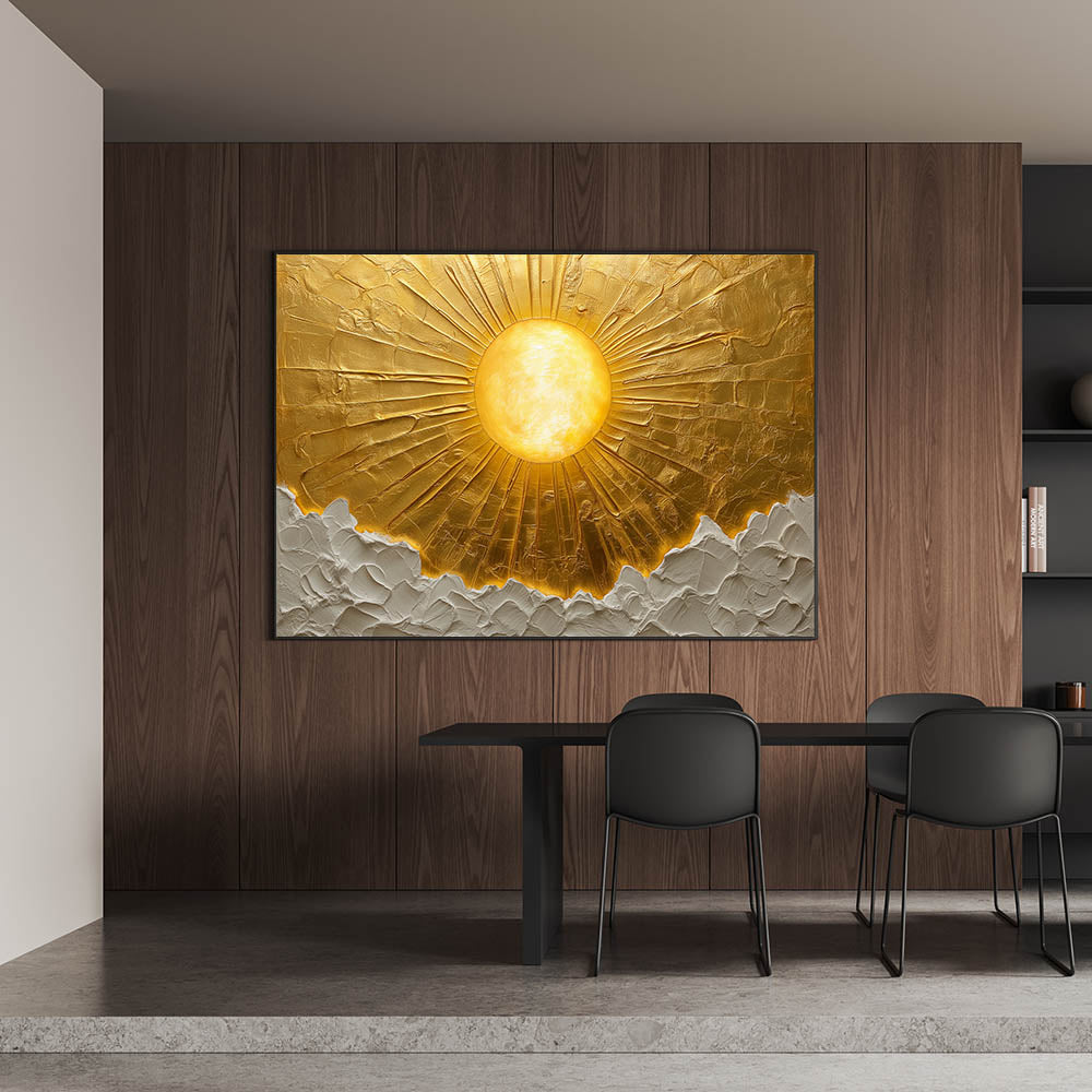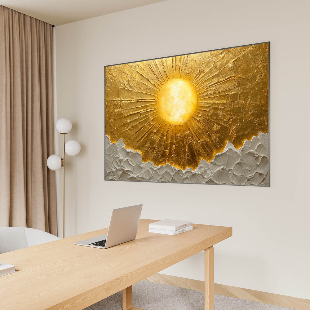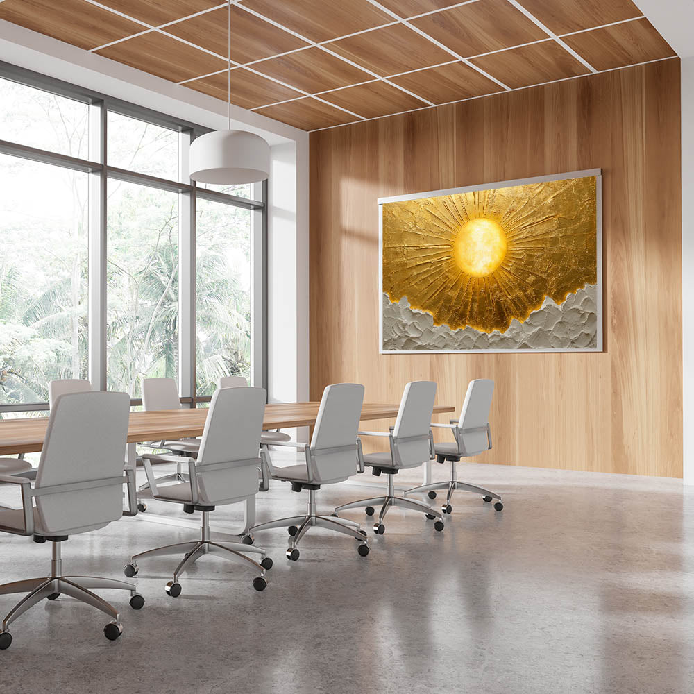 Bring warmth and sophistication to your workspace with this golden sun office wall art, a stunning piece that radiates positivity and inspiration. Designed to enhance modern office interiors, this professional office art features an exquisite textured surface that adds depth and dimension. The luxurious gold and white tones create a bold yet refined statement, making it a perfect fit for corporate wall décor and executive spaces.
