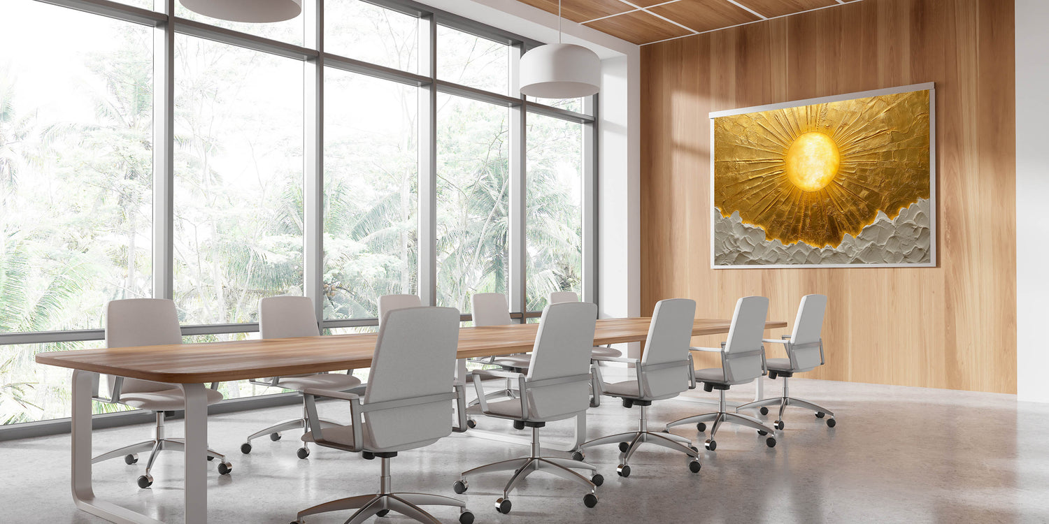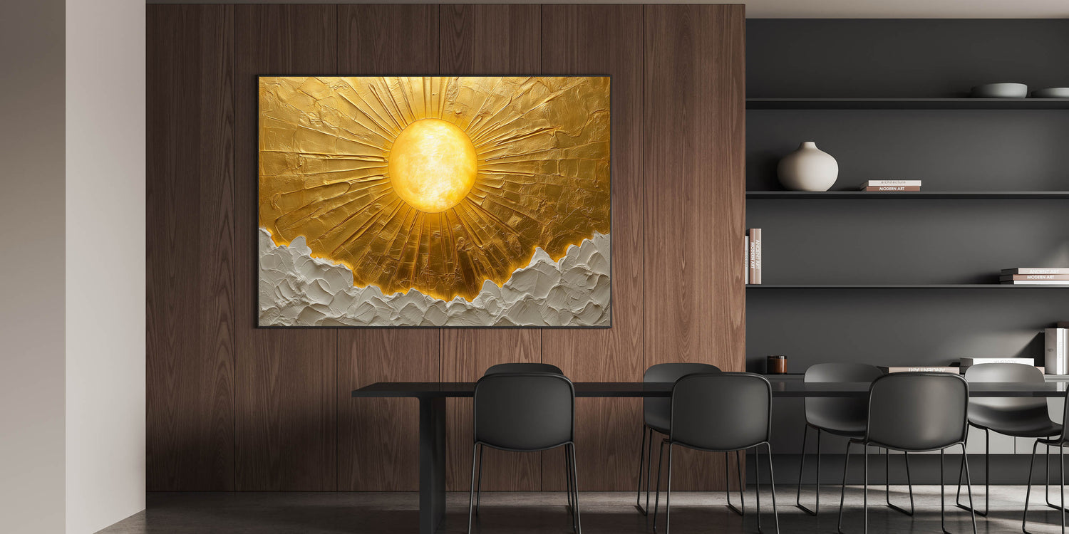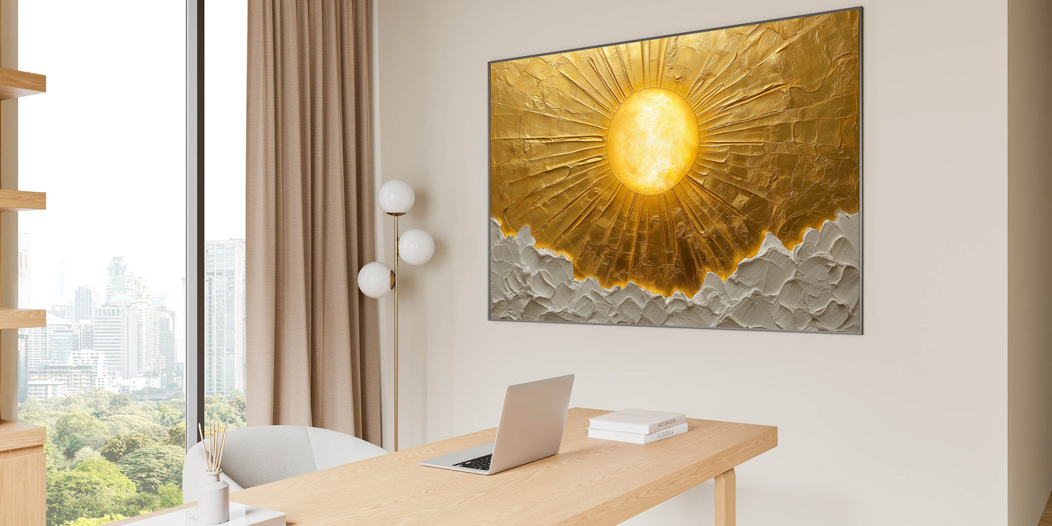 Bring warmth and sophistication to your workspace with this golden sun office wall art, a stunning piece that radiates positivity and inspiration. Designed to enhance modern office interiors, this professional office art features an exquisite textured surface that adds depth and dimension. The luxurious gold and white tones create a bold yet refined statement, making it a perfect fit for corporate wall décor and executive spaces.