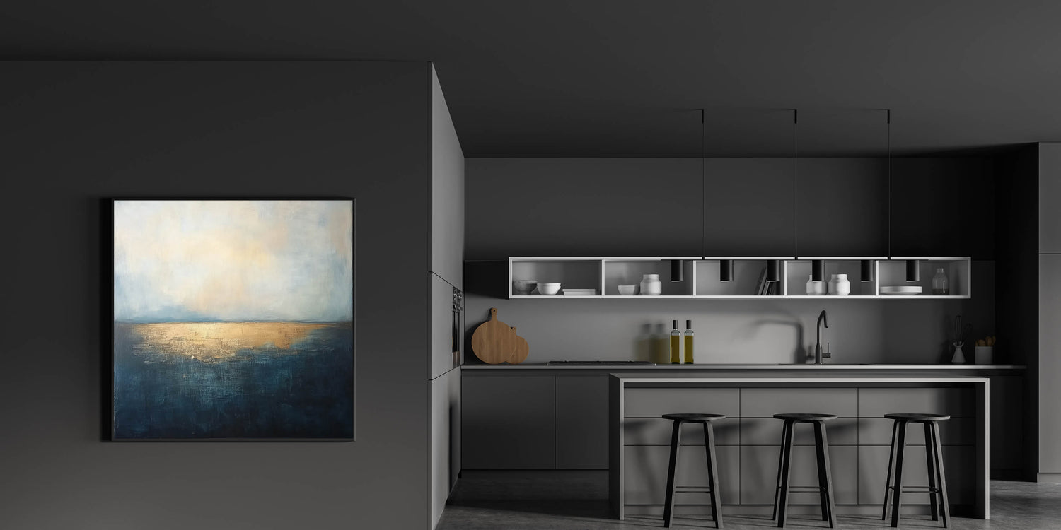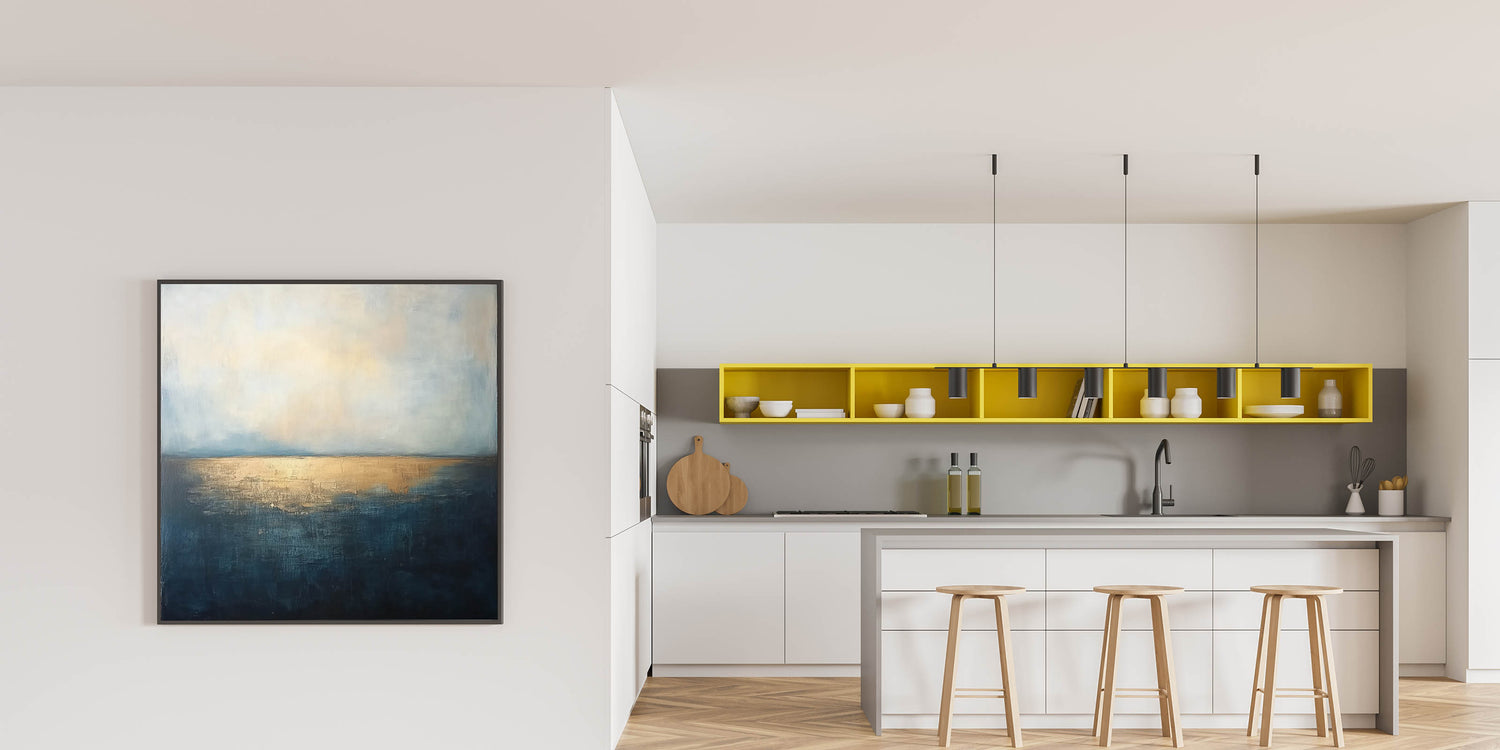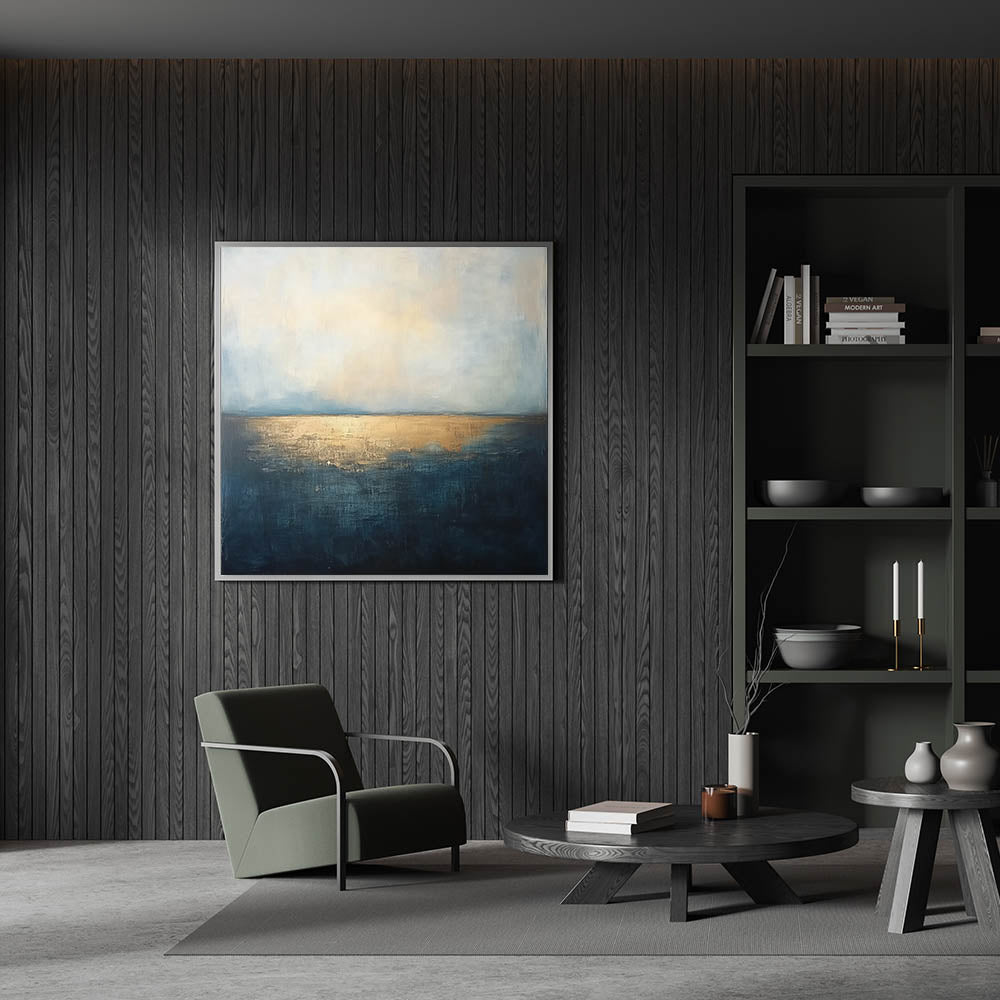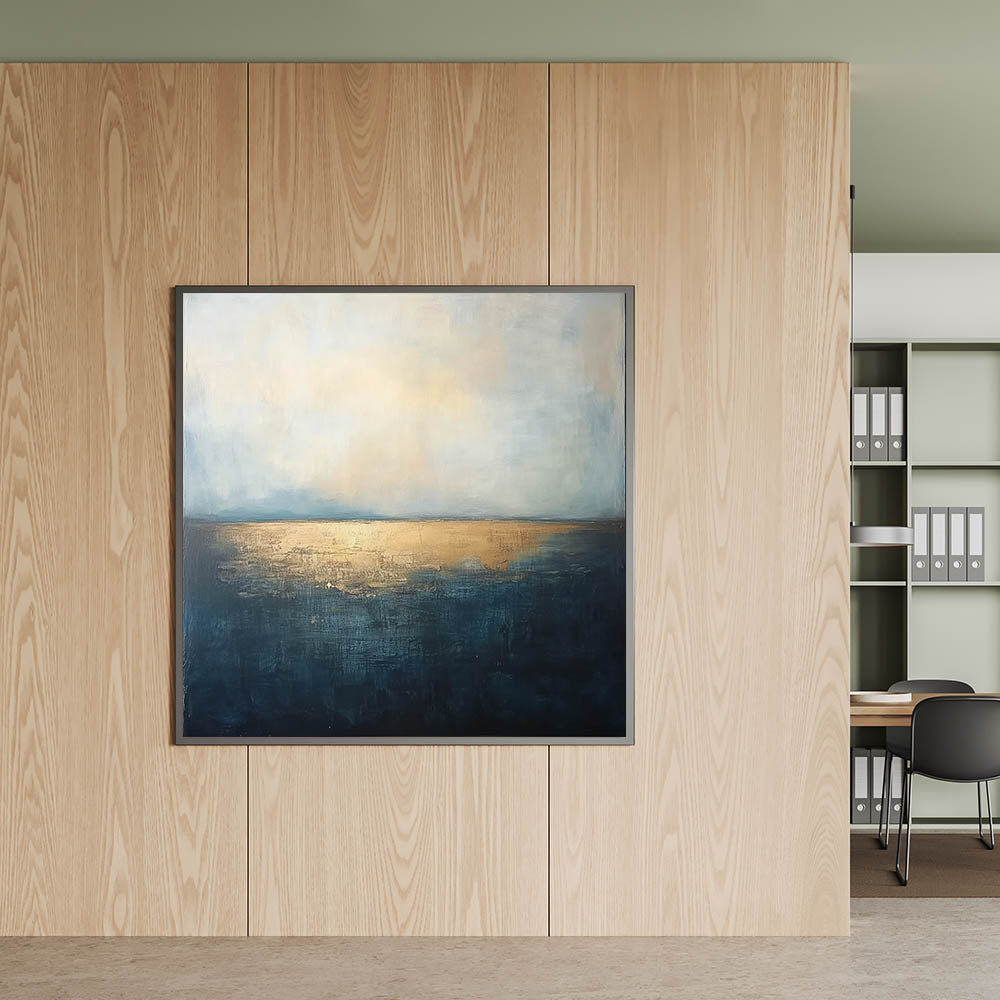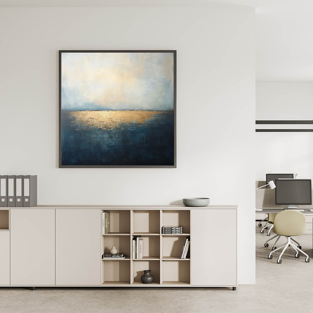 • Sophisticated Color Palette – The combination of deep blue and metallic gold adds a touch of luxury to office interior art.
