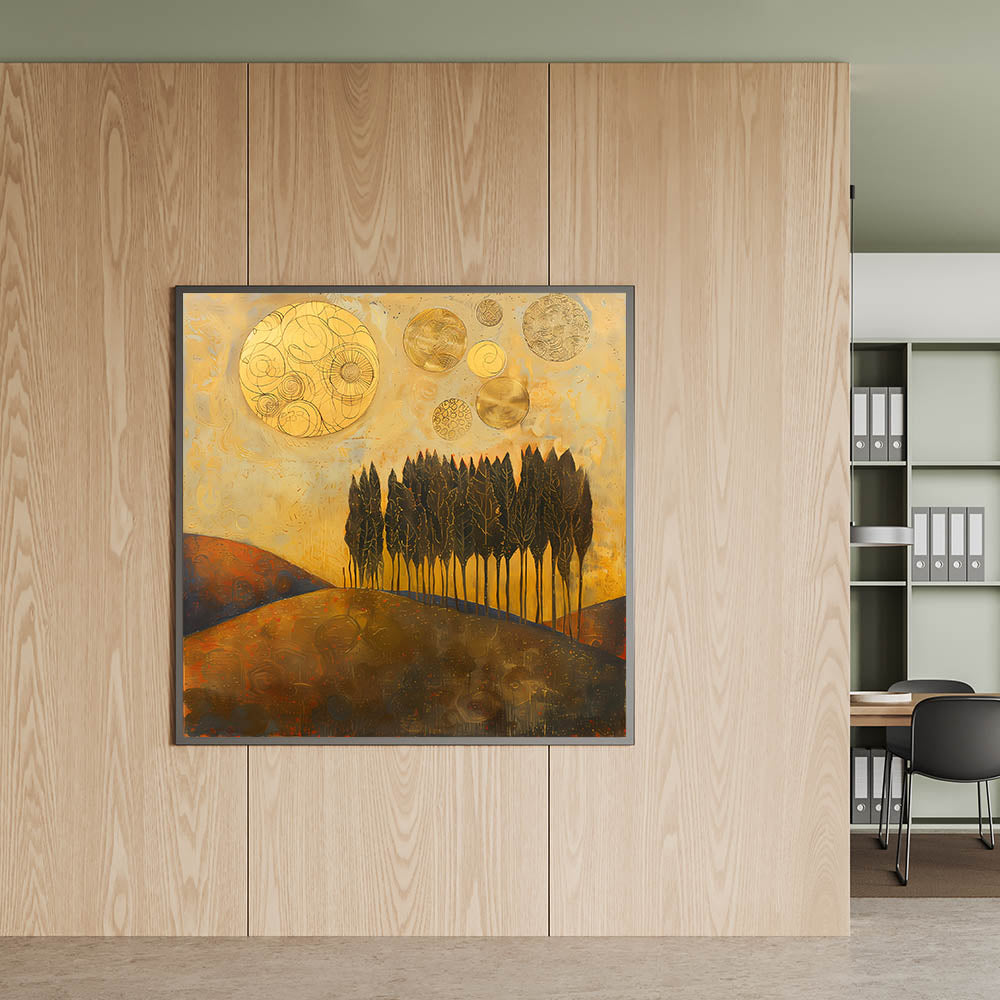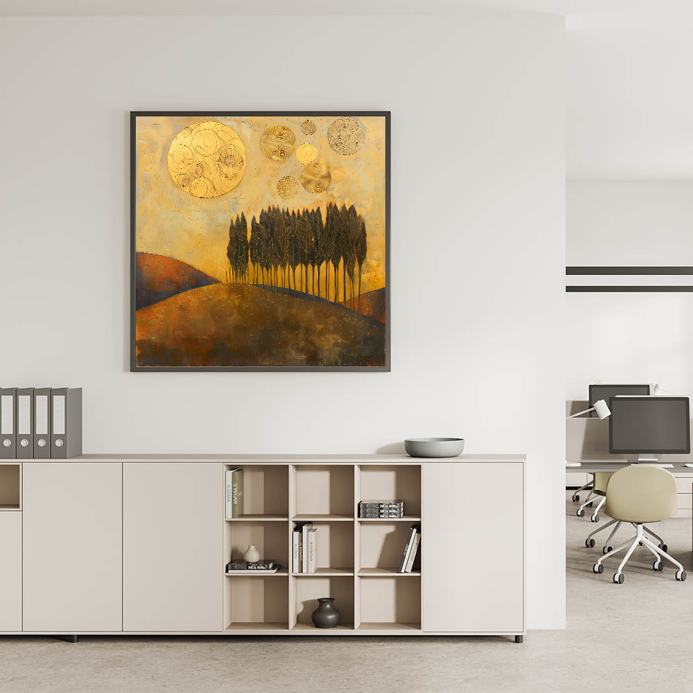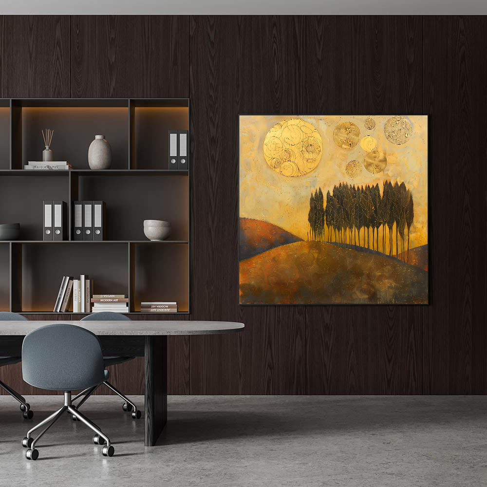 Elevate your workspace with this Office Wall Art, featuring a mesmerizing golden-hued abstract landscape with tall, elegant trees and celestial elements. The rich gold, deep brown, and warm earth tones create a bold and sophisticated aesthetic, making this piece a perfect choice for Modern Office Art. This dynamic composition is ideal for Corporate Wall Decor, bringing warmth, depth, and inspiration to any professional setting.