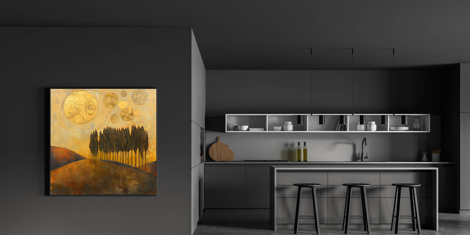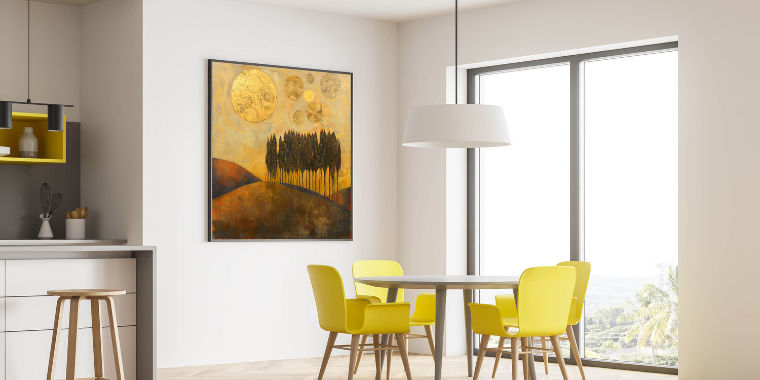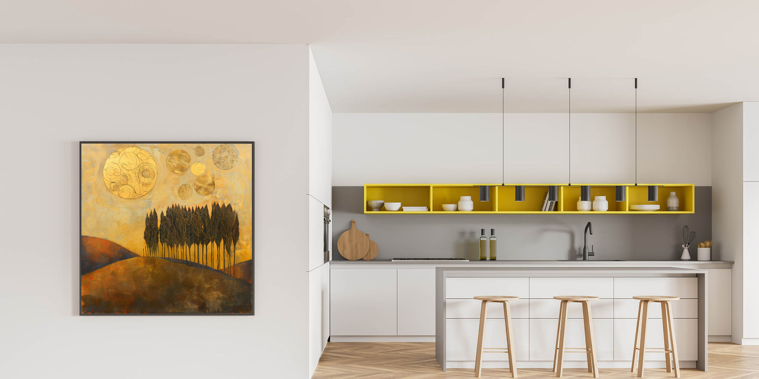 Elevate your workspace with this Office Wall Art, featuring a mesmerizing golden-hued abstract landscape with tall, elegant trees and celestial elements. The rich gold, deep brown, and warm earth tones create a bold and sophisticated aesthetic, making this piece a perfect choice for Modern Office Art. This dynamic composition is ideal for Corporate Wall Decor, bringing warmth, depth, and inspiration to any professional setting.