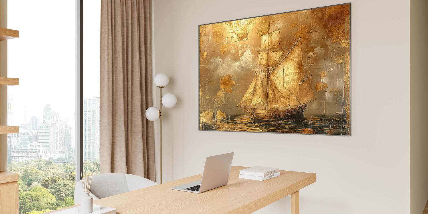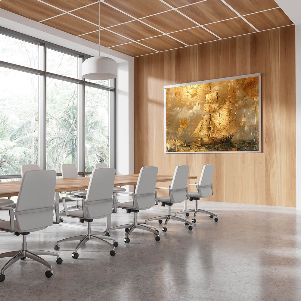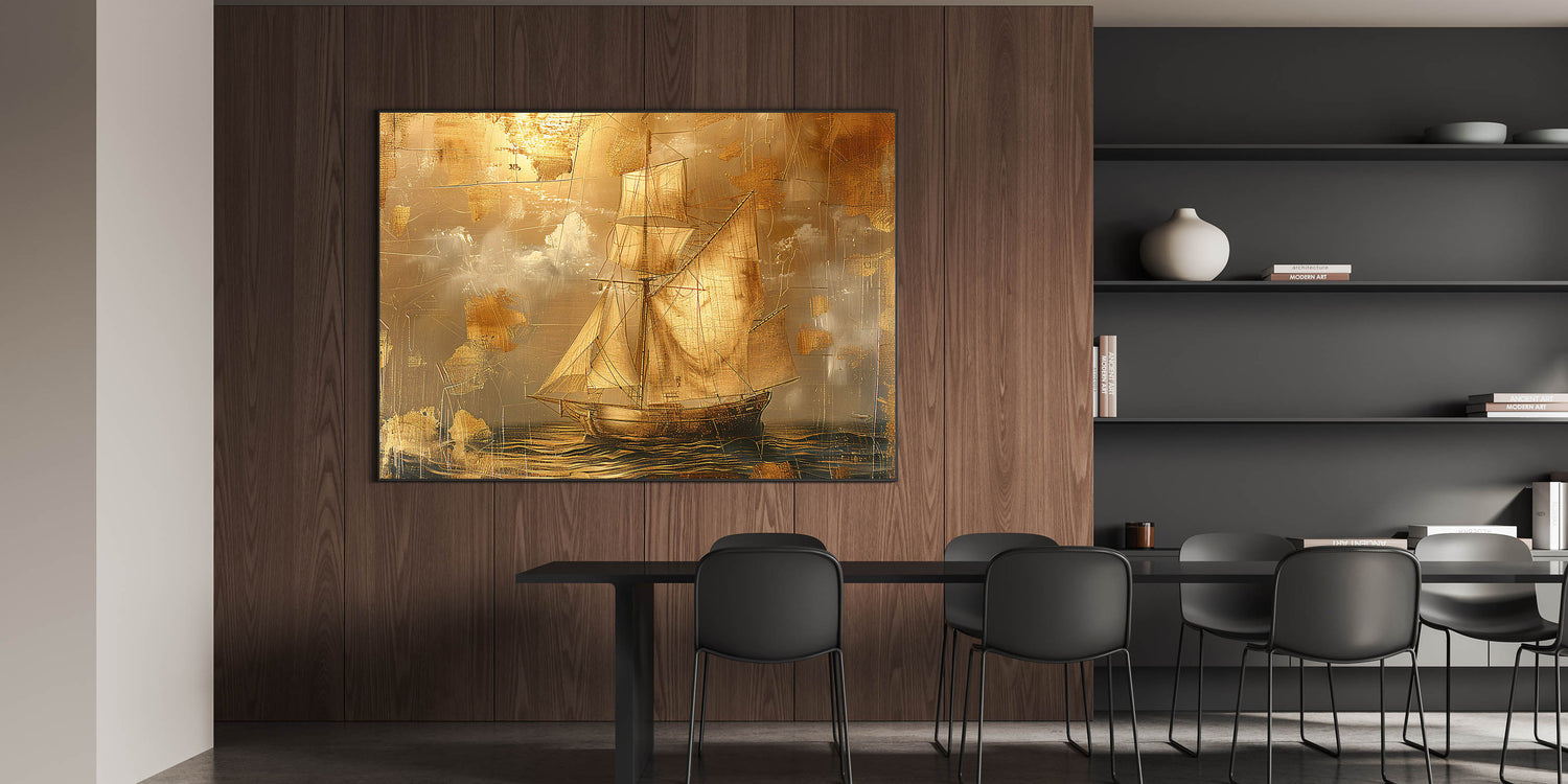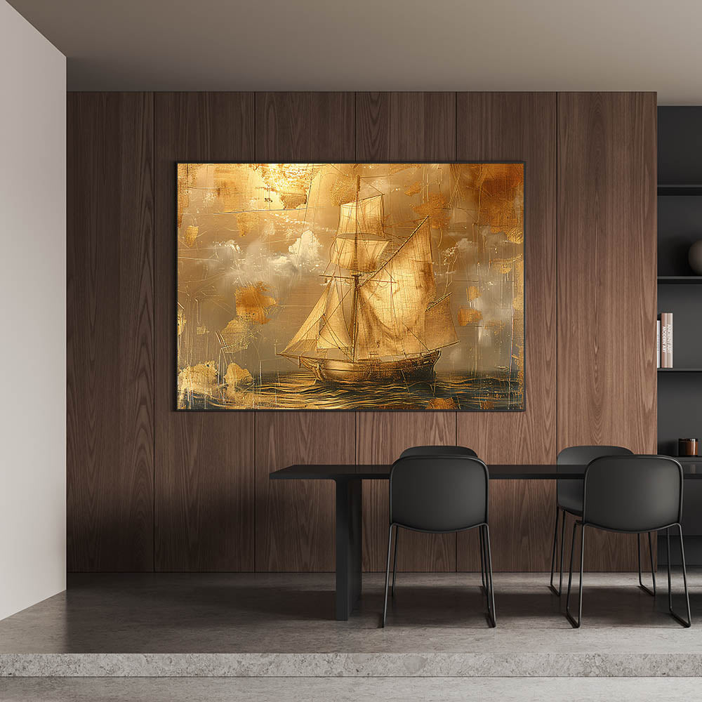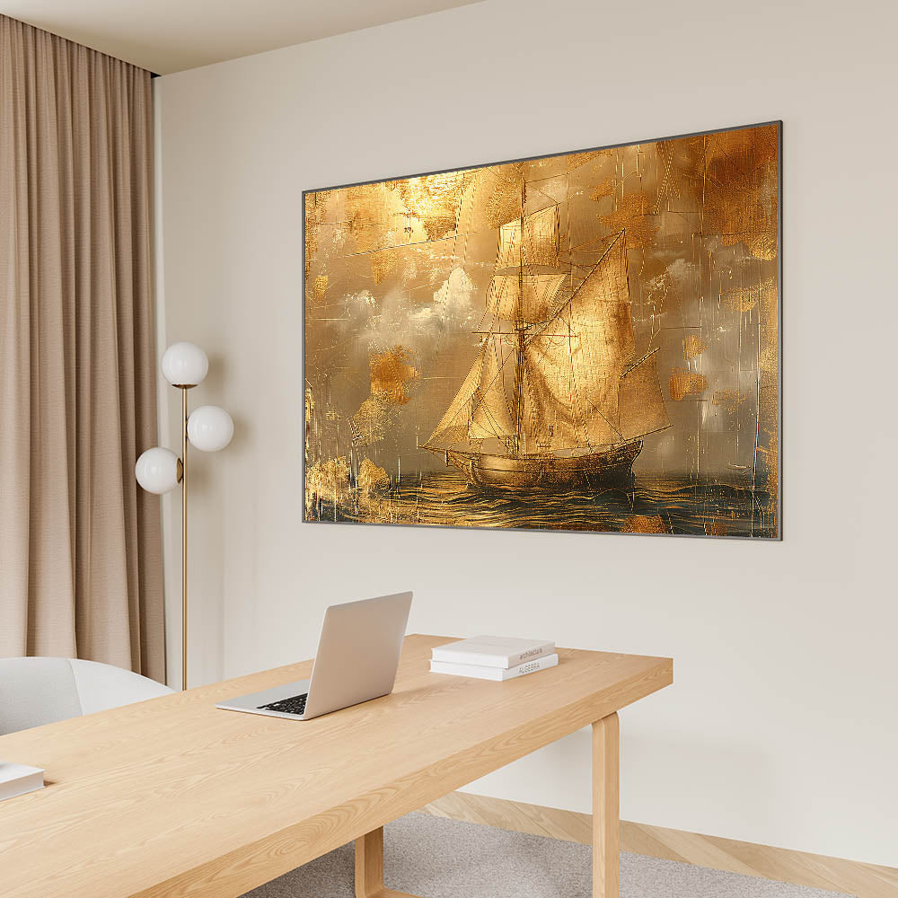 Bring timeless elegance to your workspace with this Office Wall Art, featuring a luxurious golden sailboat set against a textured metallic backdrop. The intricate details of the ship’s sails and shimmering golden hues create a striking visual statement, making it an ideal choice for Modern Office Art. This sophisticated artwork enhances Corporate Wall Decor, adding a touch of refinement and grandeur to executive offices, meeting rooms, or reception areas.