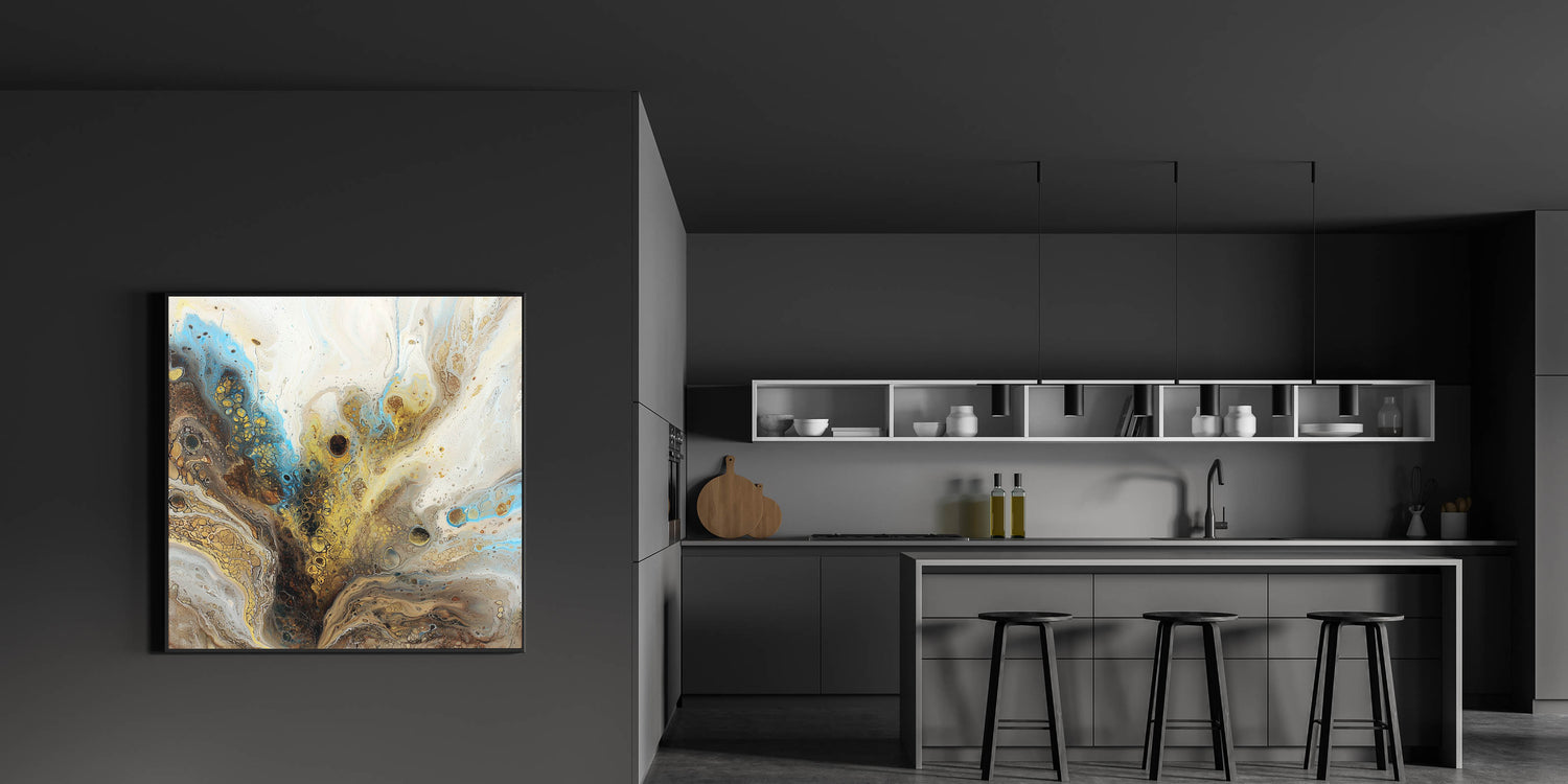 Enhance your workspace with this elegant Office Wall Art, featuring a luxurious blend of gold, beige, brown, and blue in a fluid, abstract composition. The organic patterns and rich textures create a sophisticated ambiance, making it an ideal choice for Contemporary Office Decor in corporate settings, executive offices, and modern workspaces.